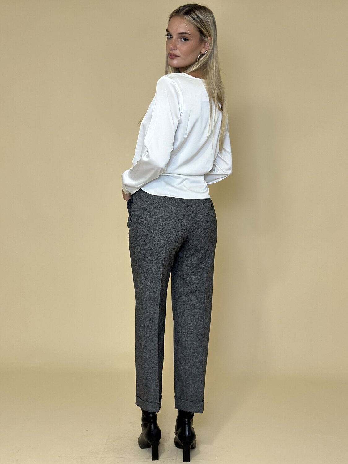 Pantalone Mafalda Grisaglia Grigio di 1978 Italy. Pantalone skinny a vita alta con piega stirata frontale e orlo sul fondo. Tasche a filo alla francese. Passanti per cintura in vita. Chiusura con cerniera e gancio nascosto. Disponibile in grigio.