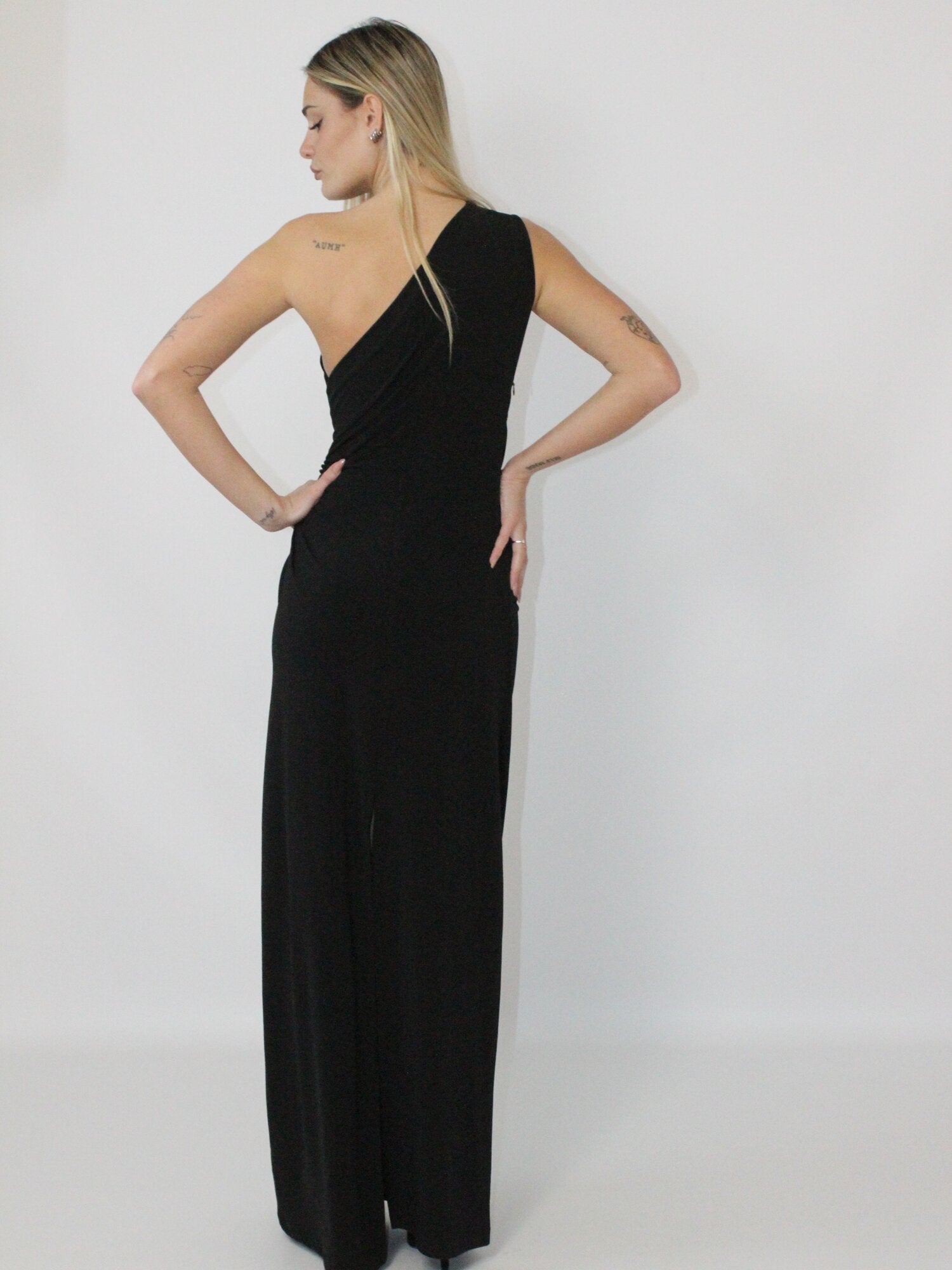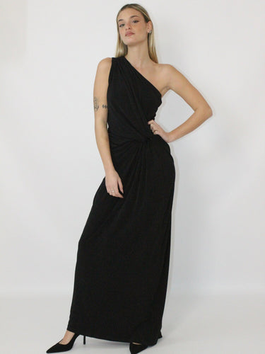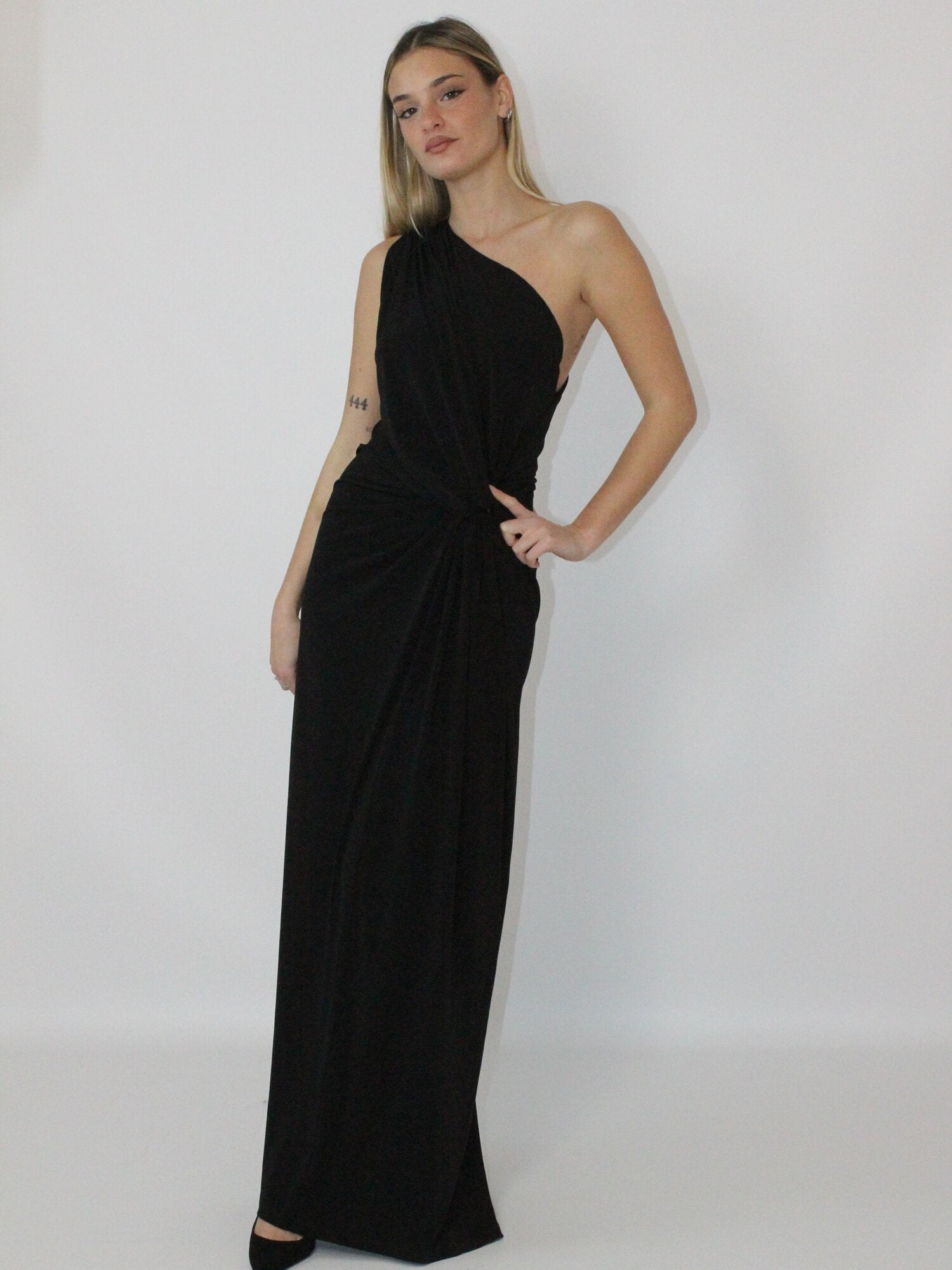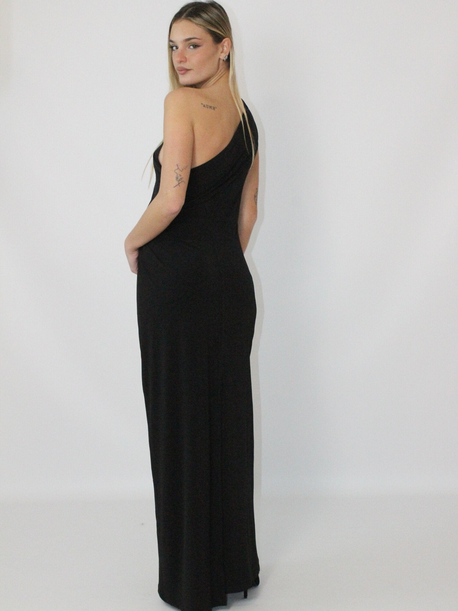 Abito Lungo Monospalla Nero di Eleh. Il vestito presenta un audace taglio monospalla che lascia scoperta una spalla, mentre l'altra è valorizzata da un ampio spallaccio drappeggiato. Il punto focale del design è l'intreccio laterale all'altezza della vita, da cui si dipartono delle pieghe fluide che attraversano il corpo in diagonale. Questo dettaglio non solo decora il capo, ma aiuta a segnare la figura in modo armonioso. La gonna scende dritta fino a terra, mantenendo una linea pulita e scivolata che slancia la figura. La parte posteriore mantiene l'asimmetria del fronte, con un taglio pulito che enfatizza la verticalità dell'abito. Disponibile in nero.