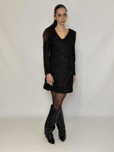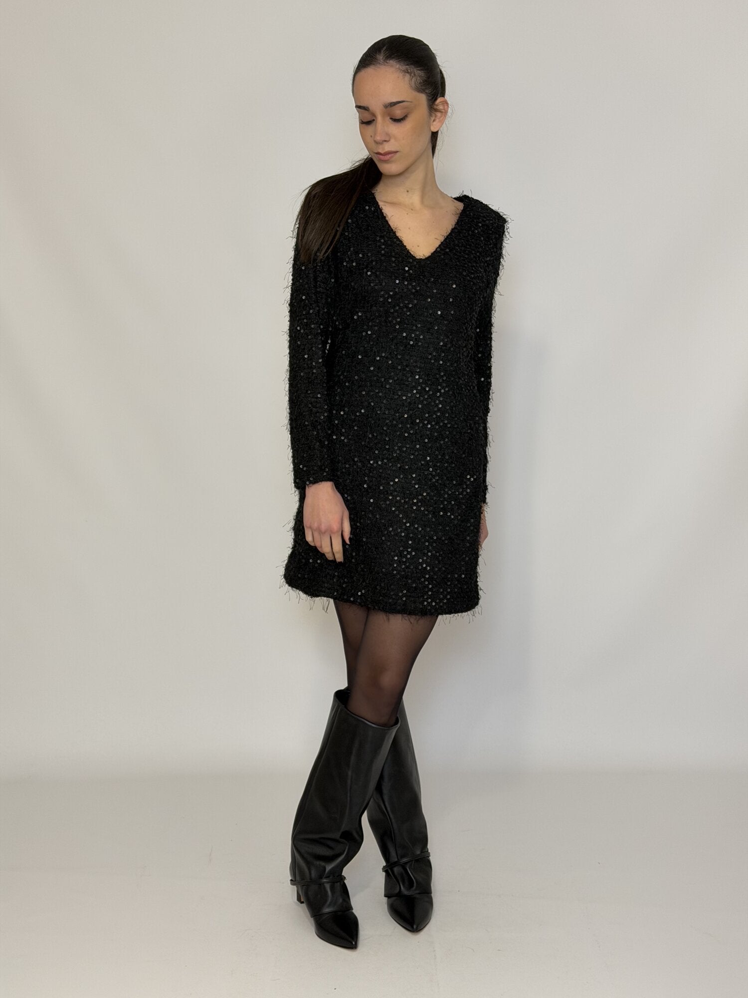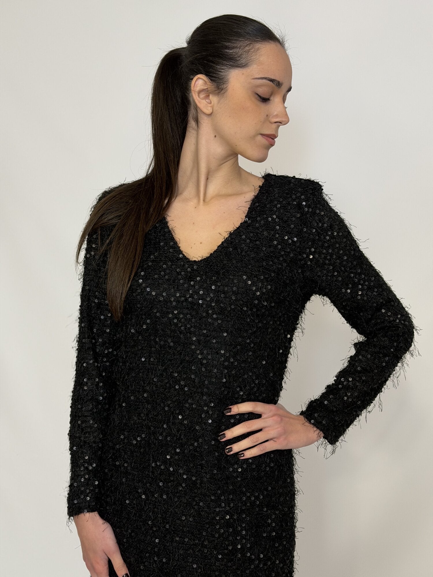 Abito girocollo a maniche lunghe con paillettes e piule marabou. Allacciatura con bottone e oblò a goccia sulla schiena. Vestibilità dritta e ampia. Disponibile in nero.