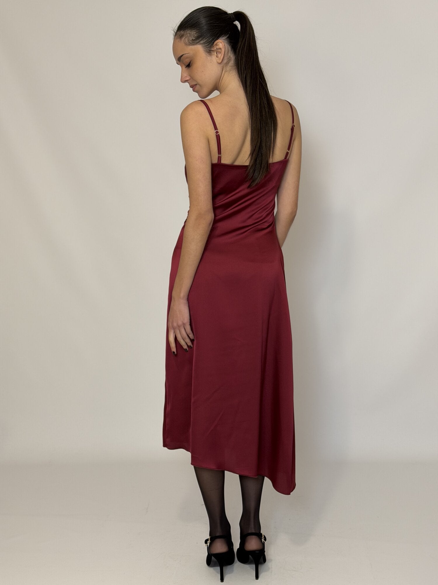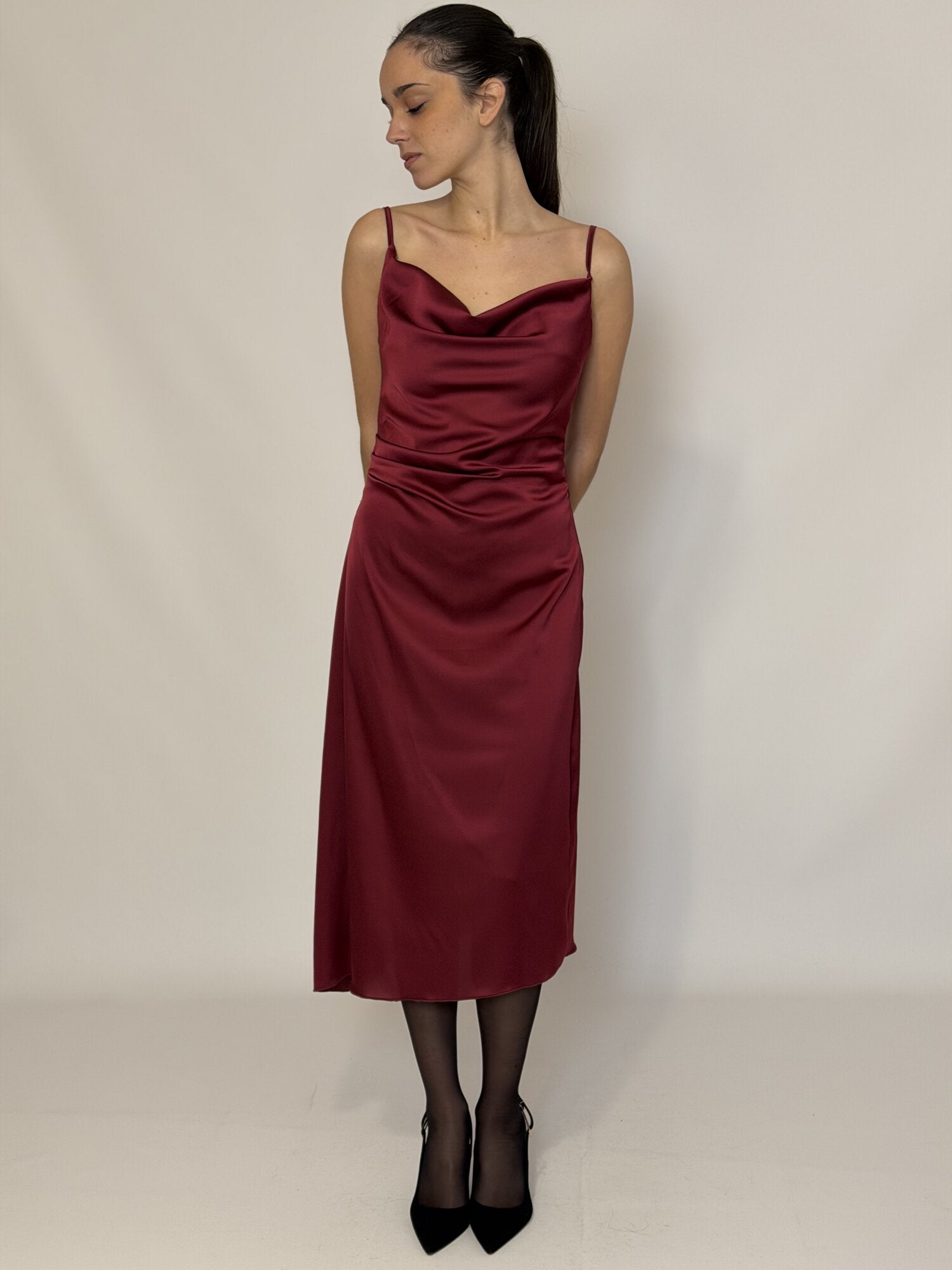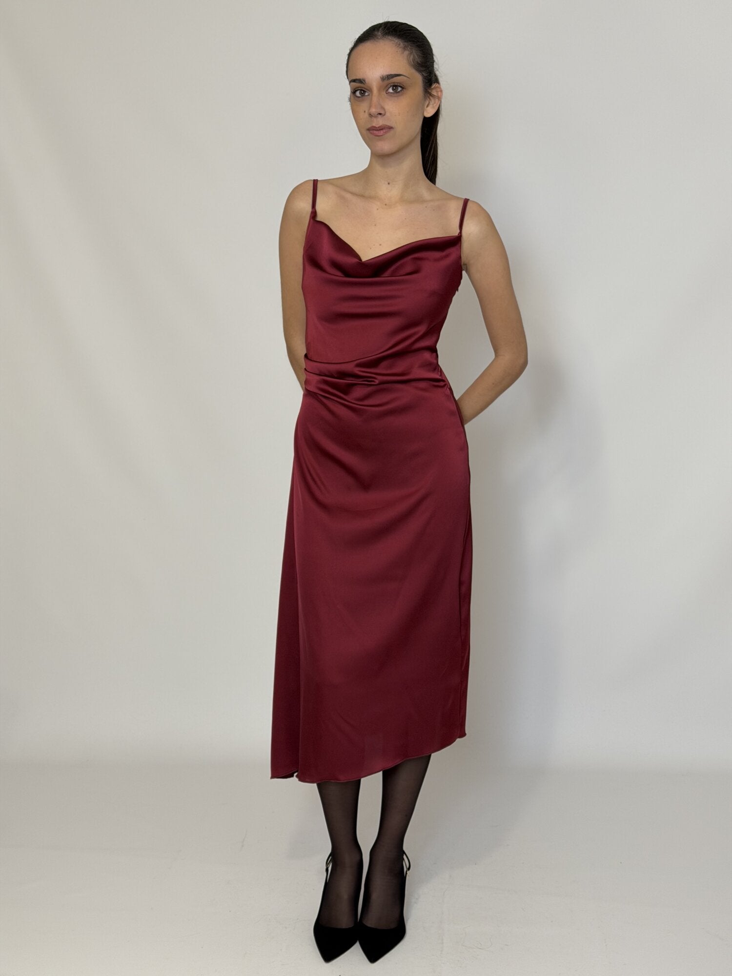 Abito sottoveste (slip dress) midi in raso bordeaux. Abito con lunghezza midi. Ha spalline sottili. Caratterizzato da uno scollo morbido a cascata (cowl neck) sulla parte frontale. Il colore è rosso bordeaux.