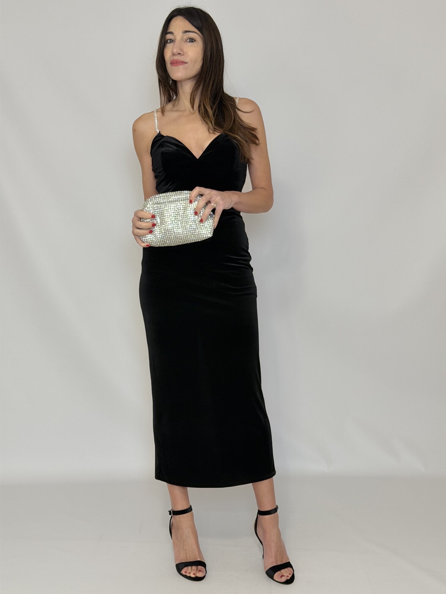 Abito lungo in velluto con scollo a V e bretelle sottili di strass. Vestibilità aderente. Disponibile in nero.