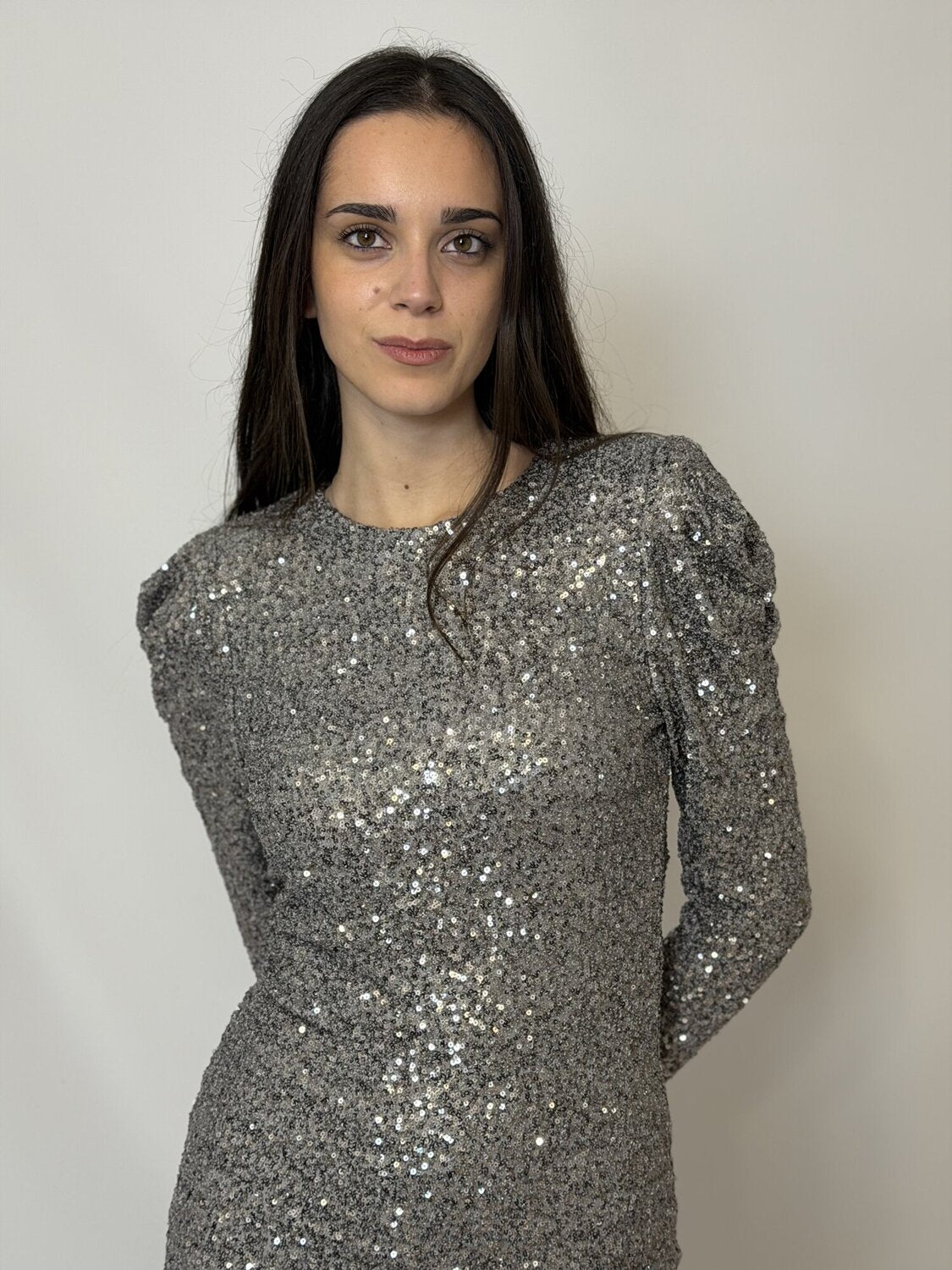 Abito Corto Paillettes Argento di Vicolo. Abito corto a tubino, modello girocollo con maniche lunghe e spalline imbottite. Drappeggi sulle spalle. Disponibile in argento.
