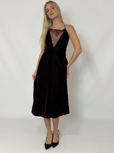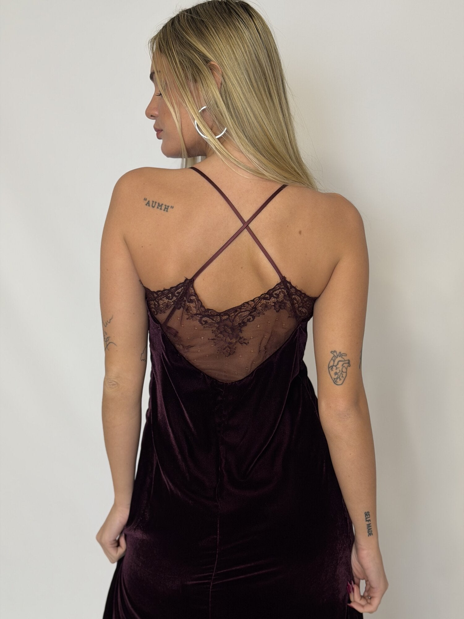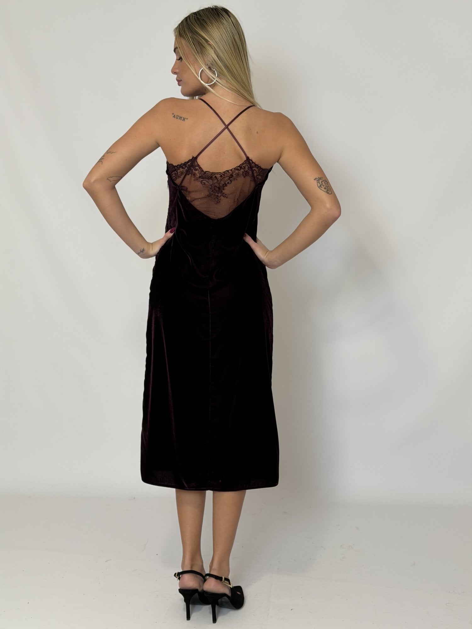 Abito Midi in Velluto bordeaux con Pizzo di Vicolo. Abito midi con spalline sottili incrociate sulla schiena. Velluto morbido con drappeggio. Scollo a V profondo con un inserto in pizzo sul décolleté. Vita alta con arricciatura che cade morbida sulla gonna. Disponibiel in bordeaux.