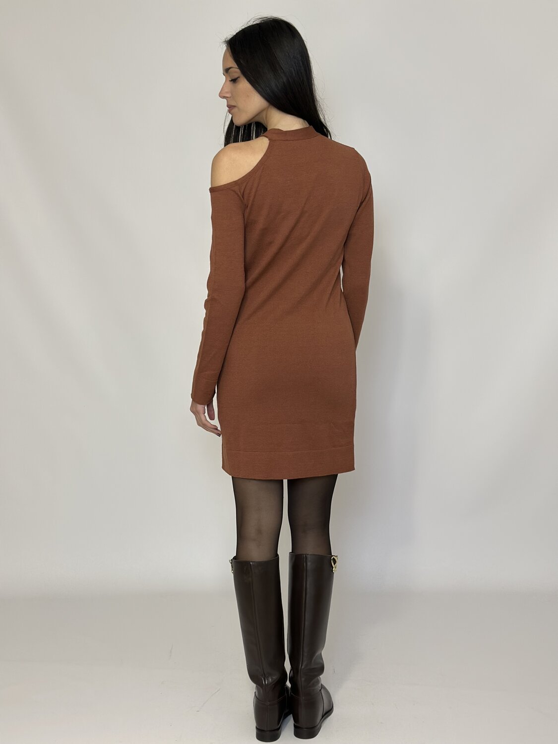 Abito Maglia Fiocco Terracotta di Vicolo. Abito corto in maglia con maniche lunghe e vestibilità aderente. Dettaglio cut out sull spalla e fiocco sul collo laterale. Taglia unica. Disponibile in terracotta, nero e verde scuro.
