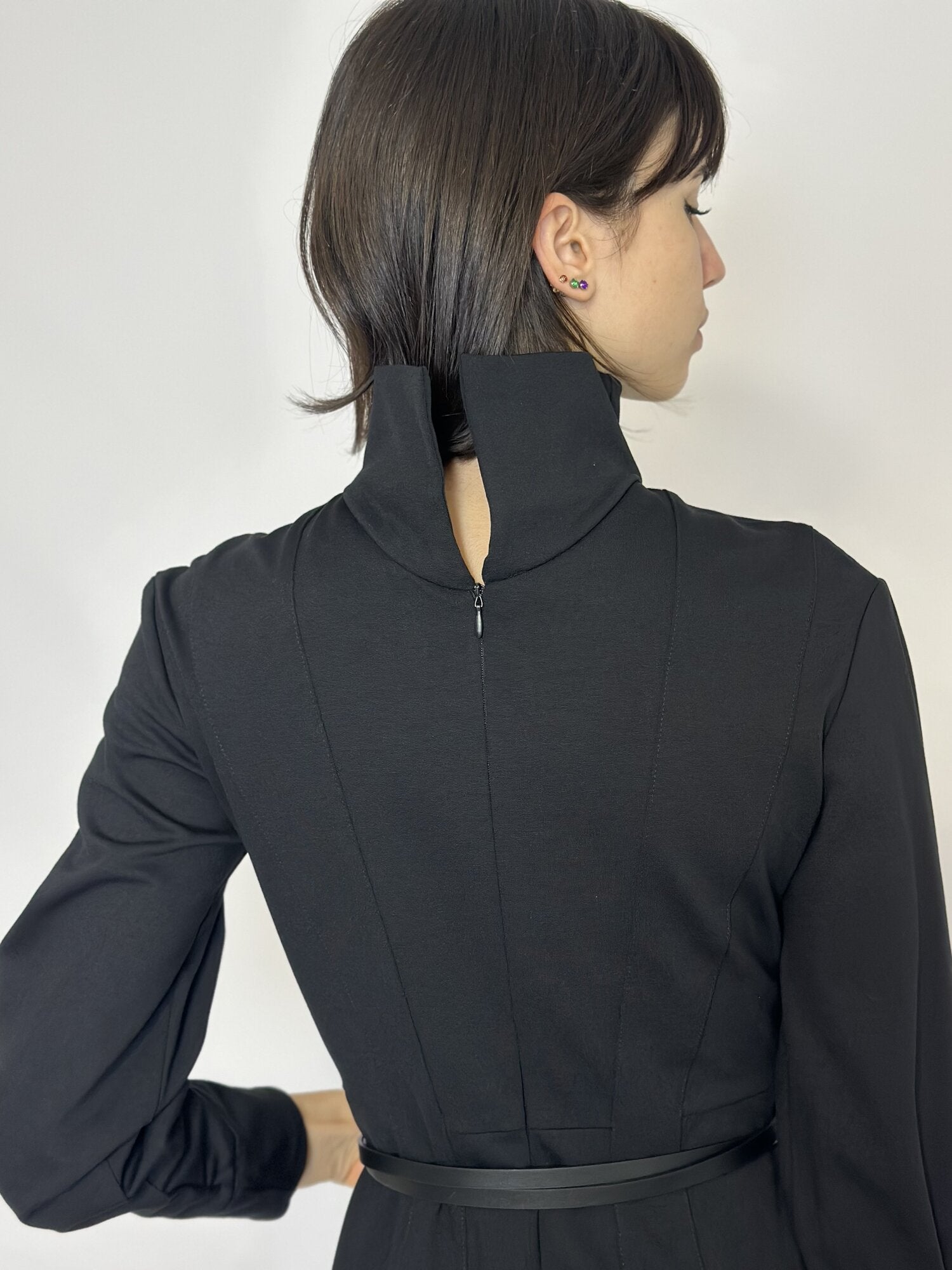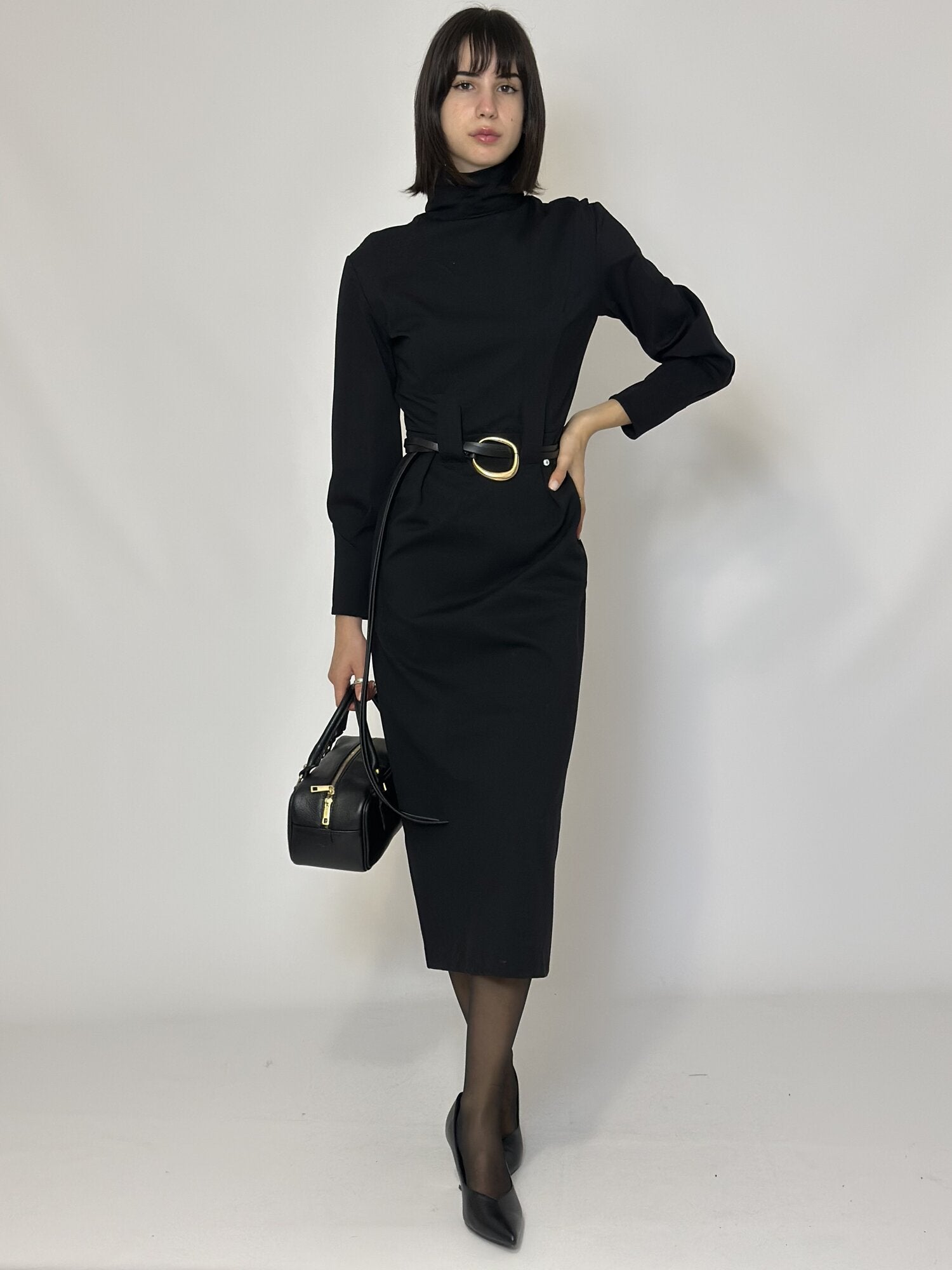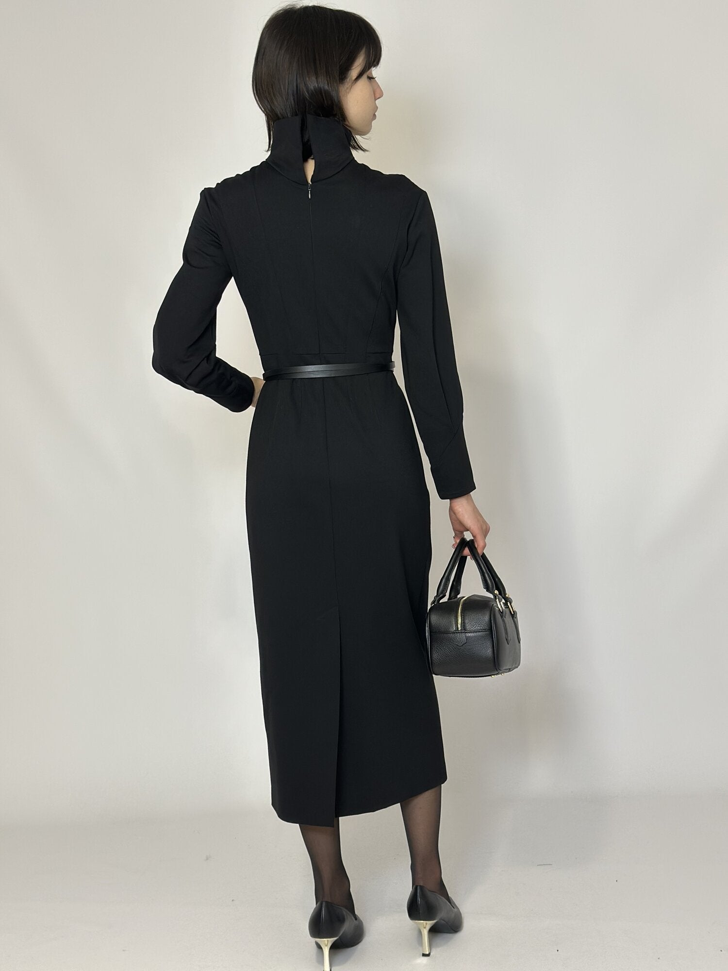 Abito Collo Alto Nero di MeimeiJ. Abito midi modello tubino con maniche lunghe e collo alto. Dettaglio passanti per cintura in vita. Cintura non inclusa. Chiusura con cerniera sul retro. Disponbile in nero.