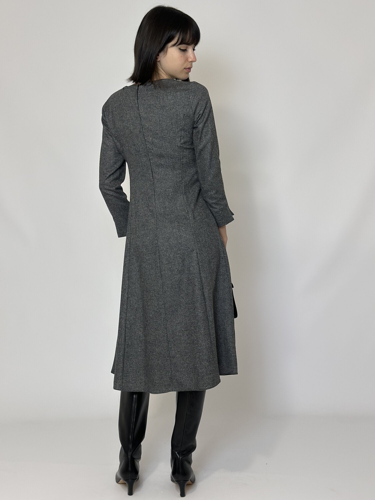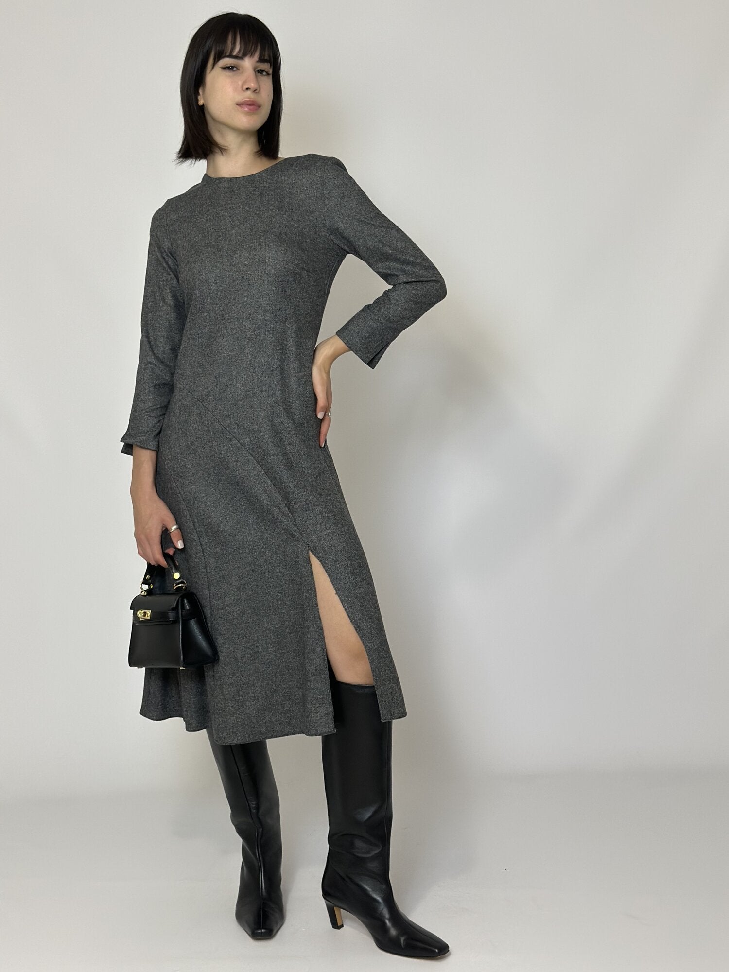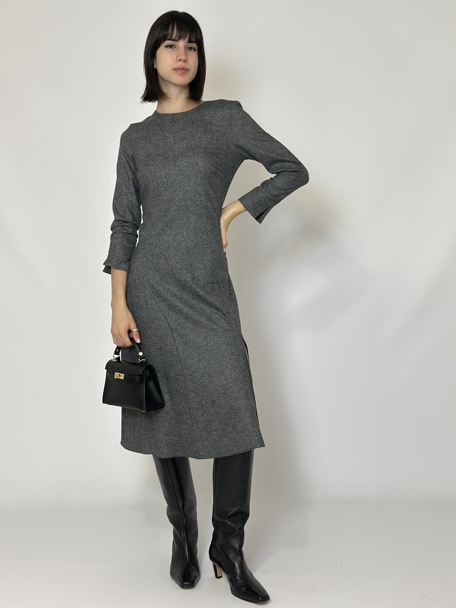 Abito in flanella Lambert Antracite di Emme Marella. Abito sfoderato in flanella leggera di misto lana. Linea fit and flare. Scollo stondato con zip nascosta posteriore. Pince al seno. Motivo di tagli sagomati sul davanti con spacco. Disponibile in antracite.