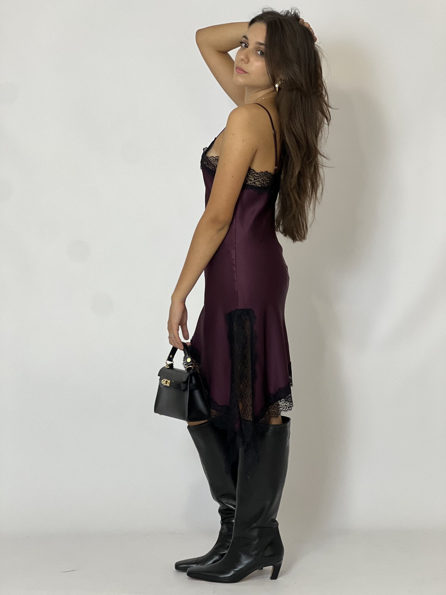 Abito sottoveste asimmetrico vinaccio di Vicolo. Abito sottoveste in raso con scollo a V e spalline sottili. Dettaglio in pizzo sul décolleté e sul fondo. Orlo asimmetrico e vestibilità morbida. Disponibile nel colore vinaccio.
