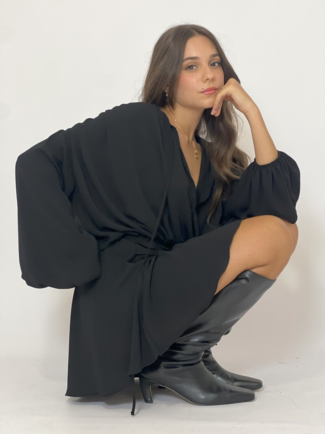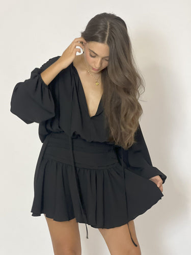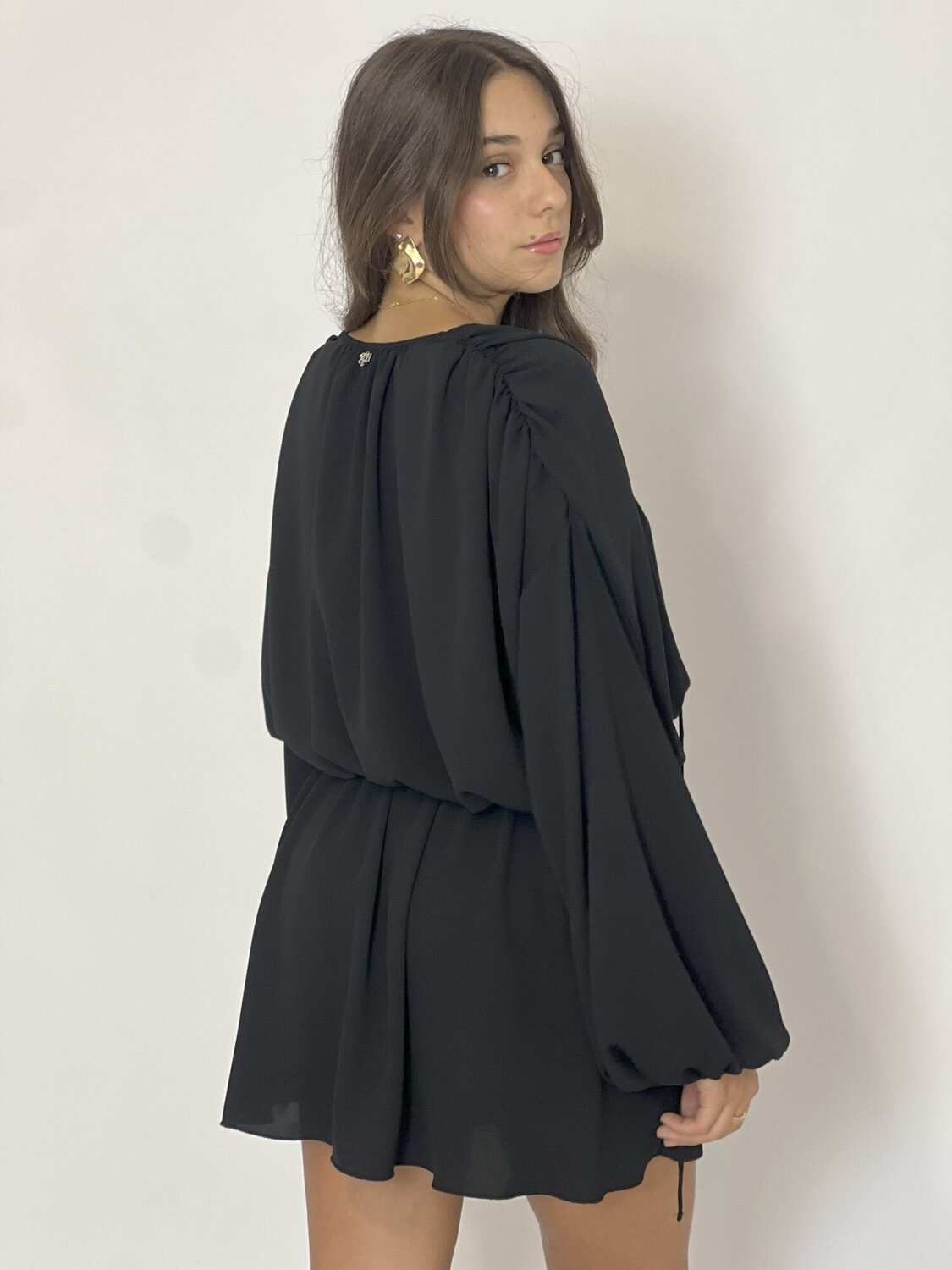 Mini Dress Jolie Nero di Aniye By. Abito corto in tessuto tecnico dalla vestibilità fluida, con scollo a v e maniche lunghe svasate. Banda stretch nel punto vita. Gonna a ruota. Logo "AB" in metallo sul retro. Disponibile in nero.