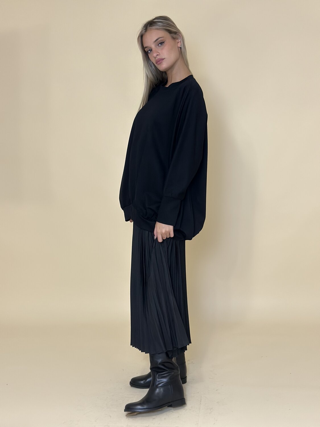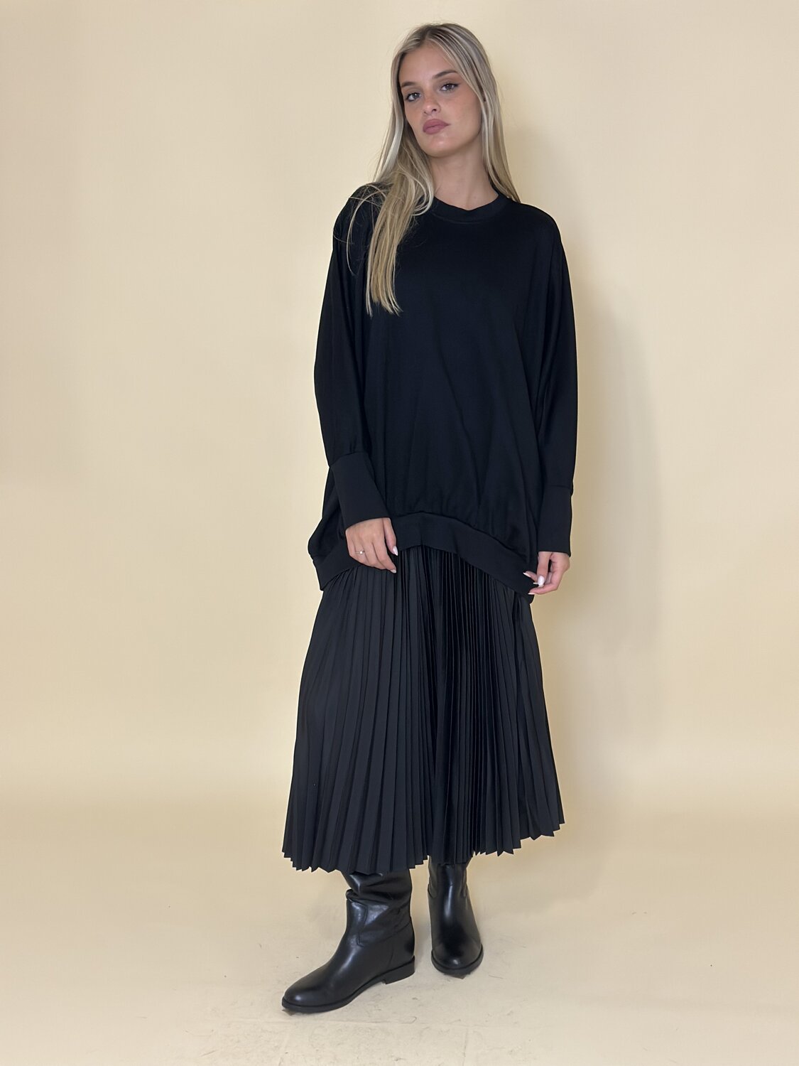 Slipdress con felpa oversize nero di Meimei J. Felpa a maniche lunghe oversize con scollo rotondo e orlo elasticizzato. Slipdress con gonna plissettata,scollo rotondo e spalline sottili. Vestibilità regolare. Tessuto fluido.Disponibile nel colore nero.