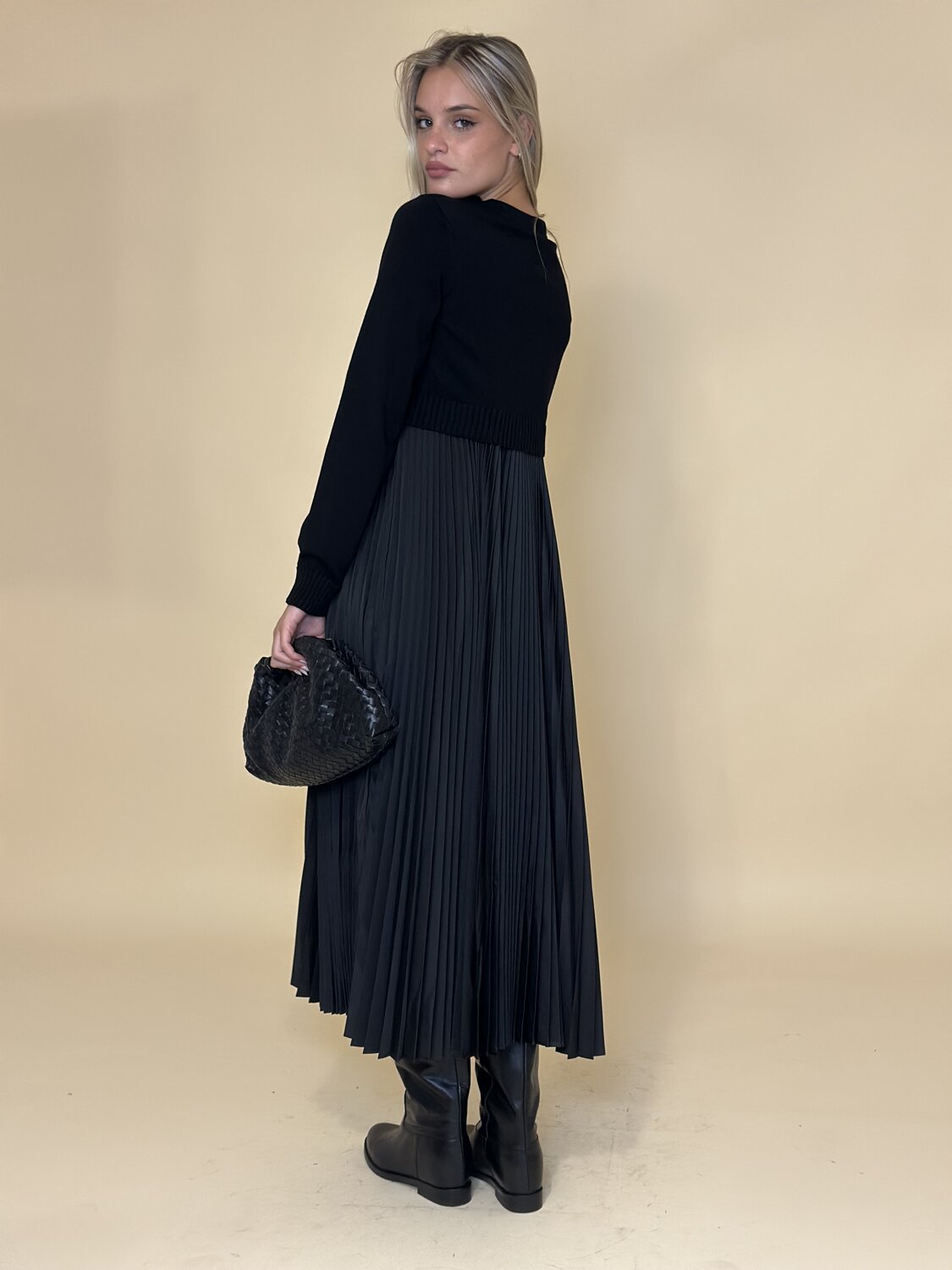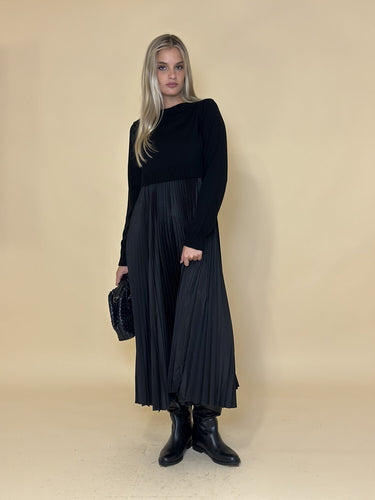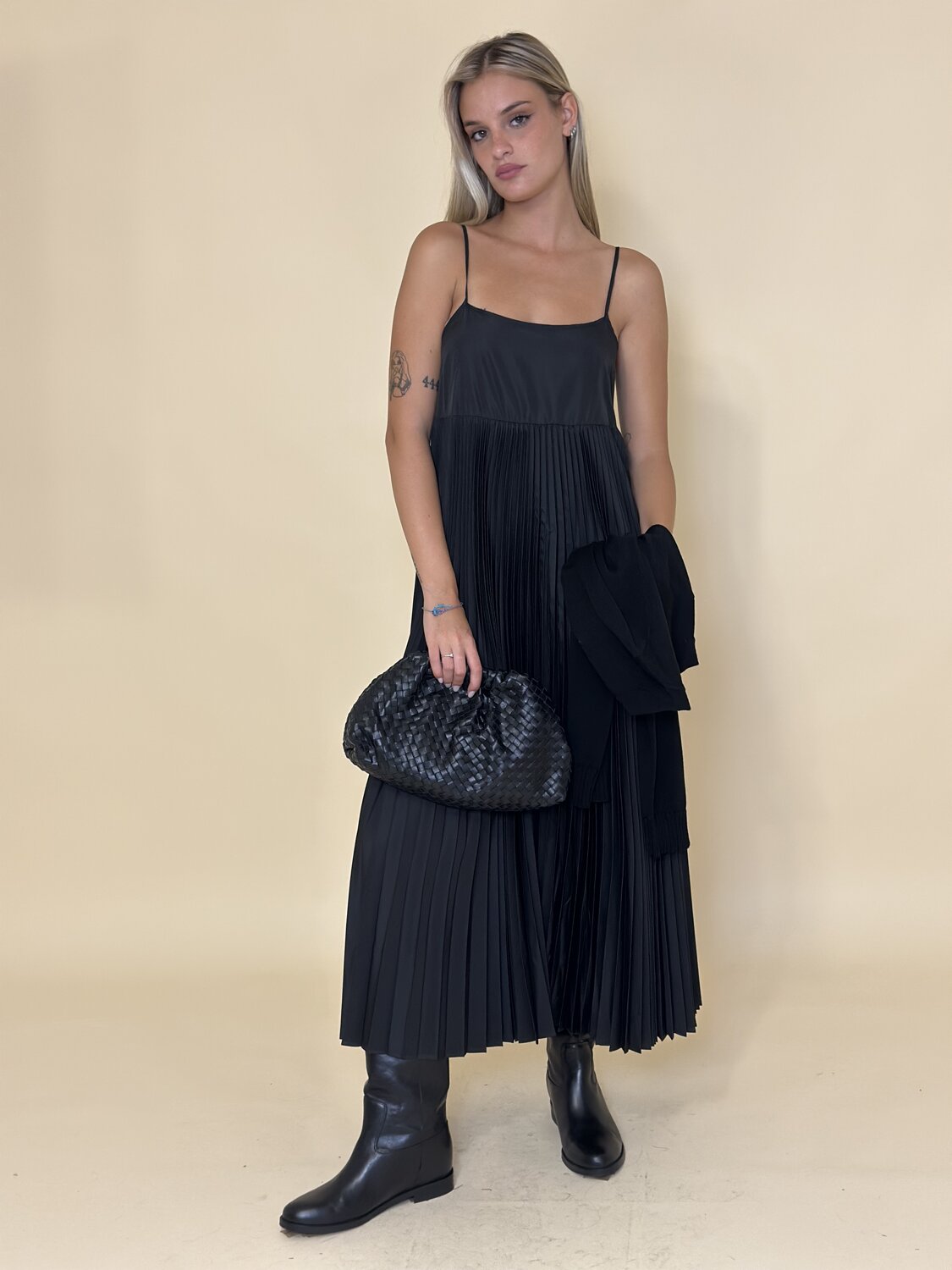 Slipdress con maglia crop di Meimei J. Maglia a maniche lunghe crop con scollo rotondo e orlo elasticizzato. Slipdress con gonna plissettata,scollo rotondo e spalline sottili. Vestibilità regolare. Tessuto fluido.Disponibile nel colore nero.