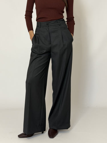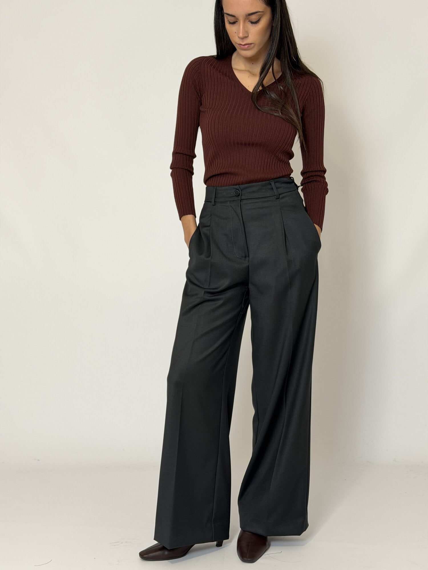 Pantaloni palazzo con pences antracite di Vicolo. Pantaloni a vita alta con vestibilità dritta e taglio palazzo ampio. Pences profonde sul davanti e tasche oblique laterali. Chiusura con bottone e zip. Vestibilità elegante e fluida. Disponibili nel colore grigio antracite.