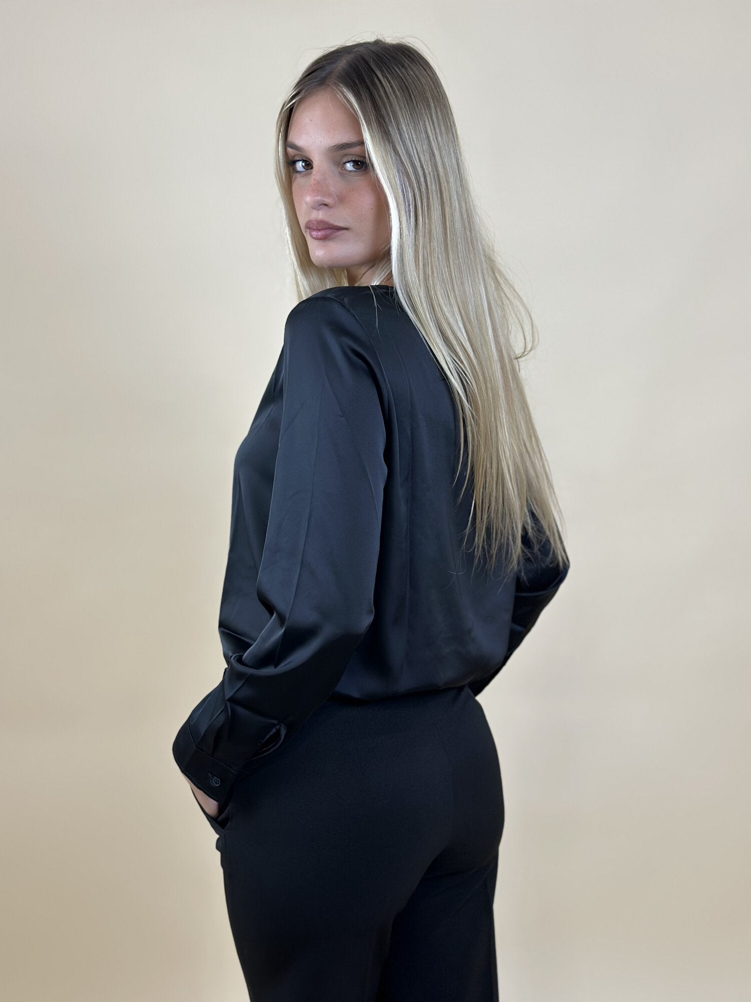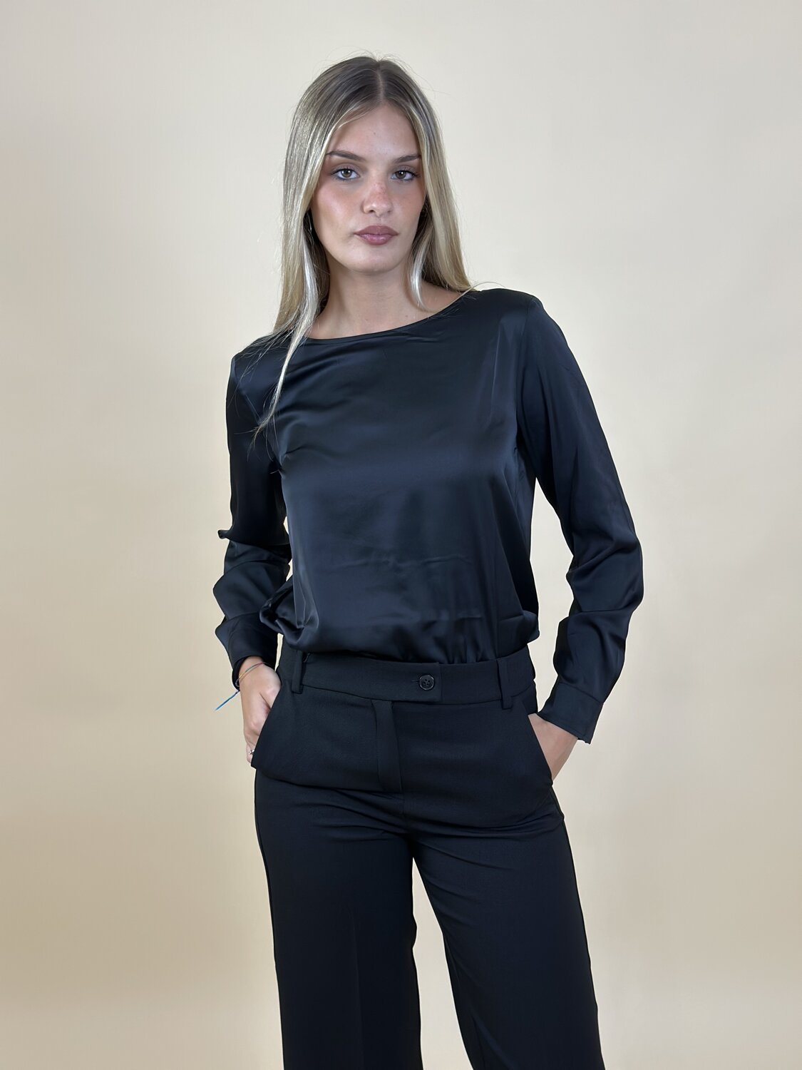 Blusa Madera girocollo nera di Emme Marella. Blusa con scollo rotondo a maniche lunghe. Tessuto satinato. Vestibilità regolare. Disponibile in bianco, verde militare, nero e ciclamino.