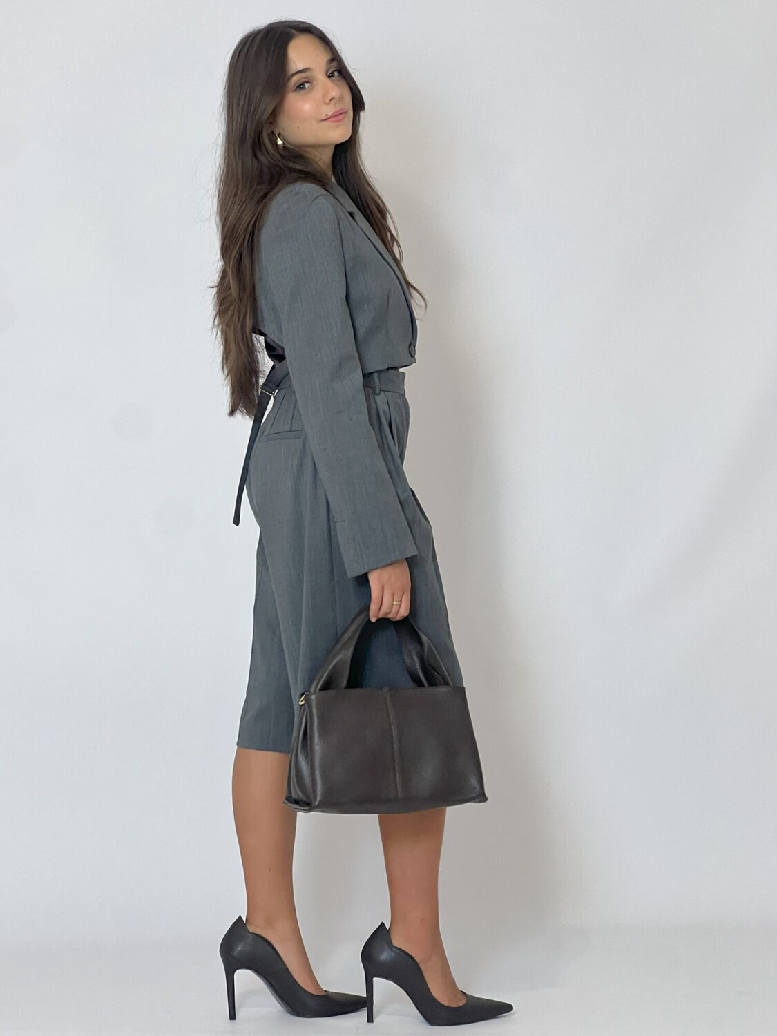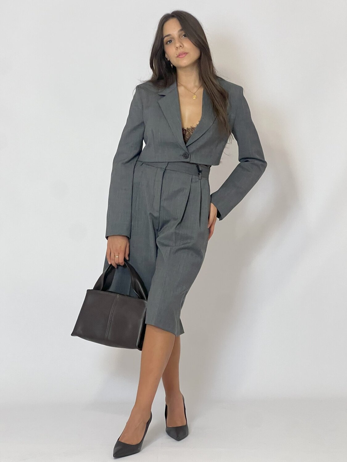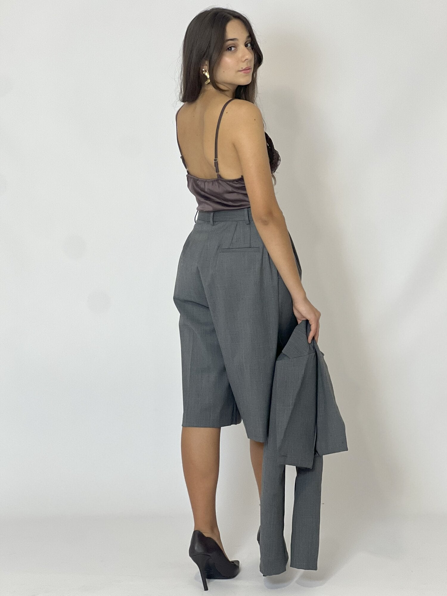 Bermuda Pences Grigio di Vicolo. Pantalone corto modello bermuda a vita alta con pences frontali. Passanti per cintura in vita. Chiusura con cerniera e gancio nascosto. Disponibile in grigio.