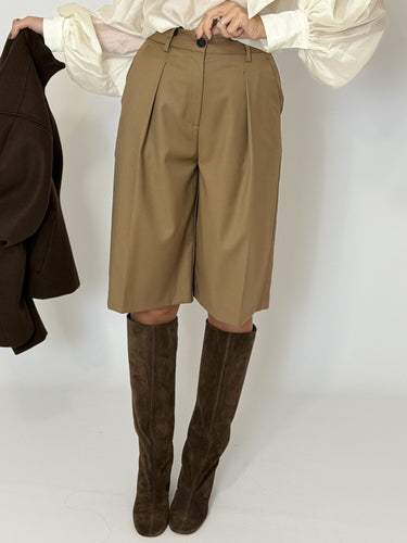 Bermuda con pences tabacco di Vicolo. Bermuda a vita alta con vestibilità ampia e taglio dritto. Dettaglio di pences sul davanti e tasche oblique laterali. Lunghezza sopra il ginocchio. Chiusura con bottone e zip. Disponibili nel colore tabacco.