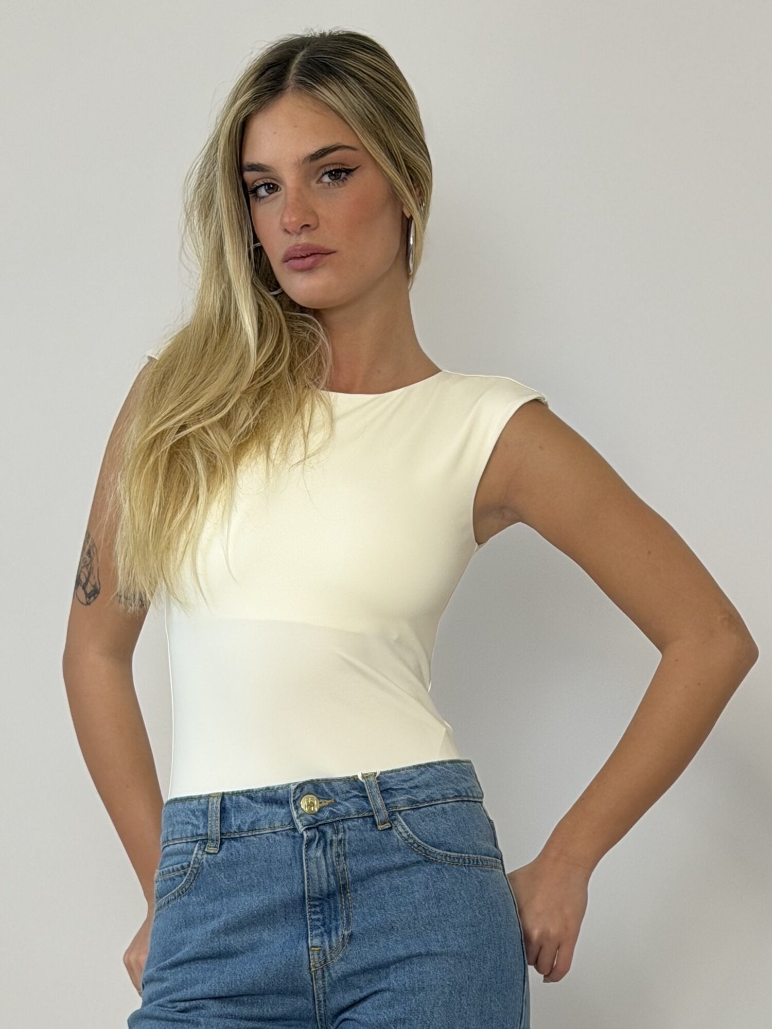 Top Body Stretch Emmvigile Panna di Emme. Top a body con scollo tondo e senza maniche, in tessuto jersey interlock poliestere stretch che dona una vestibiltà aderente. Disponibile in panna, moro e nero.