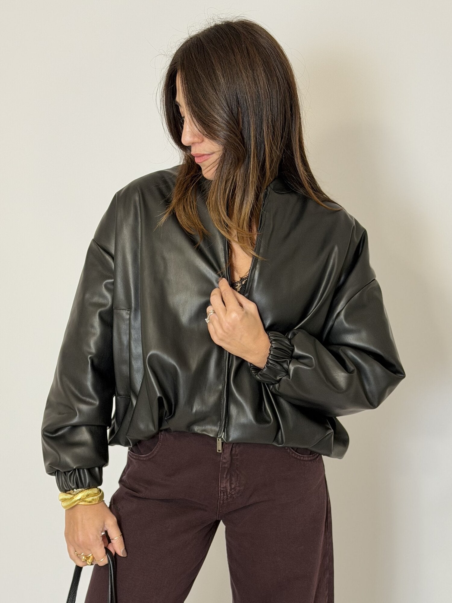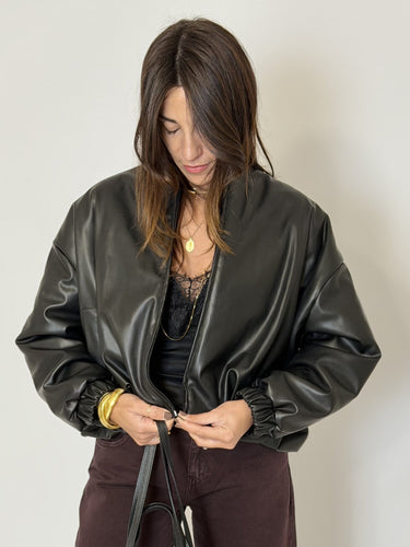 Bomber nero in ecopelle di Vicolo. Bomber corto in ecopelle liscia con chiusura a zip frontale. Maniche ampie e vestibilità oversize. Collo alla coreana e polsini e fondo elasticizzati. Disponibile nel colore nero.