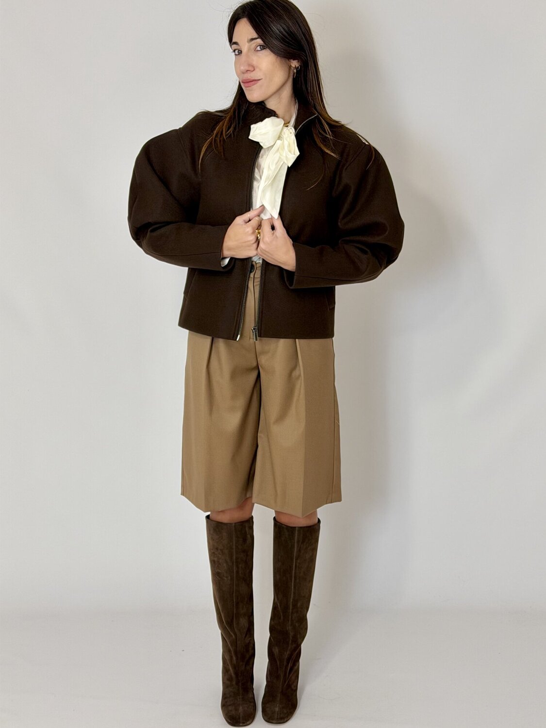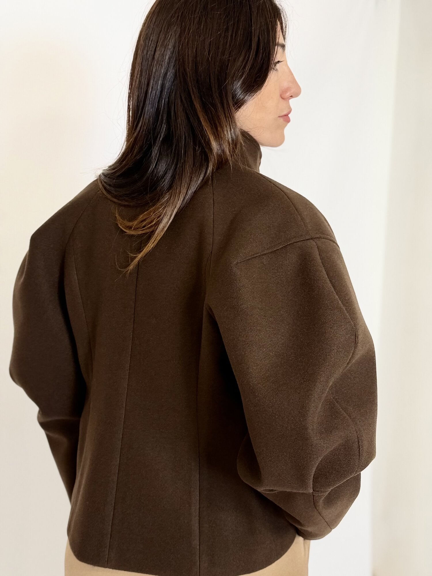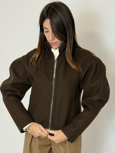 Bomber corto in panno moro di Vicolo. Giacca bomber corta in panno di lana con maniche a palloncino e spalla leggermente imbottita. Collo alla coreana e chiusura frontale con zip metallica. Vestibilità morbida e destrutturata. Disponibile nel colore moro.
