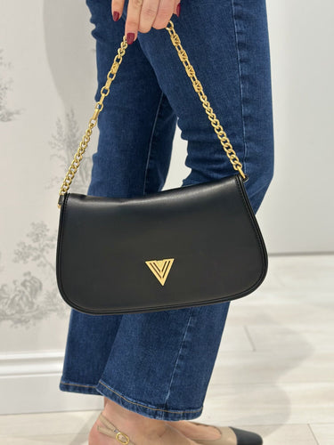 Borsa a spalla Nera di Vicolo. Borsa a spalla in similpelle con angoli arrotondati e logo. Chiusura con bottoni a pressione. Taschini interni. Dettaglio catenella con logo. Disponibile in nero.