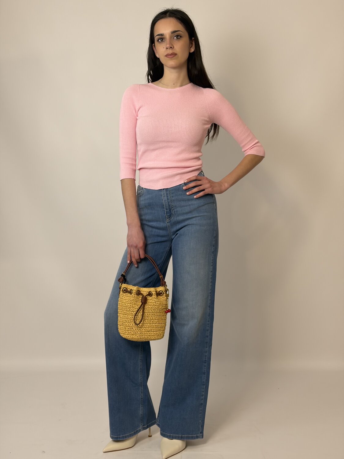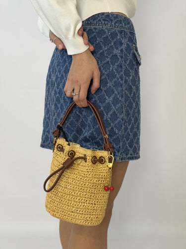 Borsa a secchiello compatta e luminosa, con dettagli in pelle marrone e piccole finiture dorate che ne esaltano il carattere estivo. Il charm con le due perline rosse aggiunge un tocco giocoso e distintivo, rendendola un accessorio perfetto per look freschi e casual.