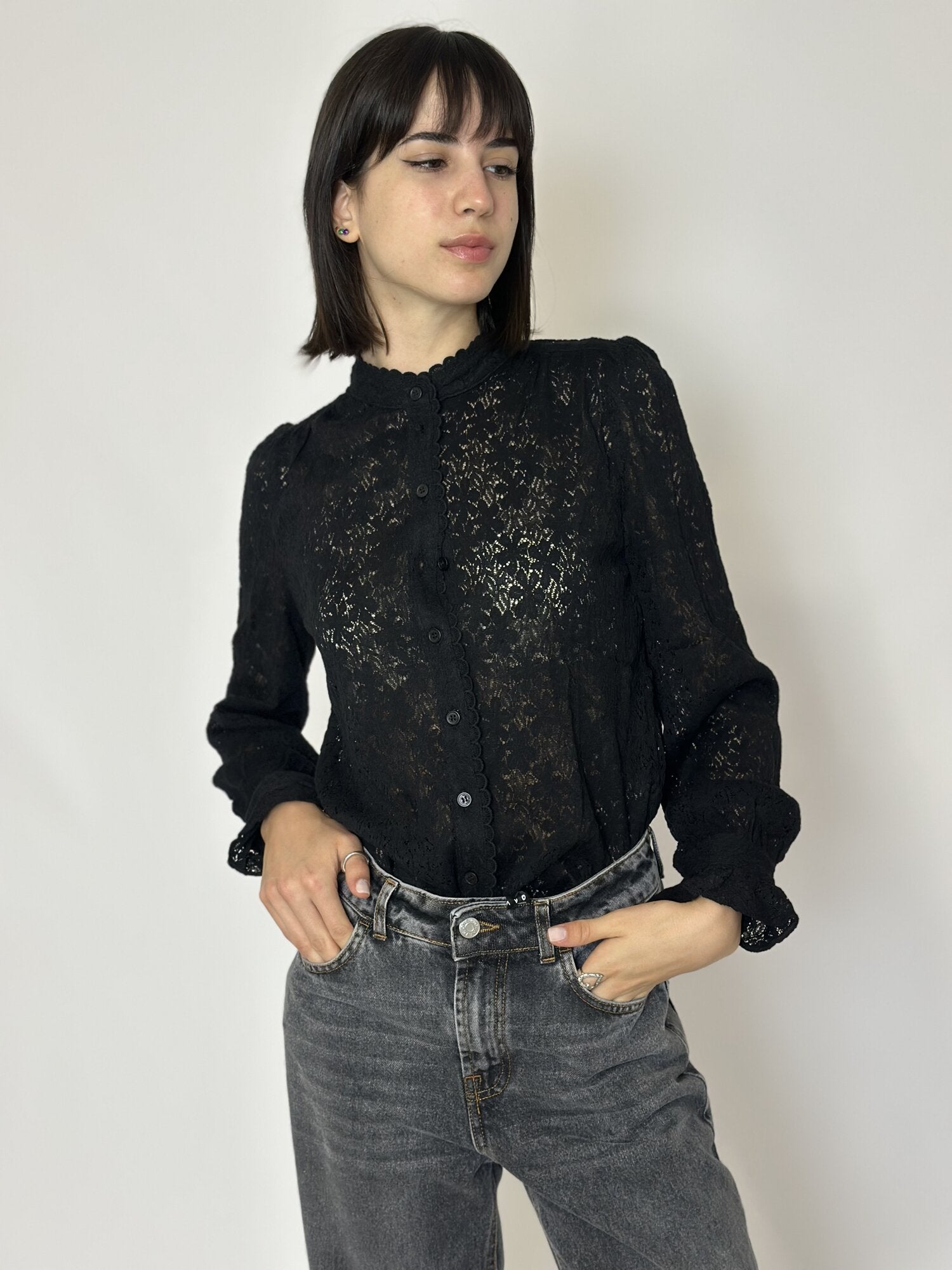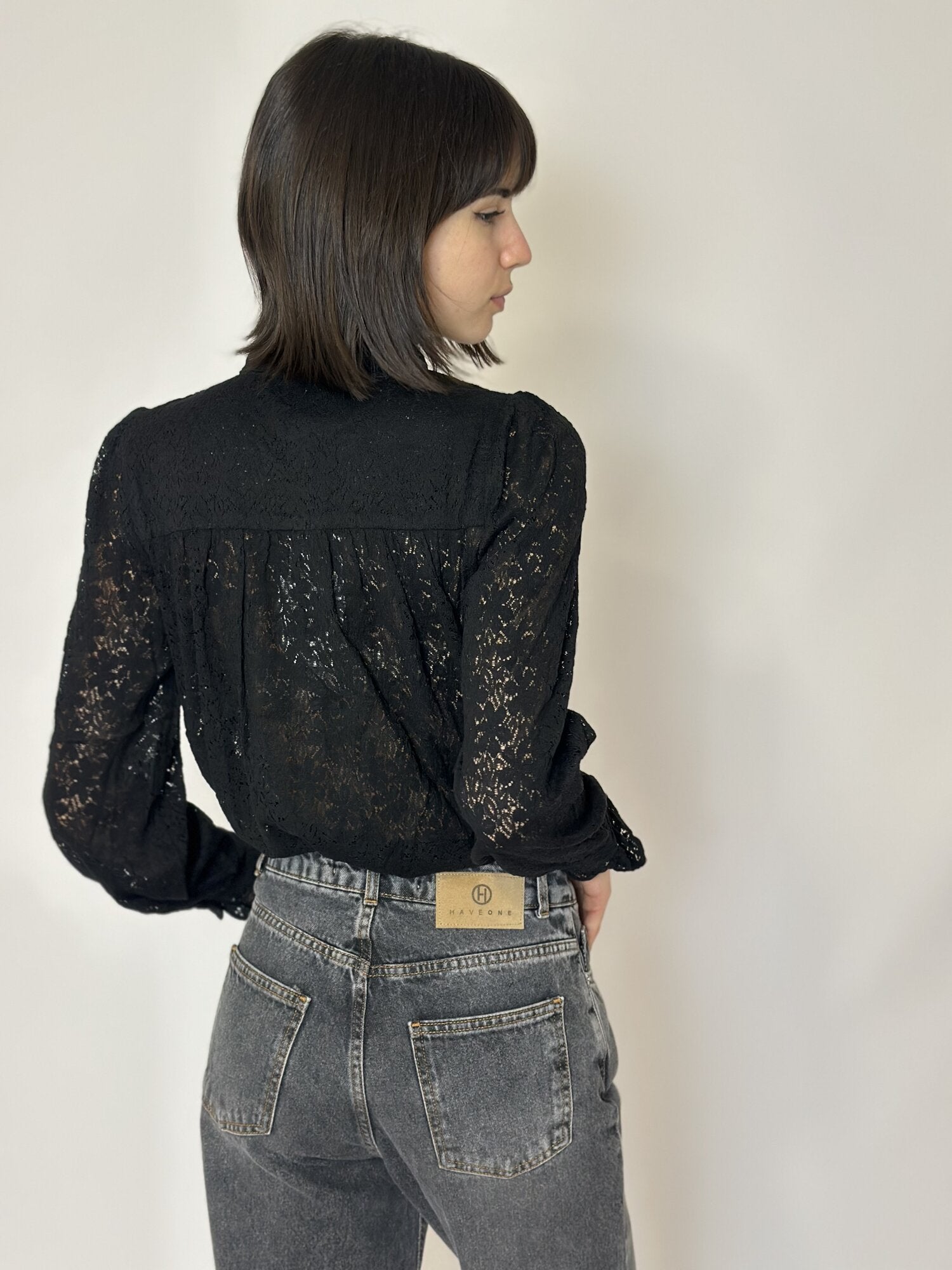 Camicia Swing nera di Grace & Mila. Camicetta in pizzo. Taglio dritto. Maniche lunghe con polsini abbottonati. Scollo rotondo. Apertura con bottoni sul davanti. Volant sui polsini. Arricciature su spalle, polsini e carré posteriore. Dettaglio di rifiniture in pizzo sulla scollatura e lungo l'orlo. Disponibile in nero e bianco.