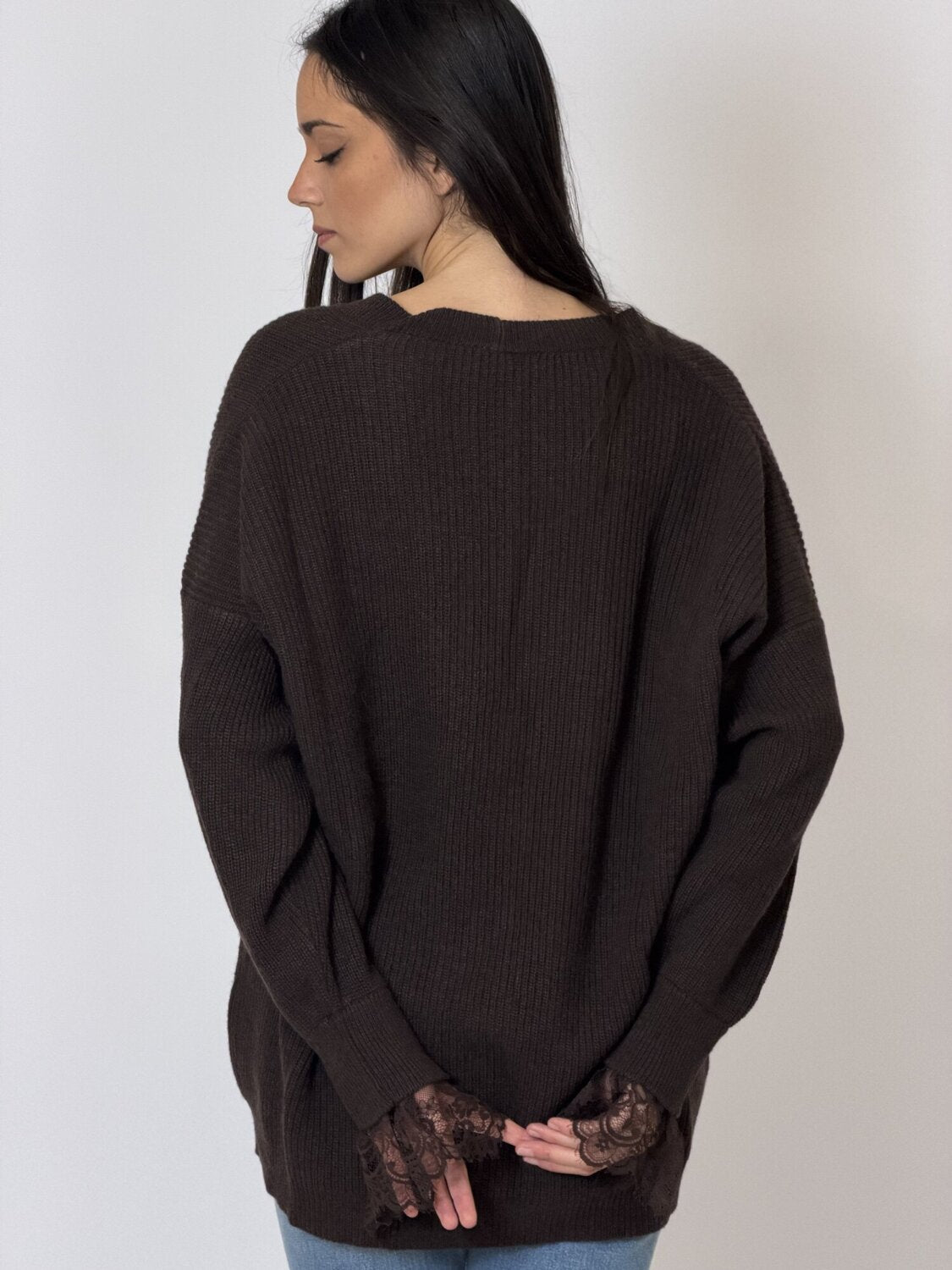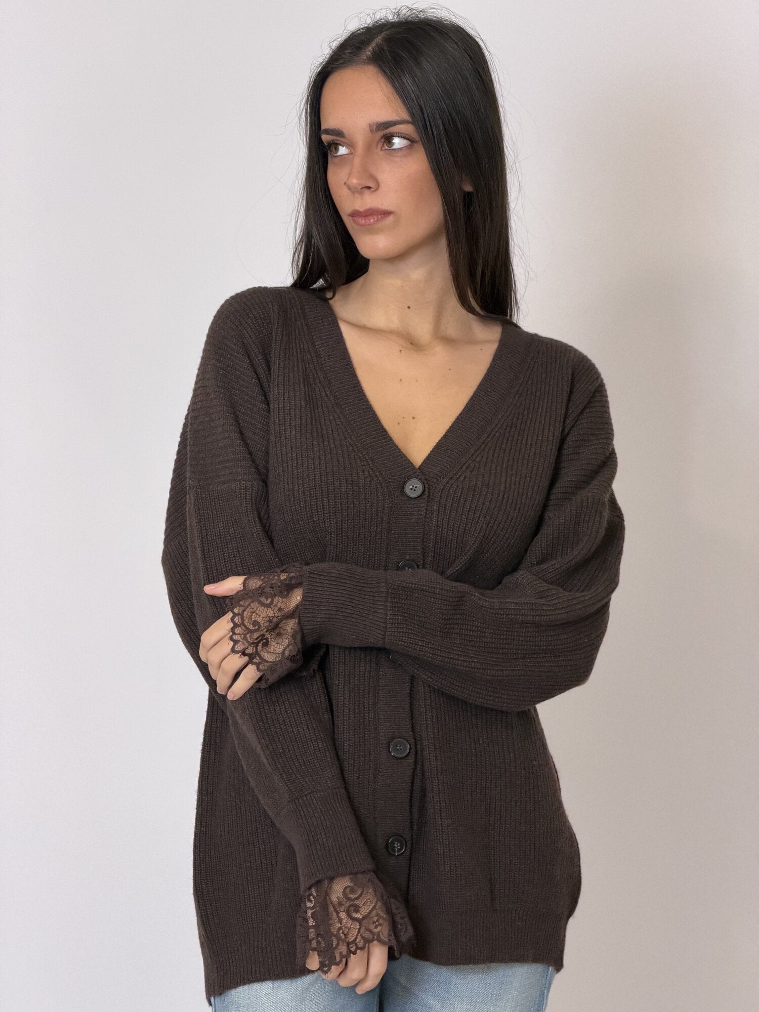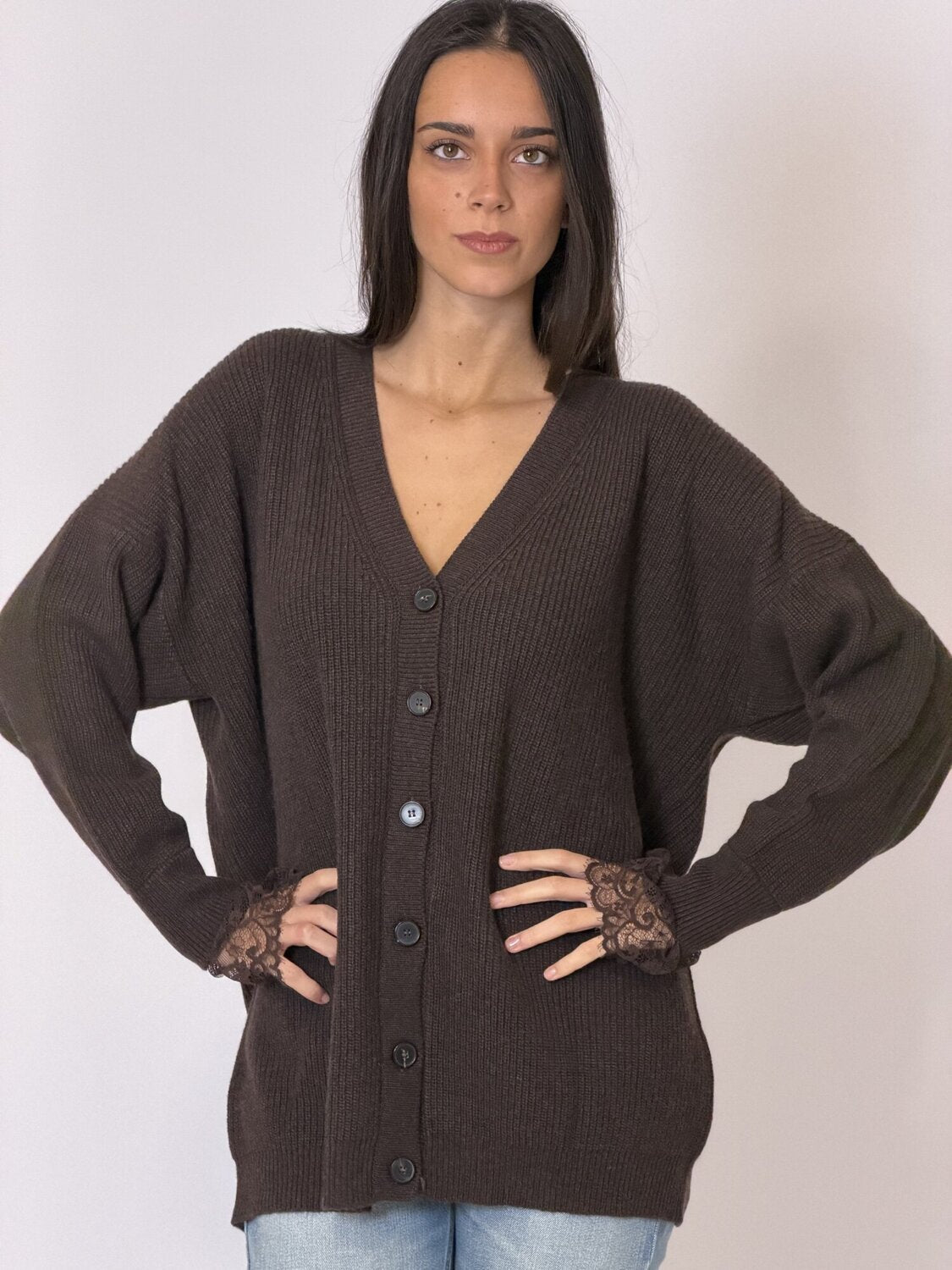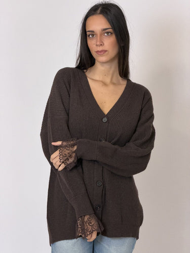 Cardigan lungo inserti in pizzo moro di Vicolo. Cardigan in maglia a costine con scollo a V e bottoni frontali. Polsini svasati in pizzo tono su tono a contrasto. Vestibilità morbida e lunghezza sui fianchi. Disponibile nel colore moro, nero, bordeaux, panna.
