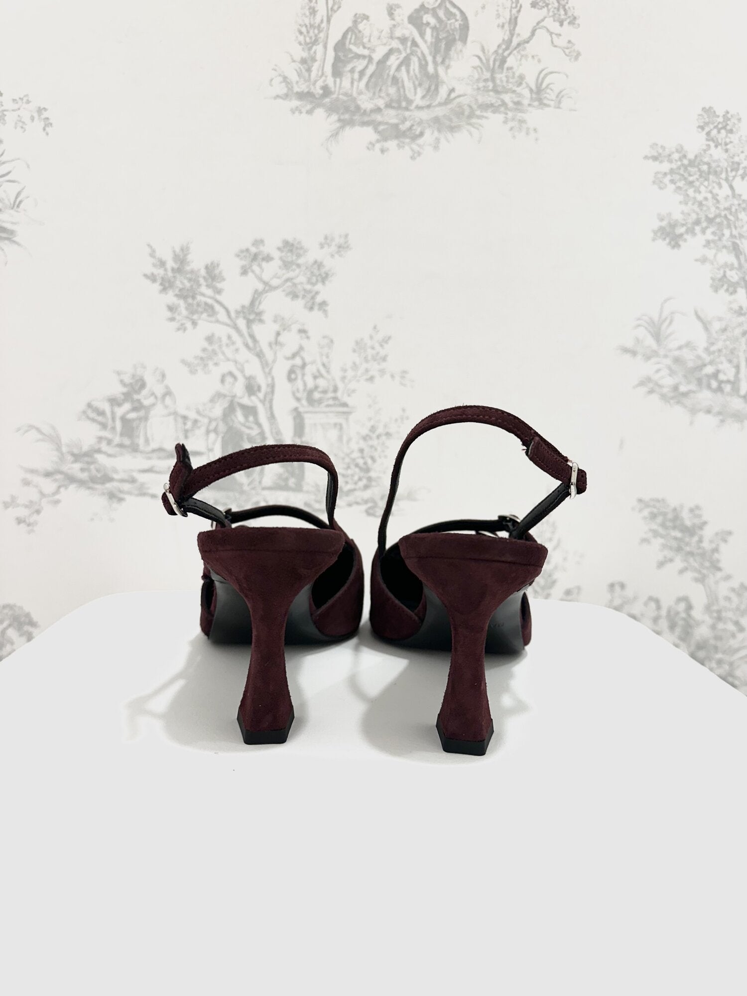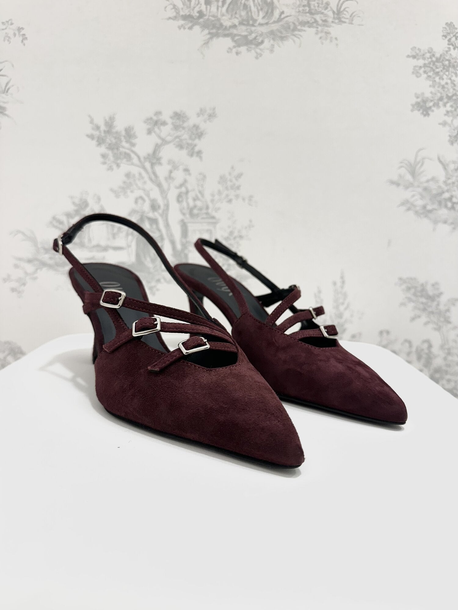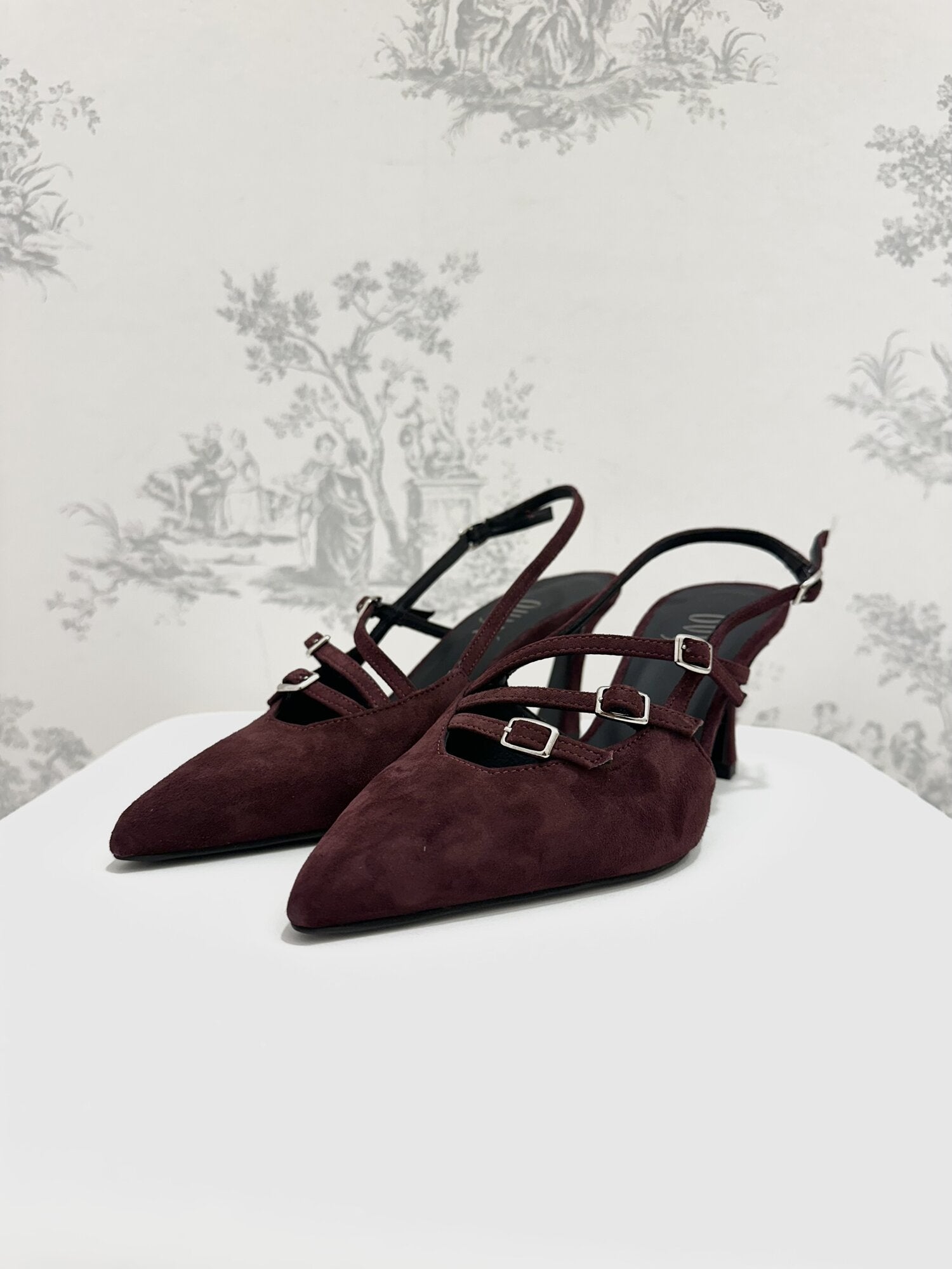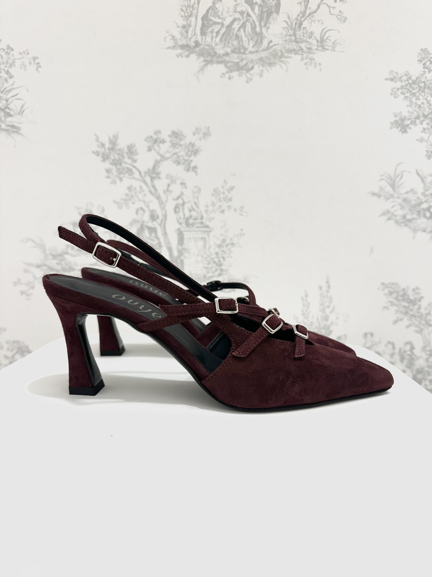 Slingback camoscio Bordeaux di Ovyé. Slingback in camoscio a punta con tacco rocchetto e cinturini regolabili con fibbie argento. Altezza tacco 7 cm. Disponibile in bordeaux.