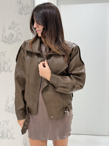 Bomber similpelle Marrone di Eleh. Giacca modello bomber in similpelle con collo reverse e chiusura con cerniera. Spalla scesa. Dettaglio cintura sul fondo. Foderato. Disponibile in marrone.