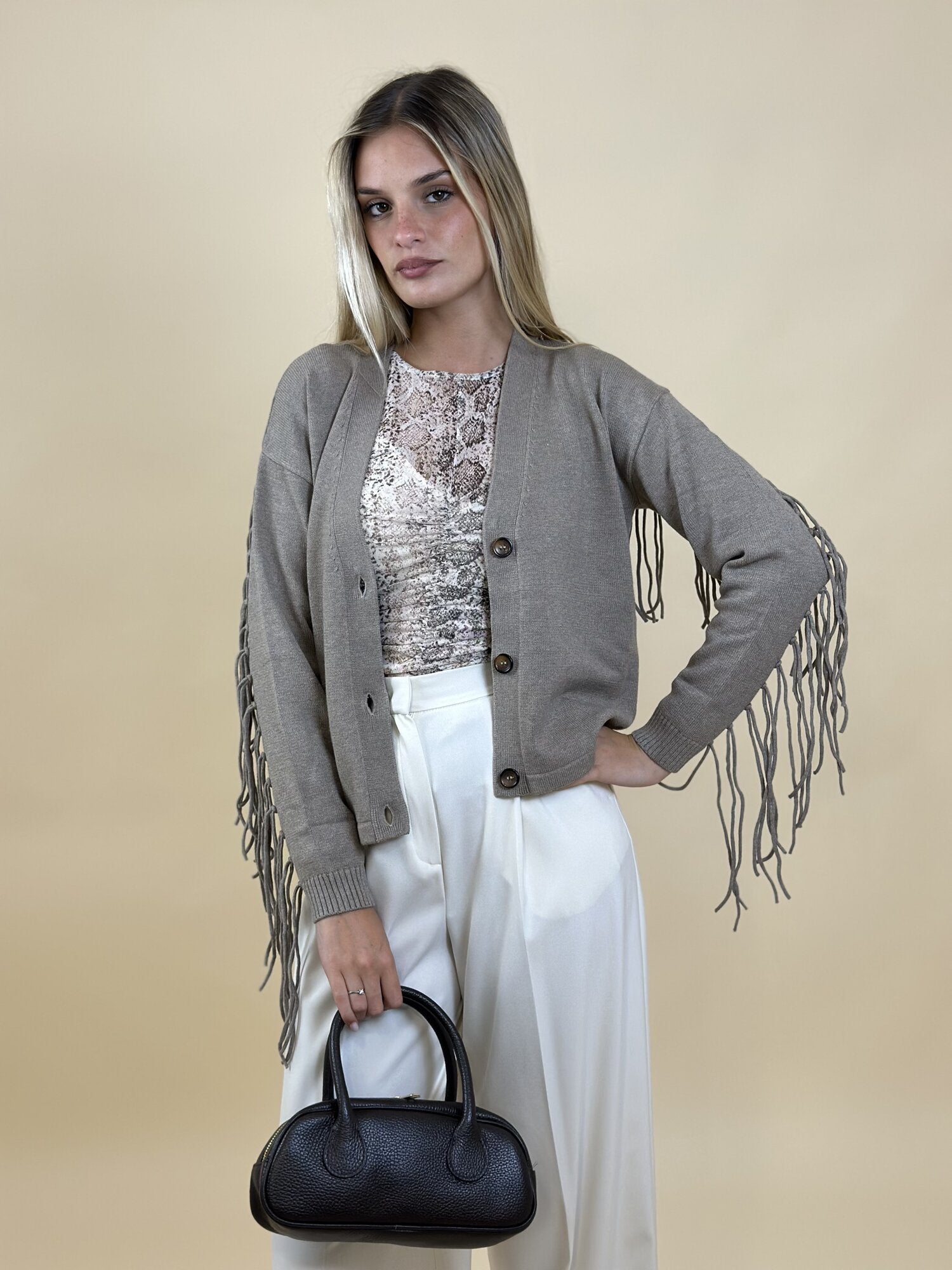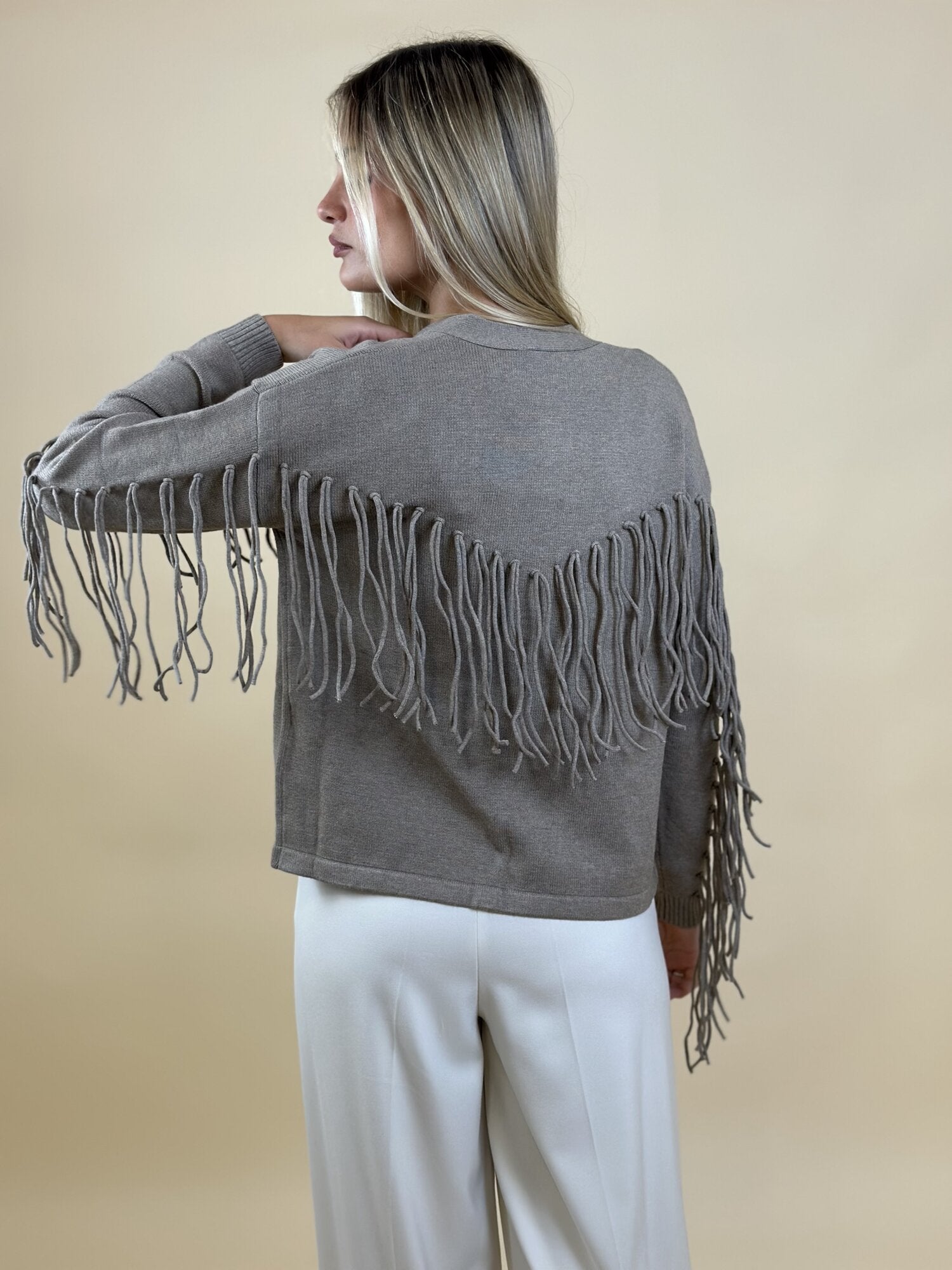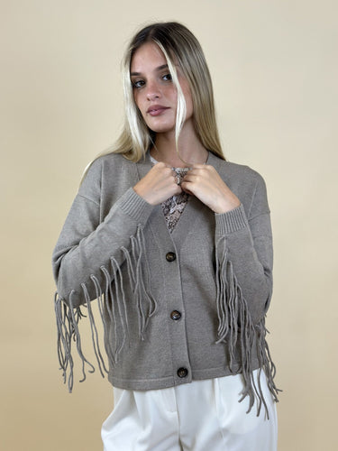 Cardigan con frange Ebe tortora - Emme Marella. Cardigan con scollo a V, bottoni frontali e frange decorative su maniche e retro. Vestibilità morbida. Materiale lavorato a maglia, caldo e confortevole. Disponibile nel colore tortora.