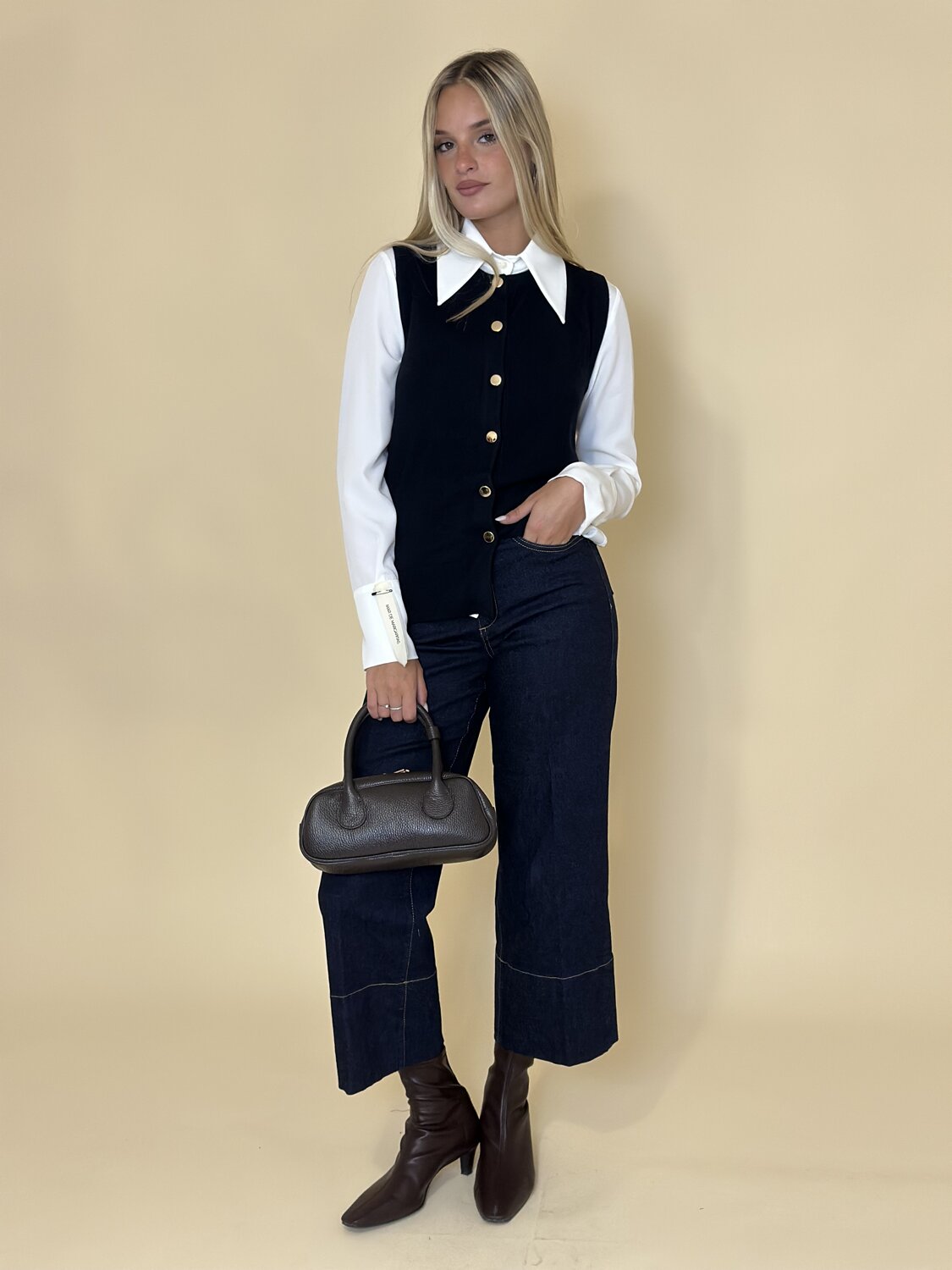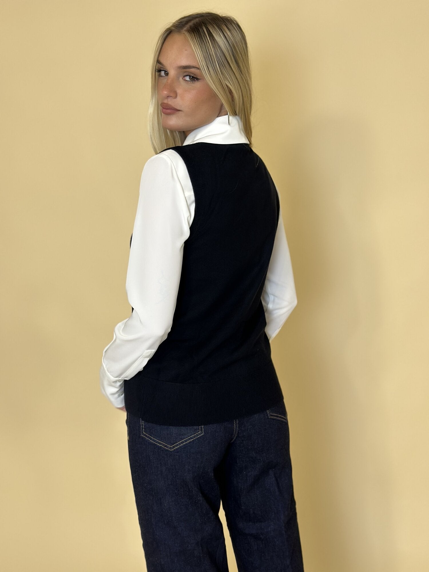 Gilet Maglia Eolo Nero di Emme di Marella. Gilet girocollo in maglia, monopetto con fila di bottoni dorati e profili a costine. Disponibile in cammello, blu notte e nero.