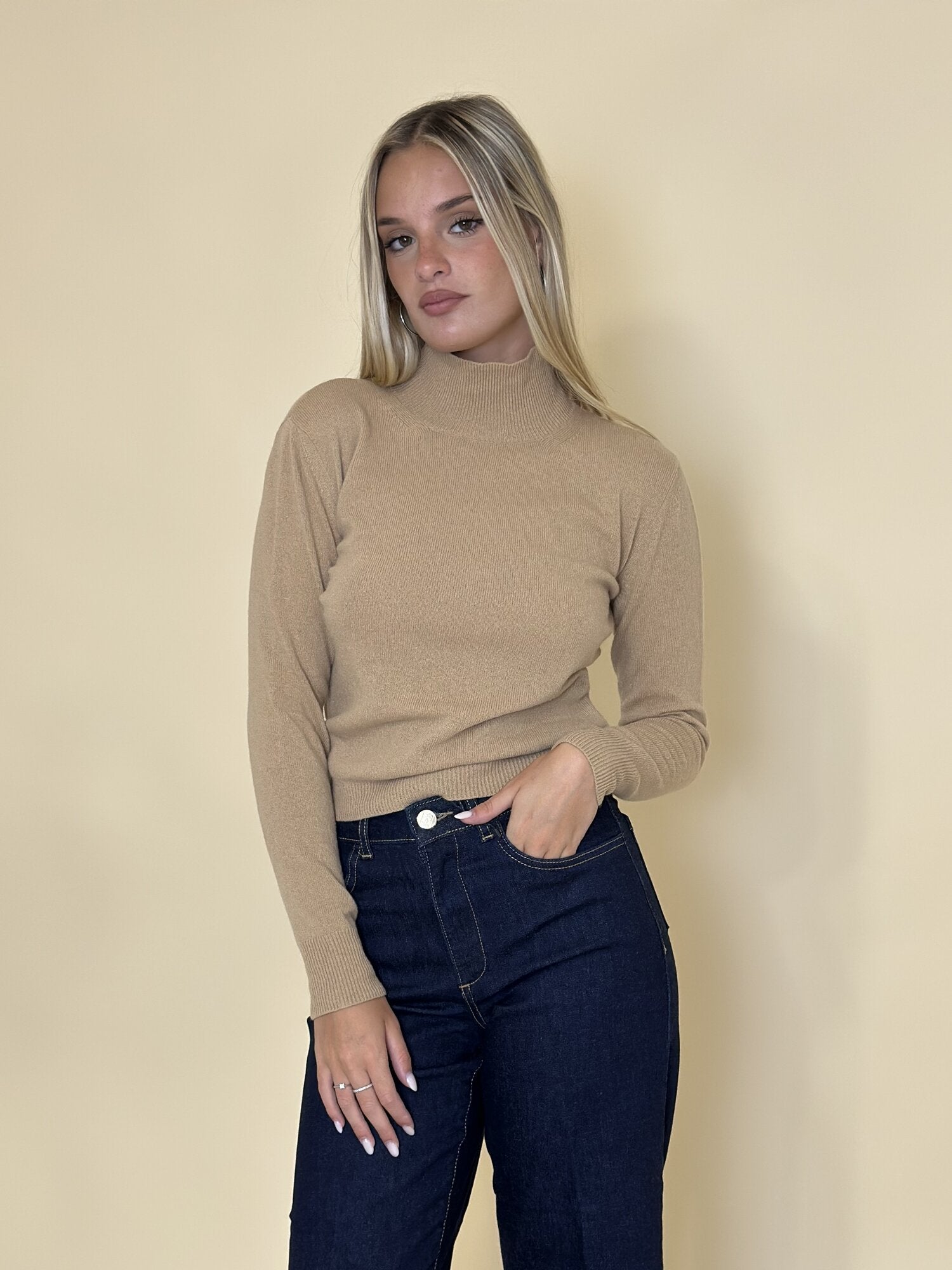 Maglia lupetto Vento cammello. Maglia a maniche lunghe in misto cachemire con scollo a lupetto. Vestibilità aderente. Disponibile in cammello.