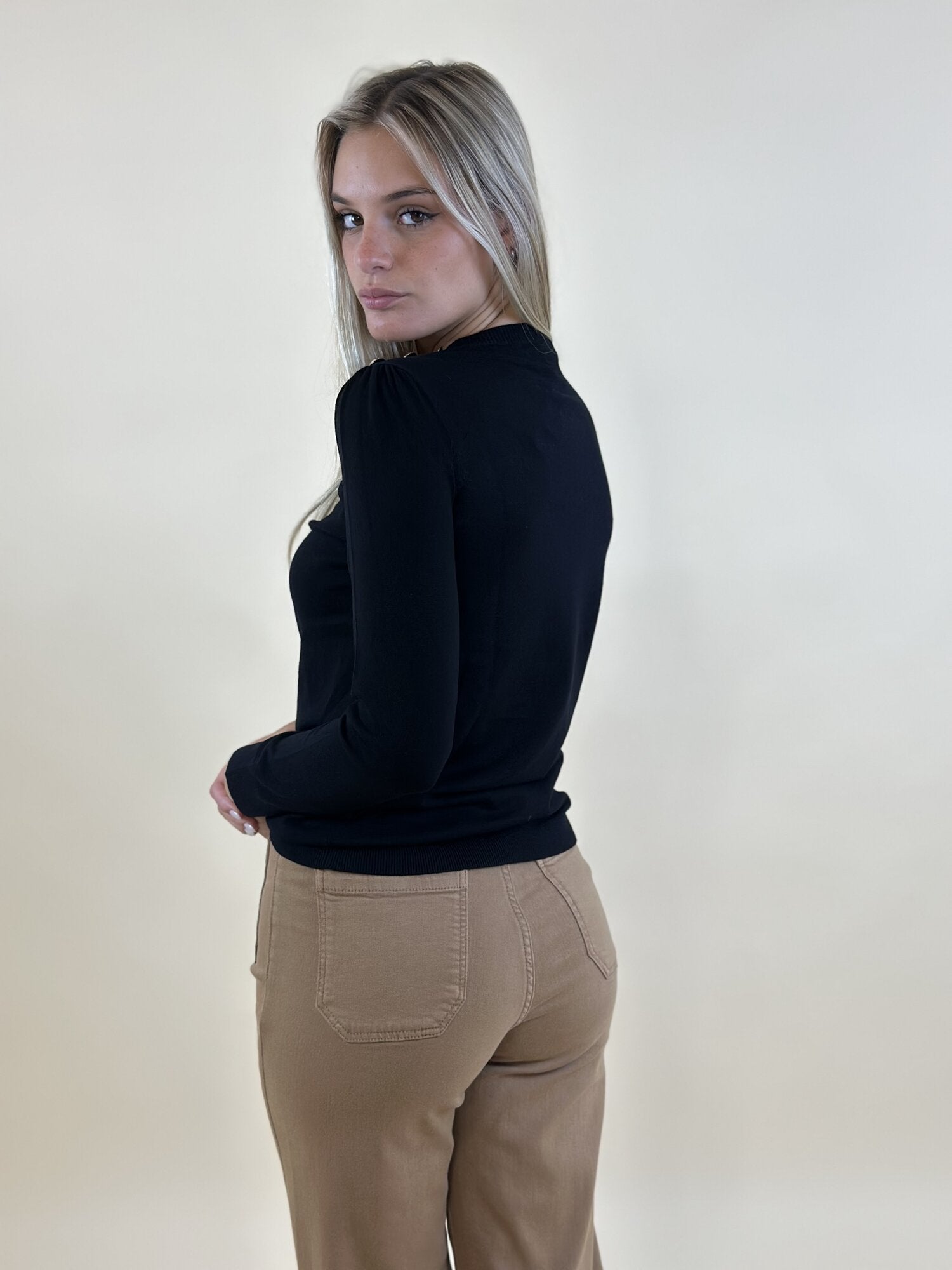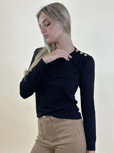 Maglia girocollo Mosca nero di Emme Marella. Maglia a maniche lunghe girocollo con bottoni dorati sulla spalla. Disponibile in ciclamino e nero.