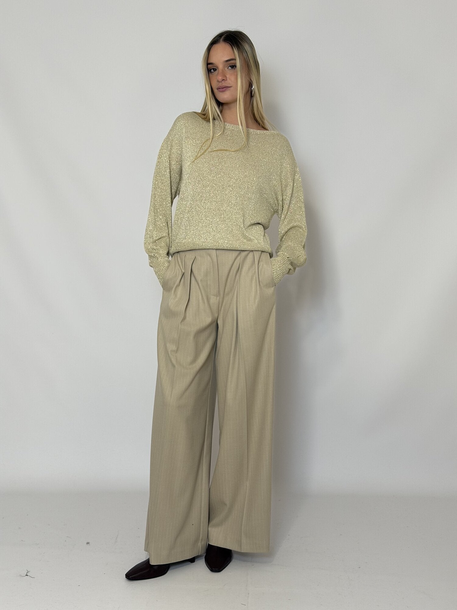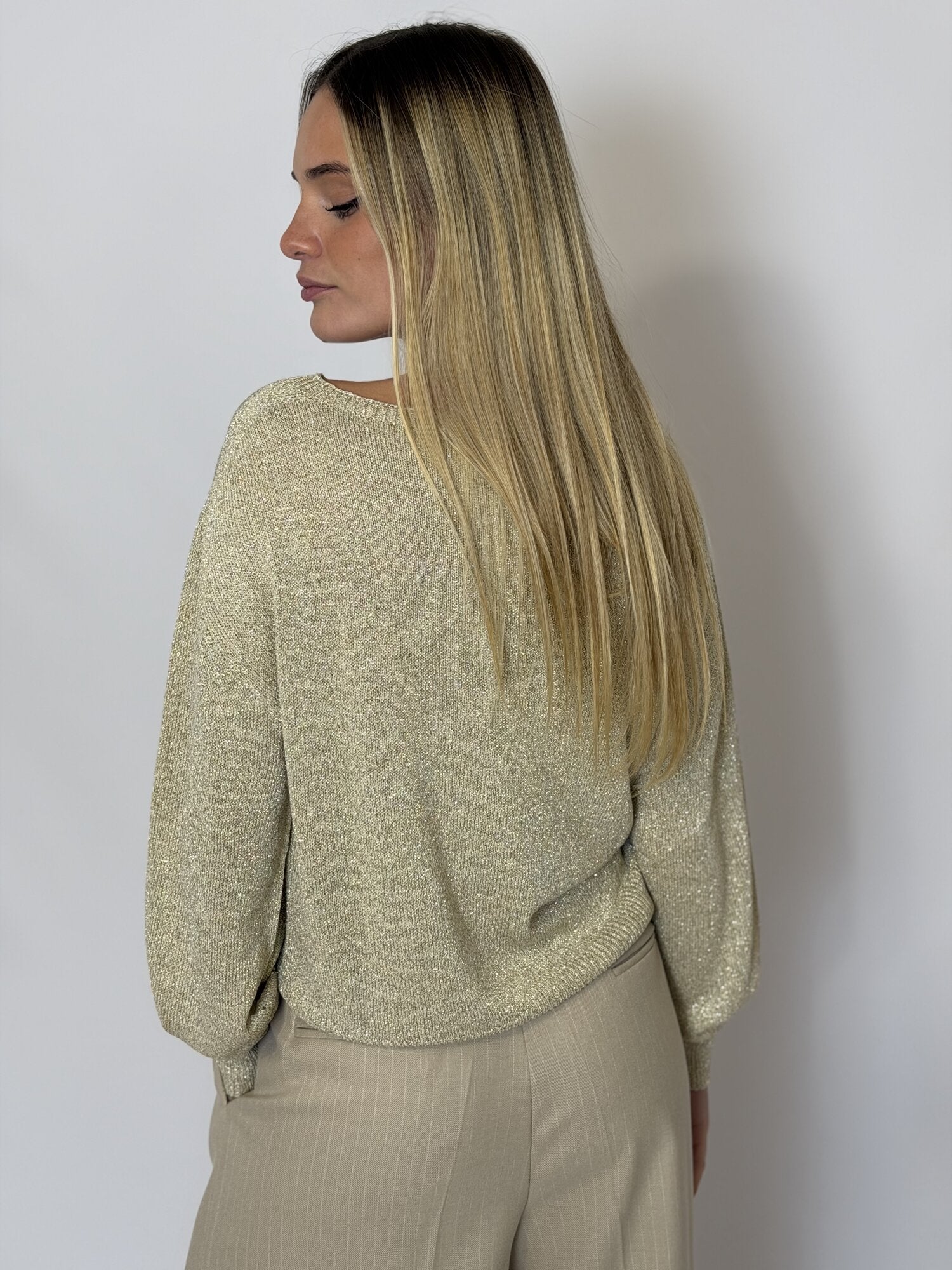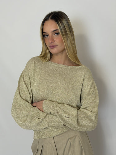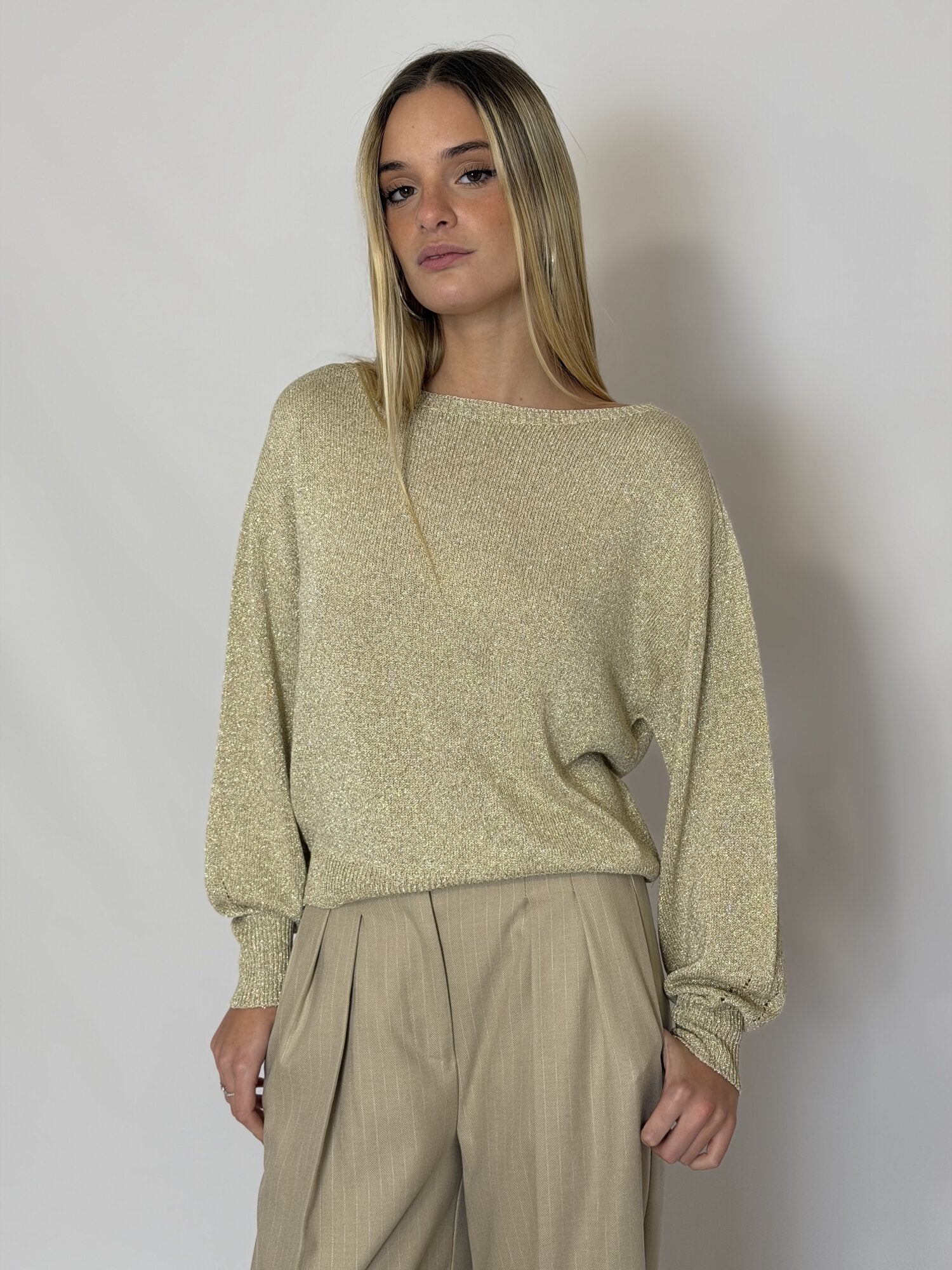 Maglia lurex Savoia oro di Emme Marella. Maglia in filato di viscosa e lurex. Fit regolare. Scollo a barca. Spalla scesa e manica a sbuffo. Disponibile in oro e bordeaux.