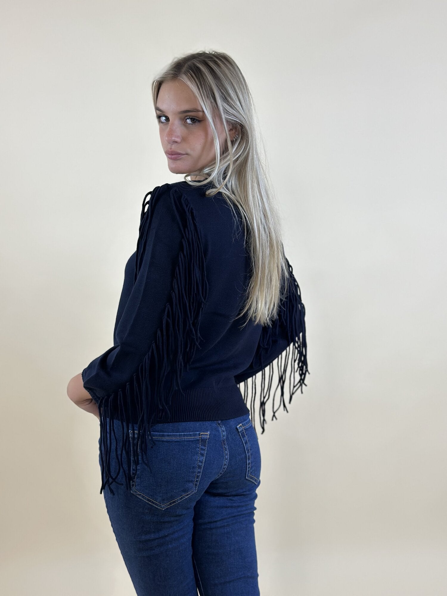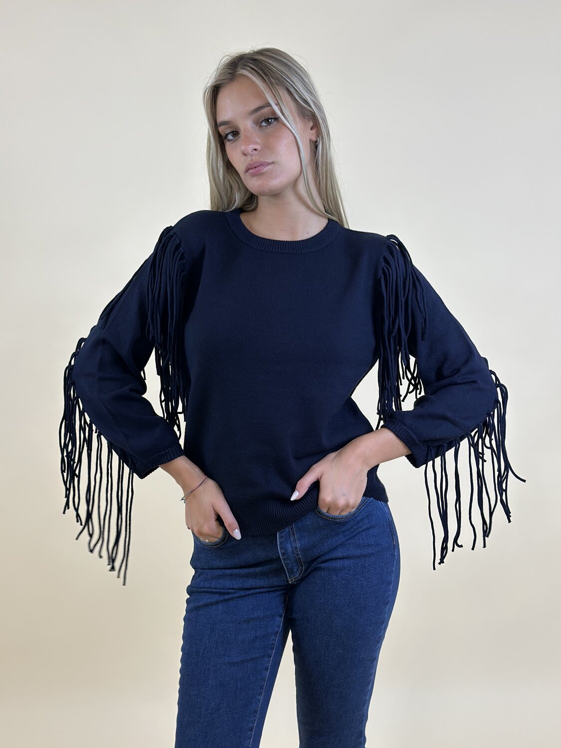 Maglione con frange Falco blu notte di Emme Marella. Maglione con scollo rotondo e frange decorative sulle maniche. Vestibilità morbida. Materiale lavorato a maglia, caldo e confortevole. Disponibile nel colore blu notte.
