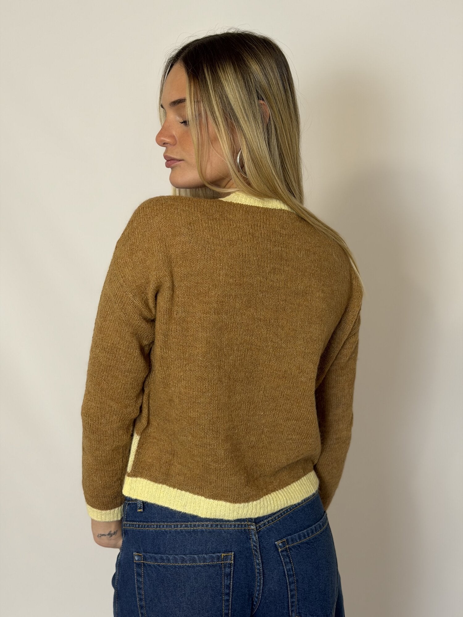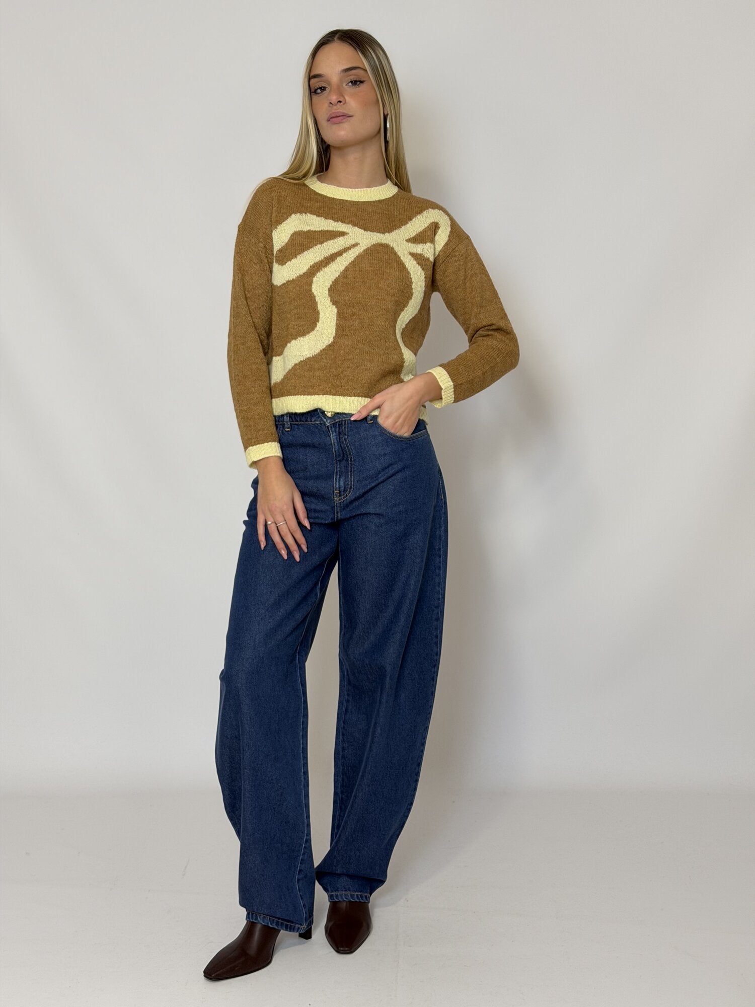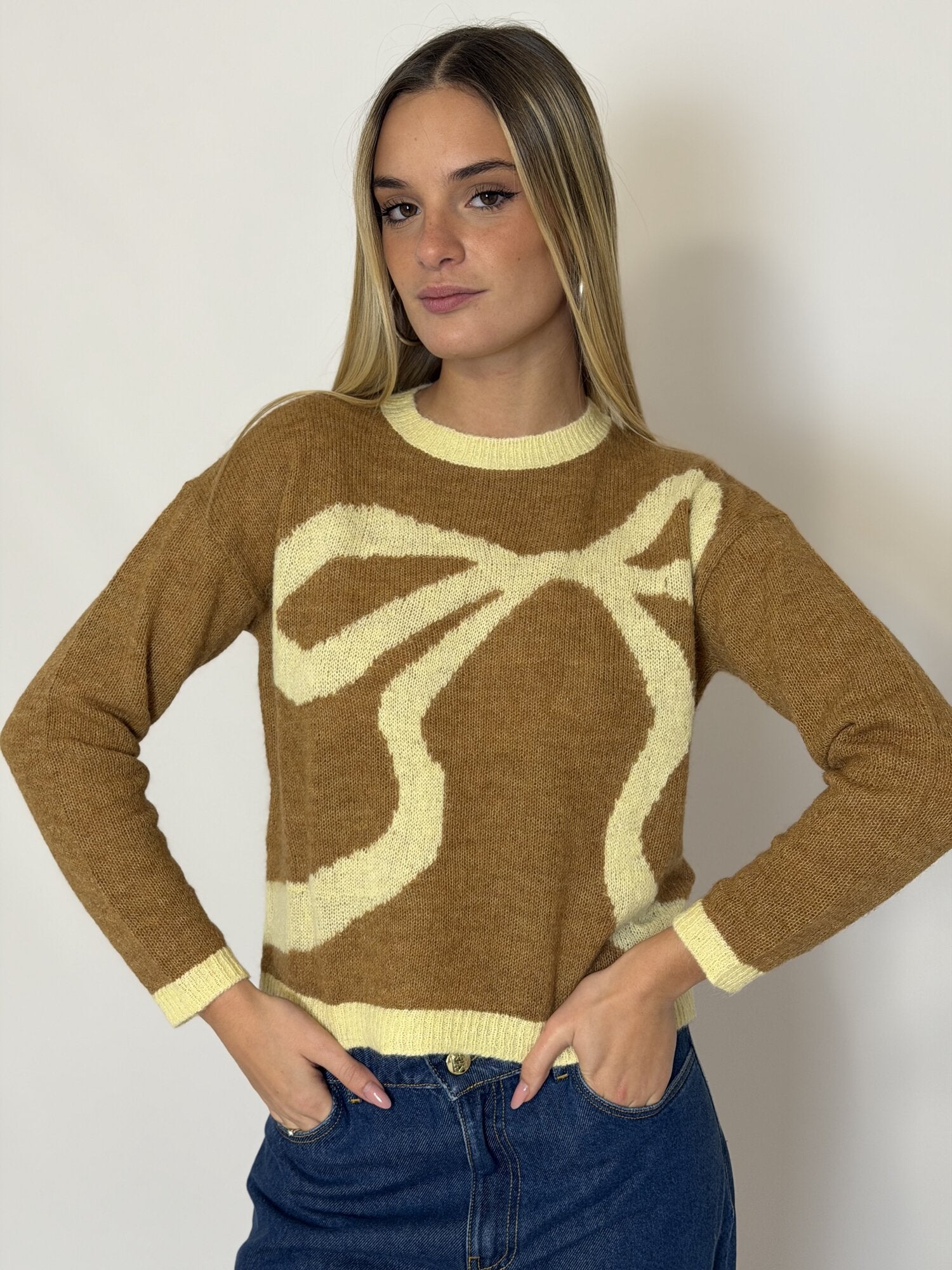 Pullover Romagna fantasia fiocco cammello di Emme Marella. Pullover girocollo a maniche lunghe. Fantasia geometrica a blocchi di colore sul busto e righe sulle maniche. Orlo dritto. Vestibilità comoda. Disponibile in cammello o multicolor.