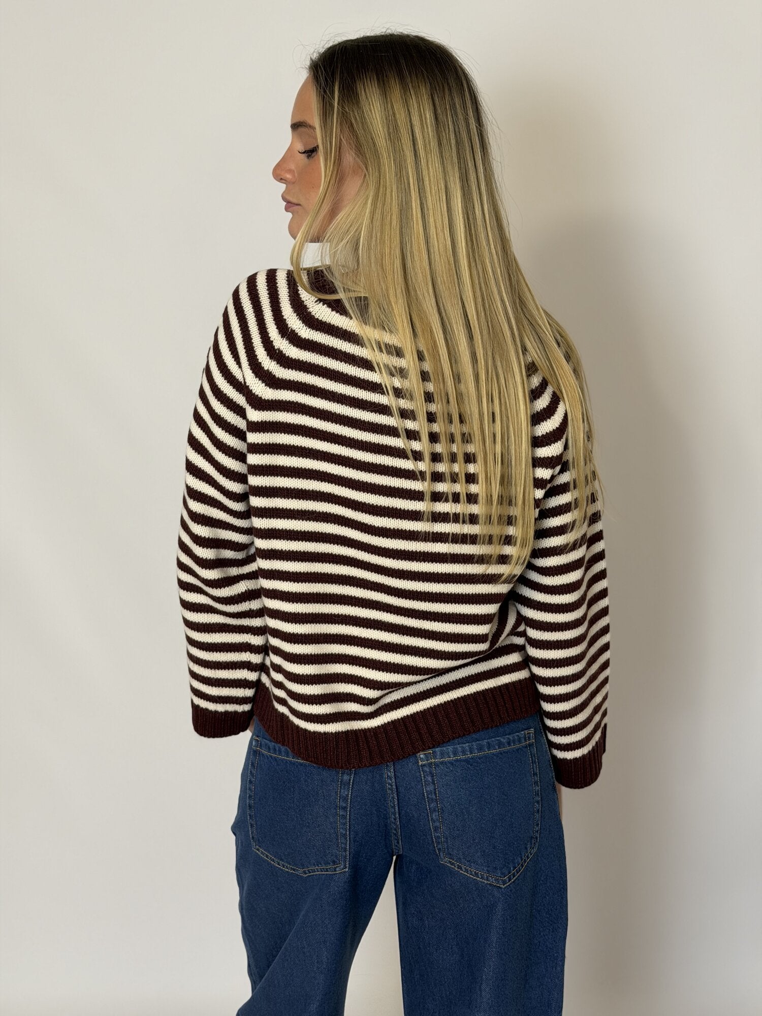 Pullover cropped a righe orizzontali bordeaux. Maglione in maglia con vestibilità cropped e maniche a lunghe ampie. Presenta scollo tondo a barca. Righe orizzontali. Disponibile in bordeaux e lilla.