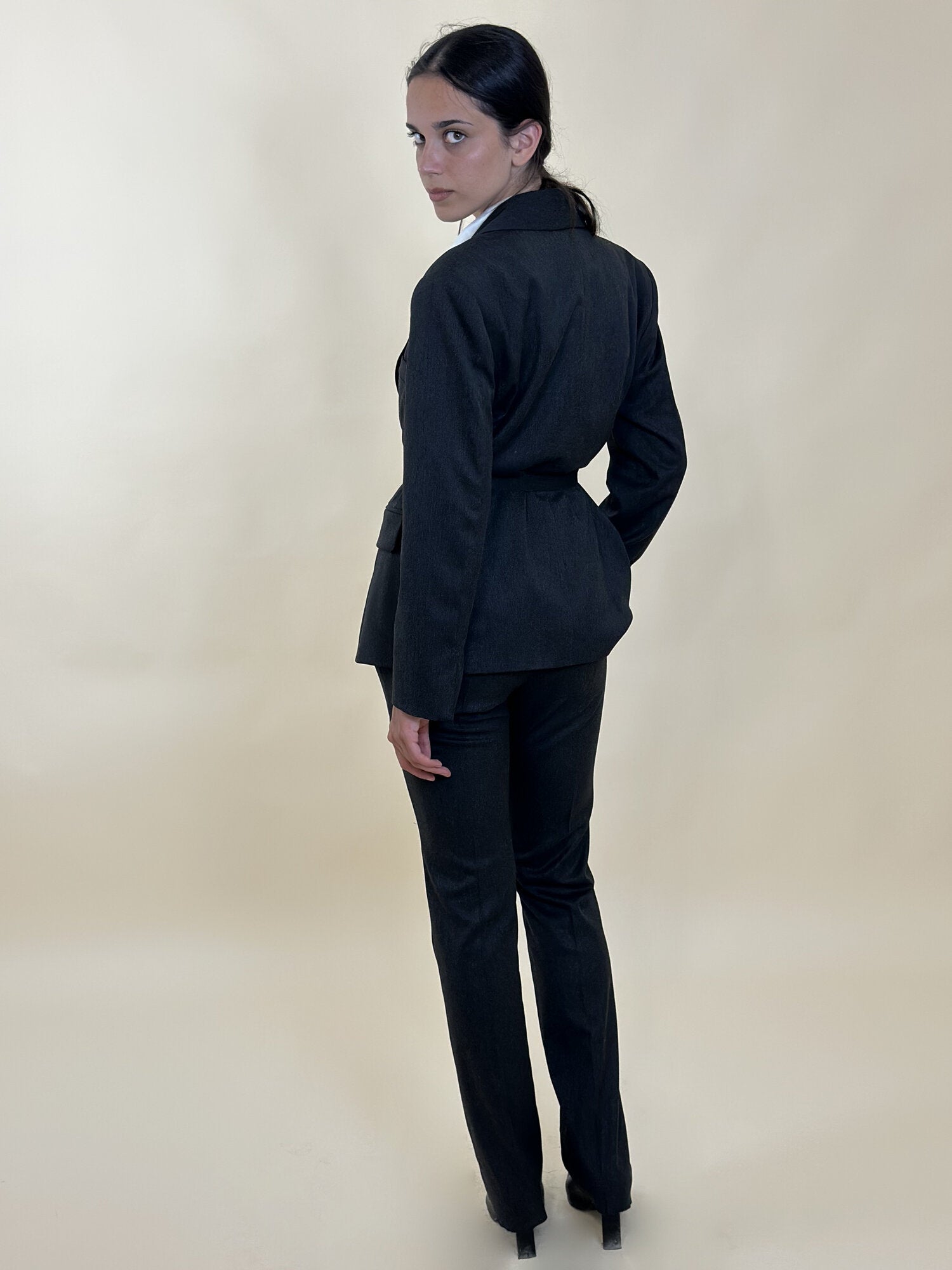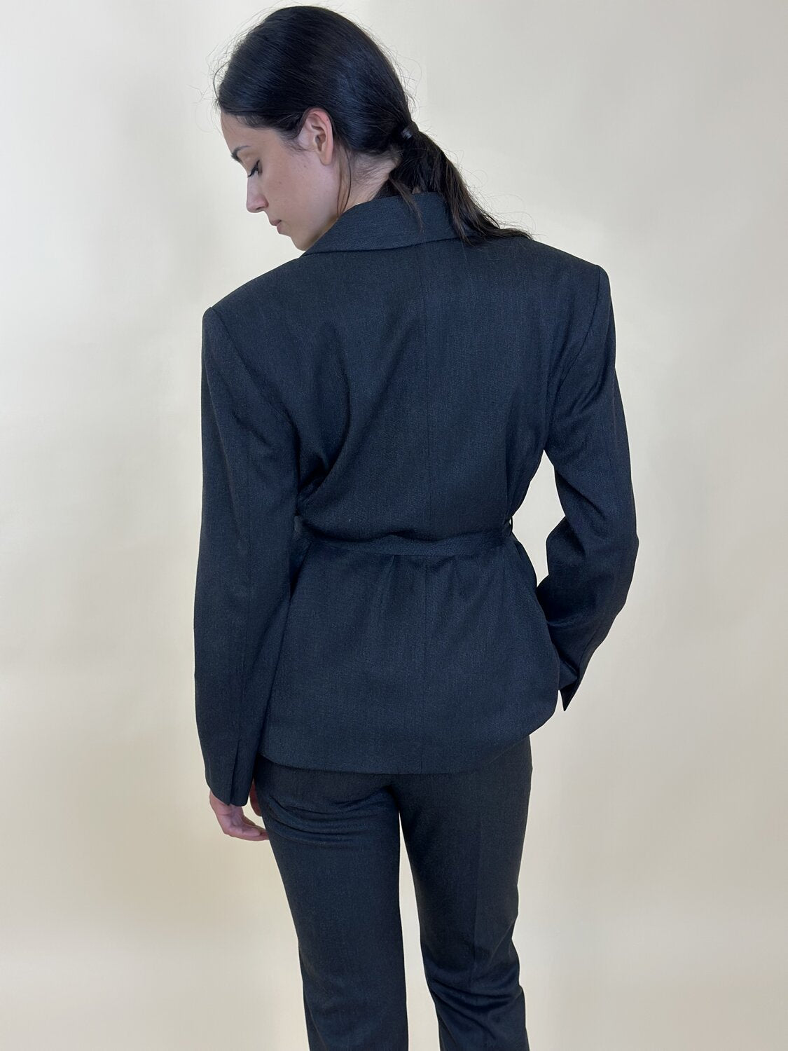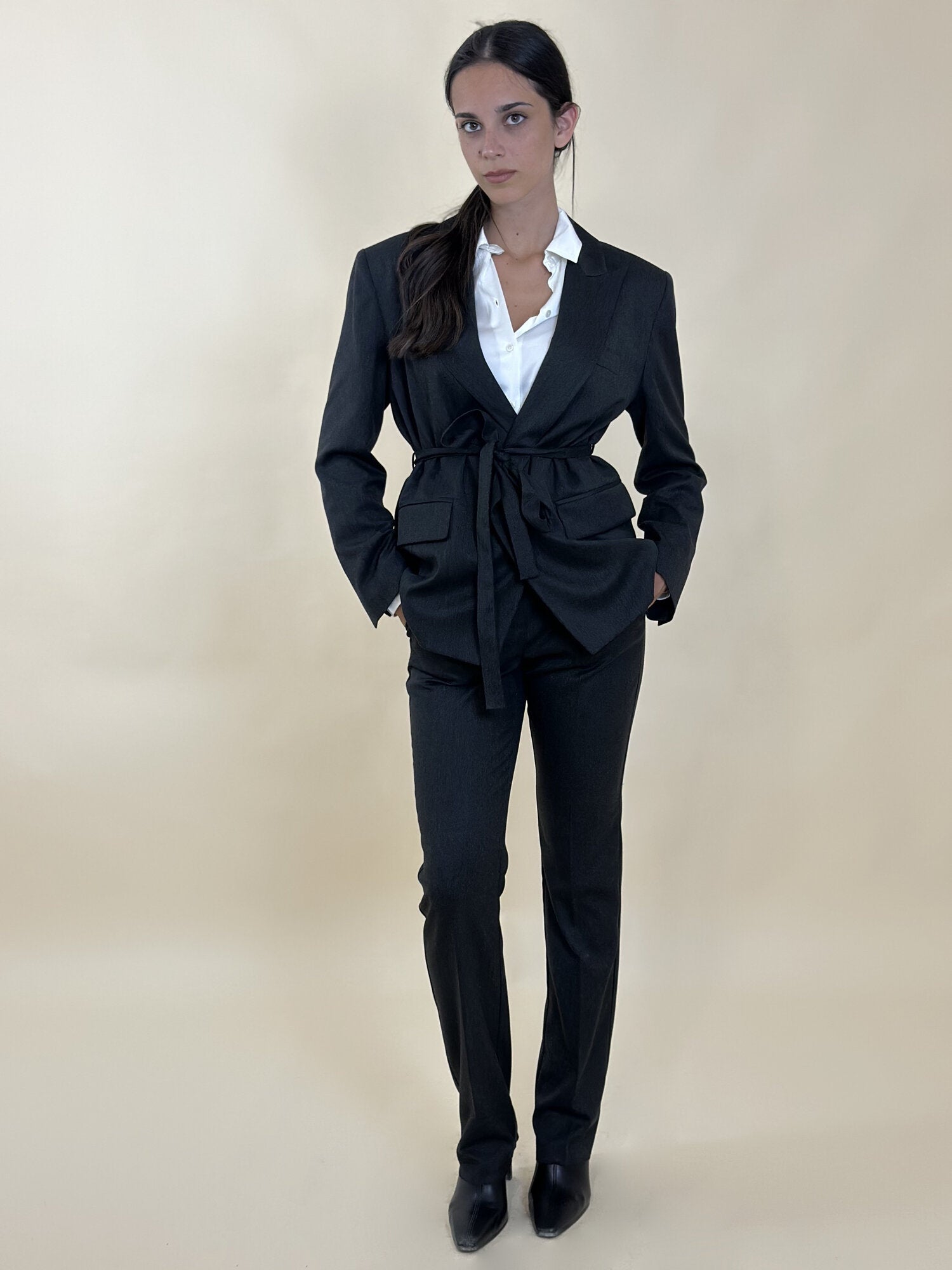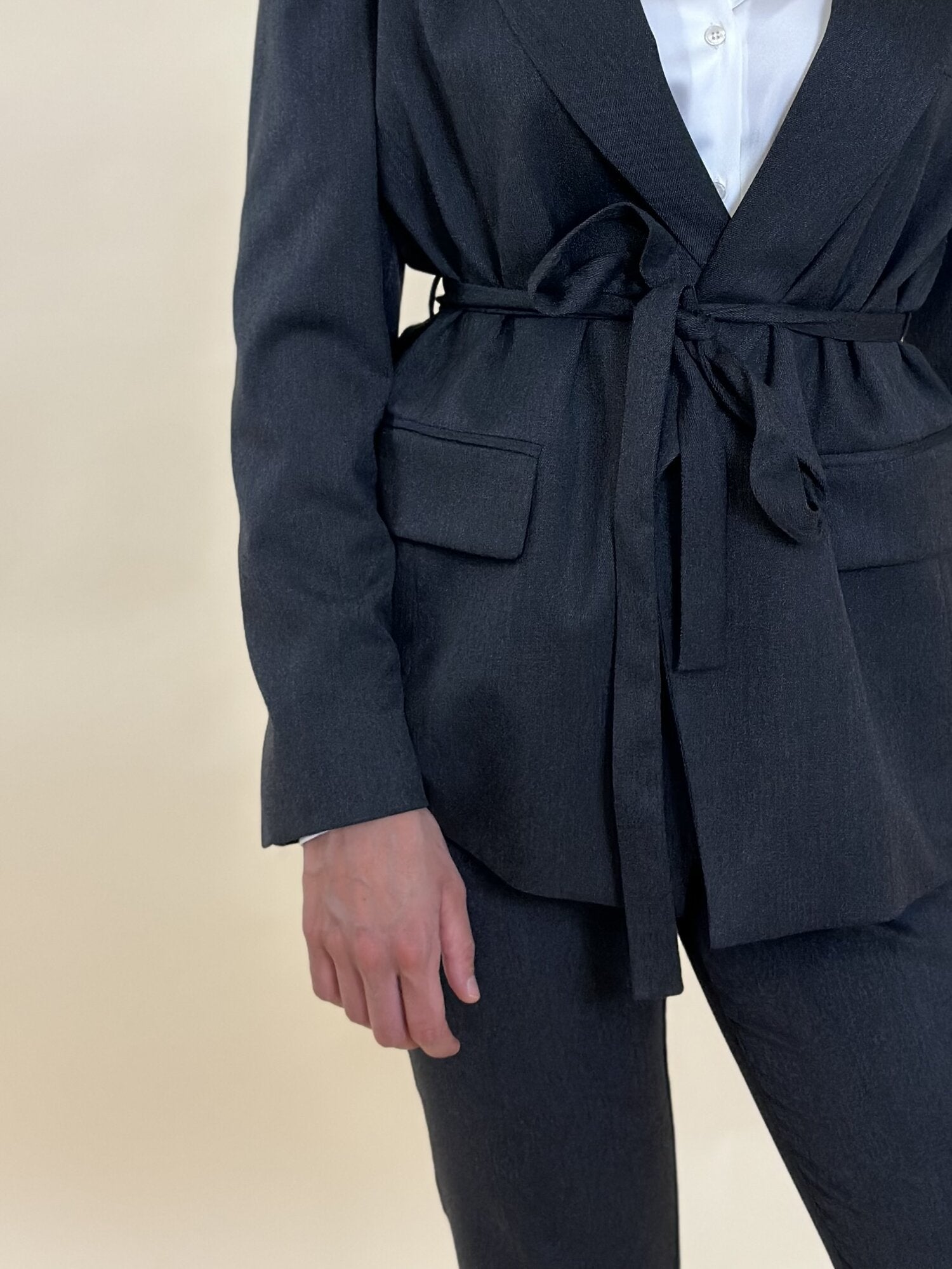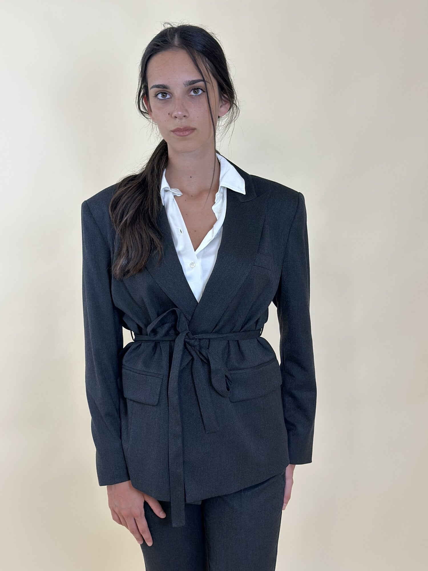 Giacca Val antracite di Emme Marella. Blazer in diagonale di misto viscosa stretch dal fit dritto. Scollo con rever a lancia. Chiusura doppio petto senza bottoni e con cintura in tessuto. Polsi con spacchetto. Capo foderato. Disponibile in antracite.