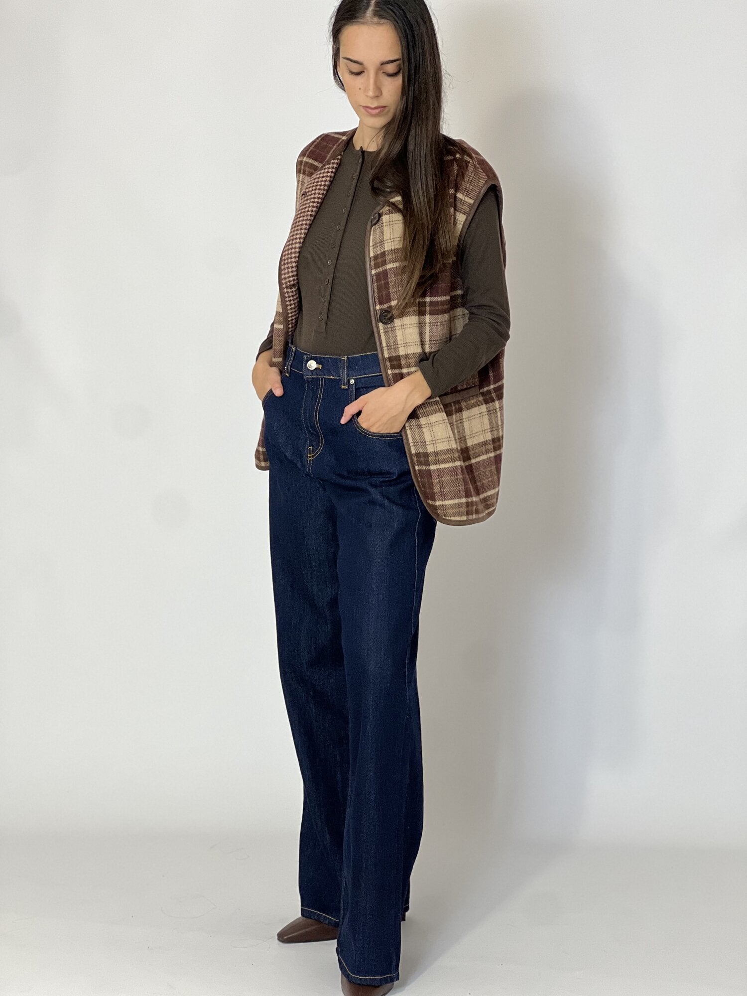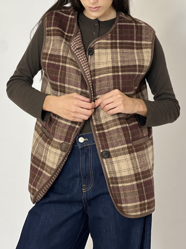 Gilet over a quadri di Vicolo. Gilet in lana con scollo a V e bottoni sul davanti. Fantasia scozzese e bordi a contrasto. Vestibilità morbida. Disponibile in fantasia a quadri scozzese nei toni del cammello, bordeaux e marrone.