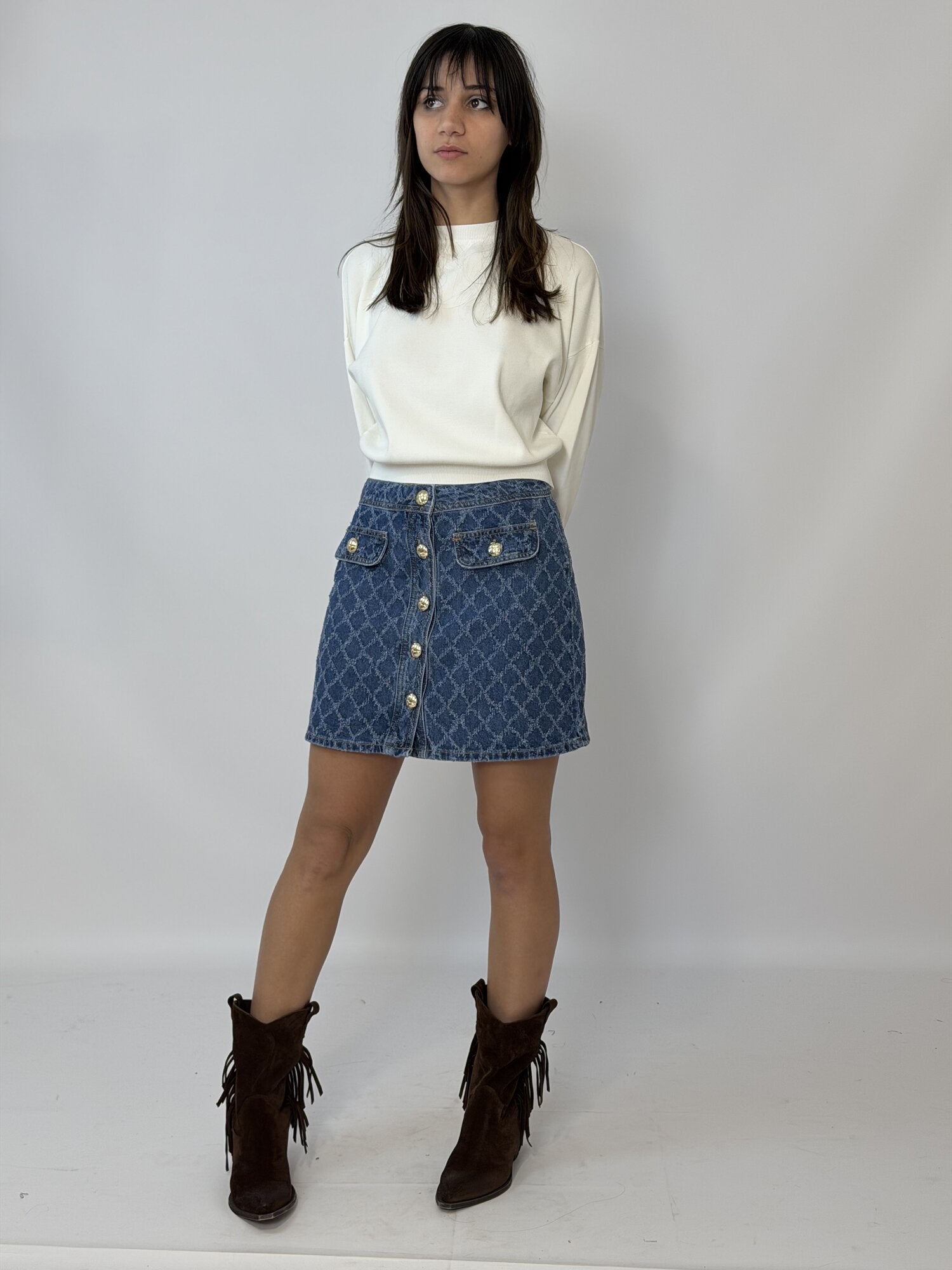 Mini gonna in denim di cotone. Fit regolare. Bottoni bijoux dorati. Patte applicate sul davanti. Lavorazione con laserature dal pattern a rombi.