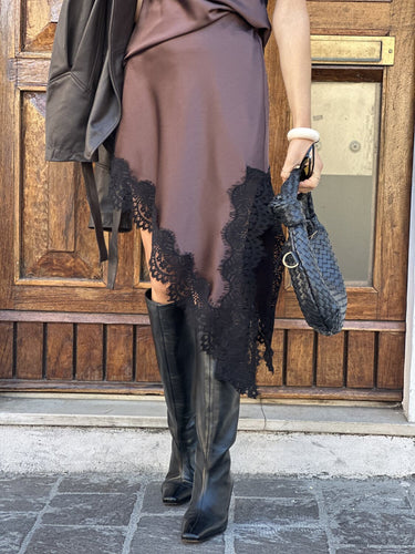 Gonna asimmetrica in raso con pizzo moro di Haveone. Gonna a vita alta con taglio dritto. Dettaglio in pizzo nero sulla parte inferiore. Lunghezza al ginocchio asimmetrica. Vestibilità aderente. Materiale in raso. Disponibile nel colore verde oliva e moro.