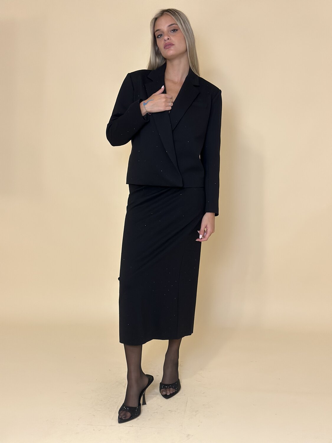 Gonna midi con strass nero di Meimei J. Gonna a tubino con spacco laterale. Piccoli strass sparsi su tutta la superficie. Vestibilità aderente. Tessuto strutturato. Disponibile nel colore nero.