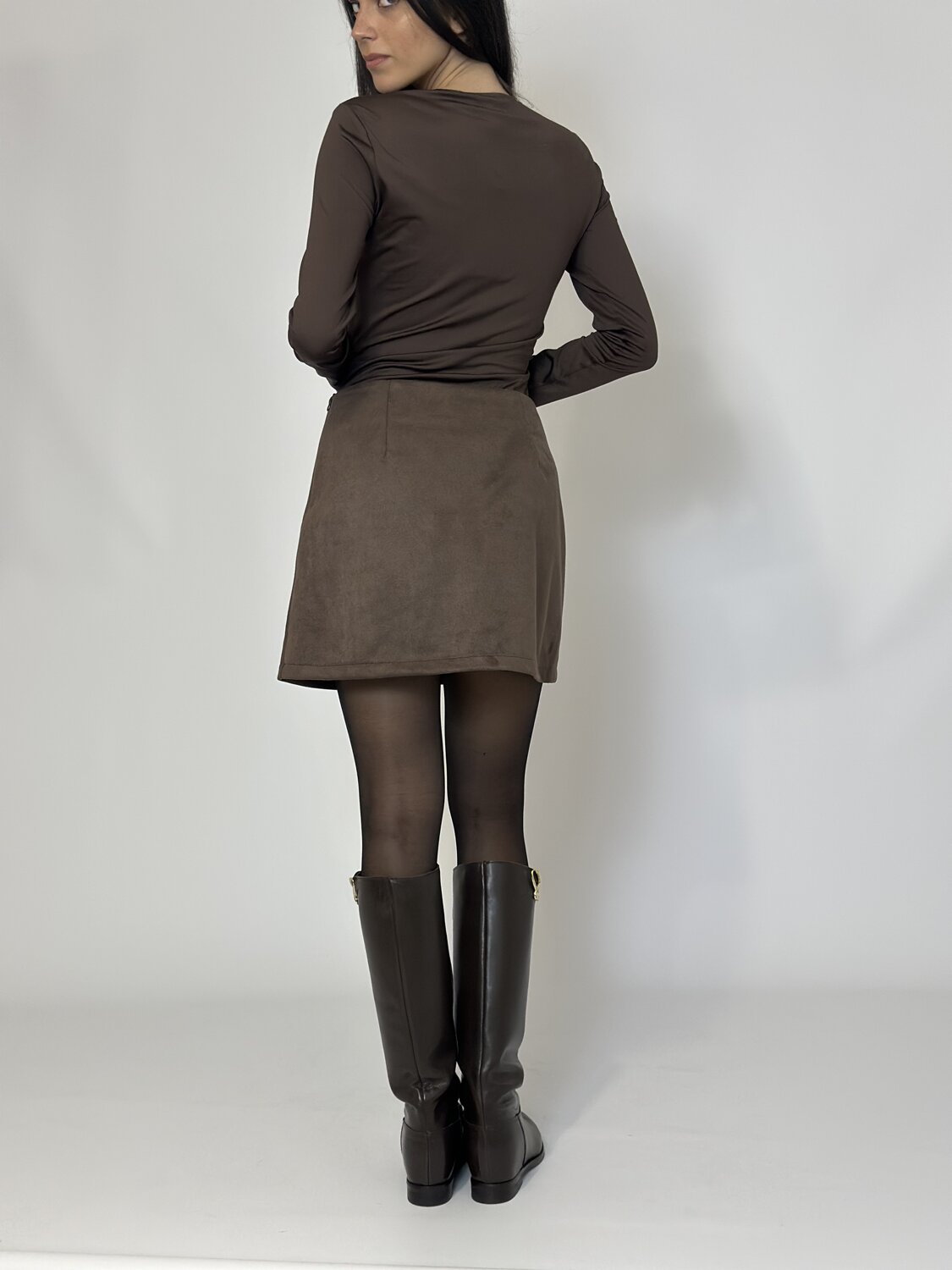 Minigonna daino moro di Haveone. Minigonna in tessuto daino con vita alta. Vestibilità aderente e taglio ad A. Chiusura con cerniera laterale. Disponibile moro, fango e nero.
