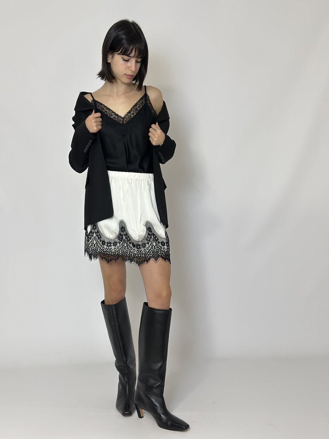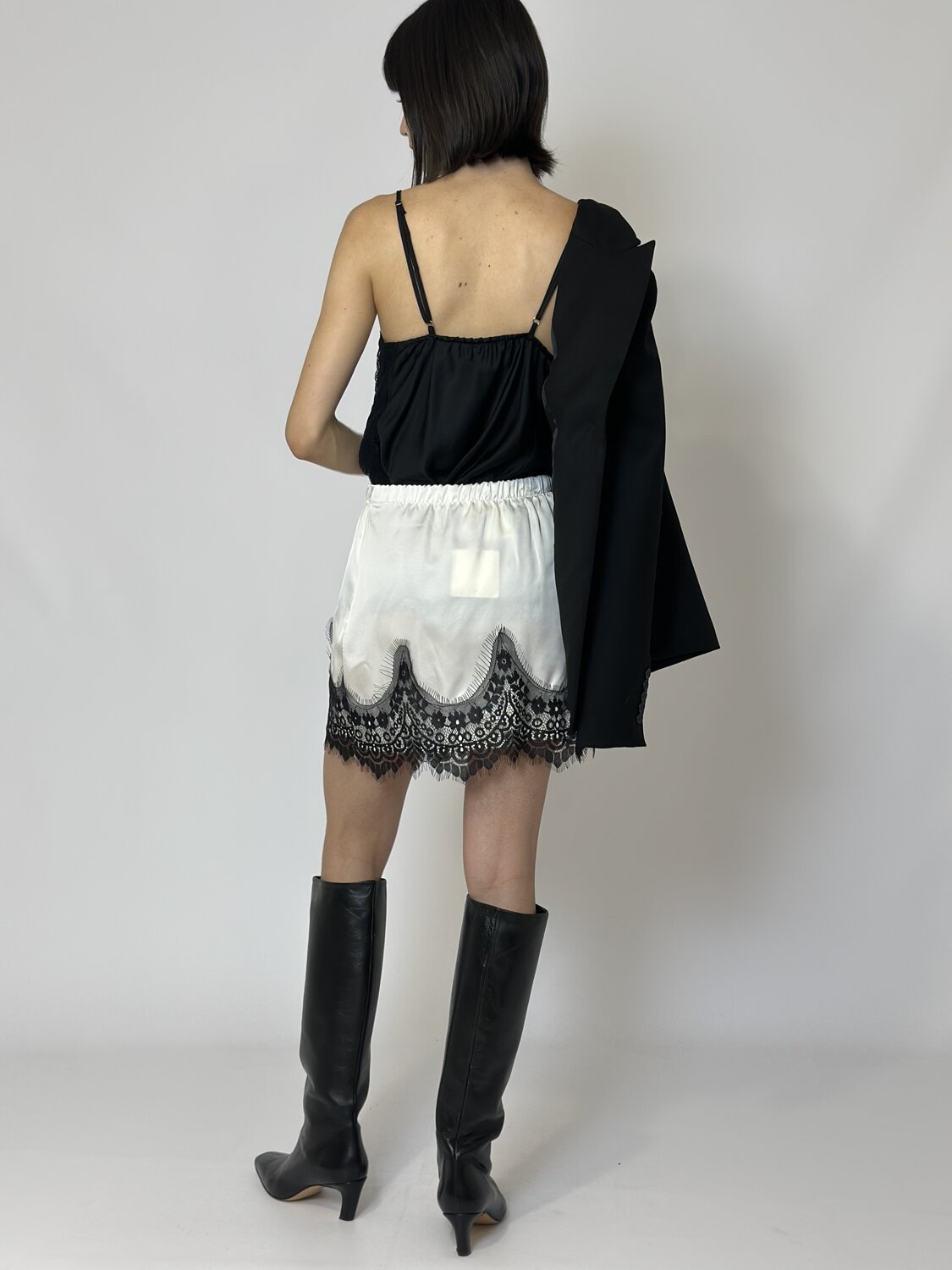Minigonna lingerie panna di Vicolo. Minigonna in raso con vita elasticizzata e vestibilità morbida. Dettaglio di pizzo sul fondo con orlo smerlato a contrasto. Disponibile panna e moro.
