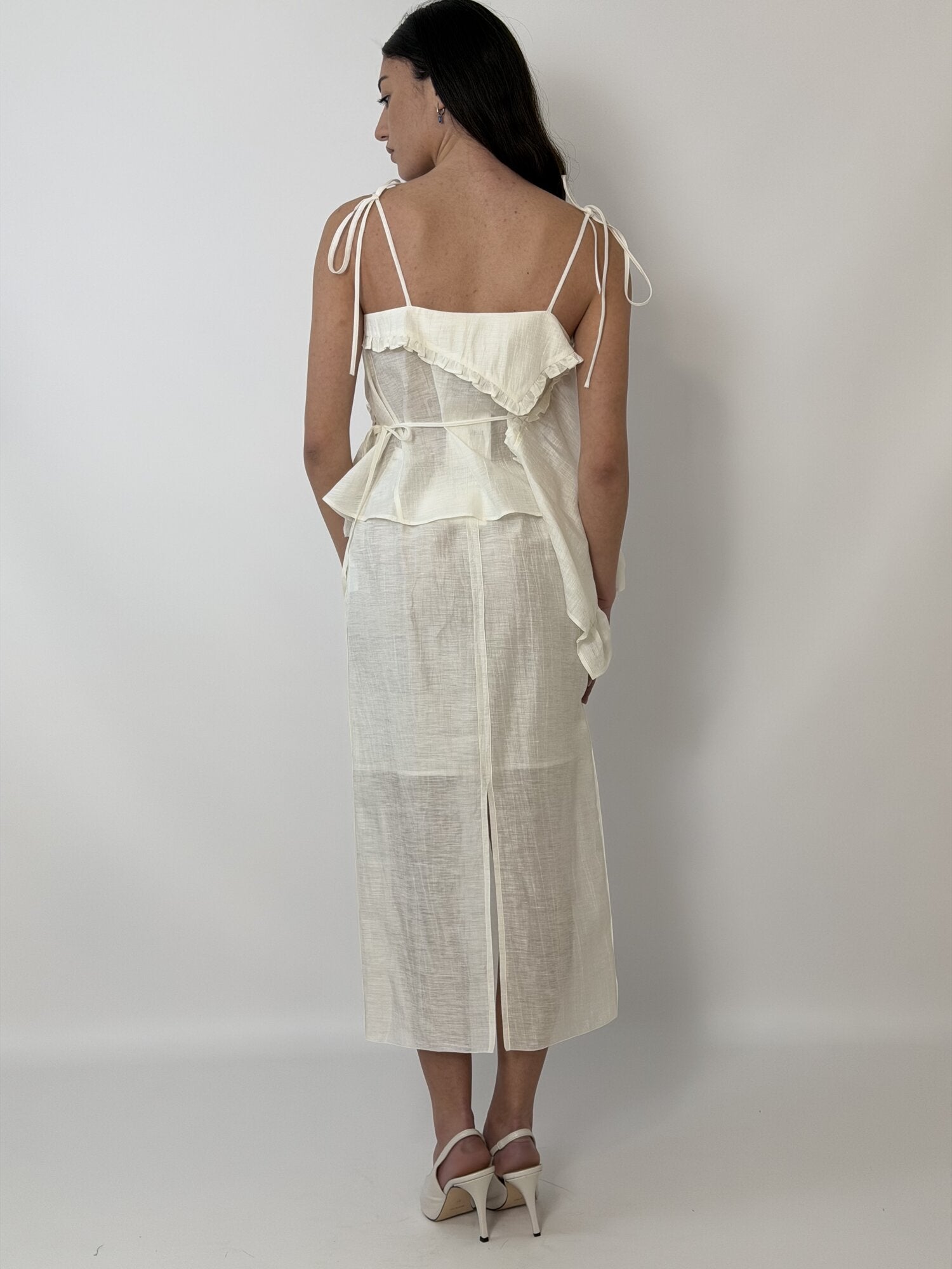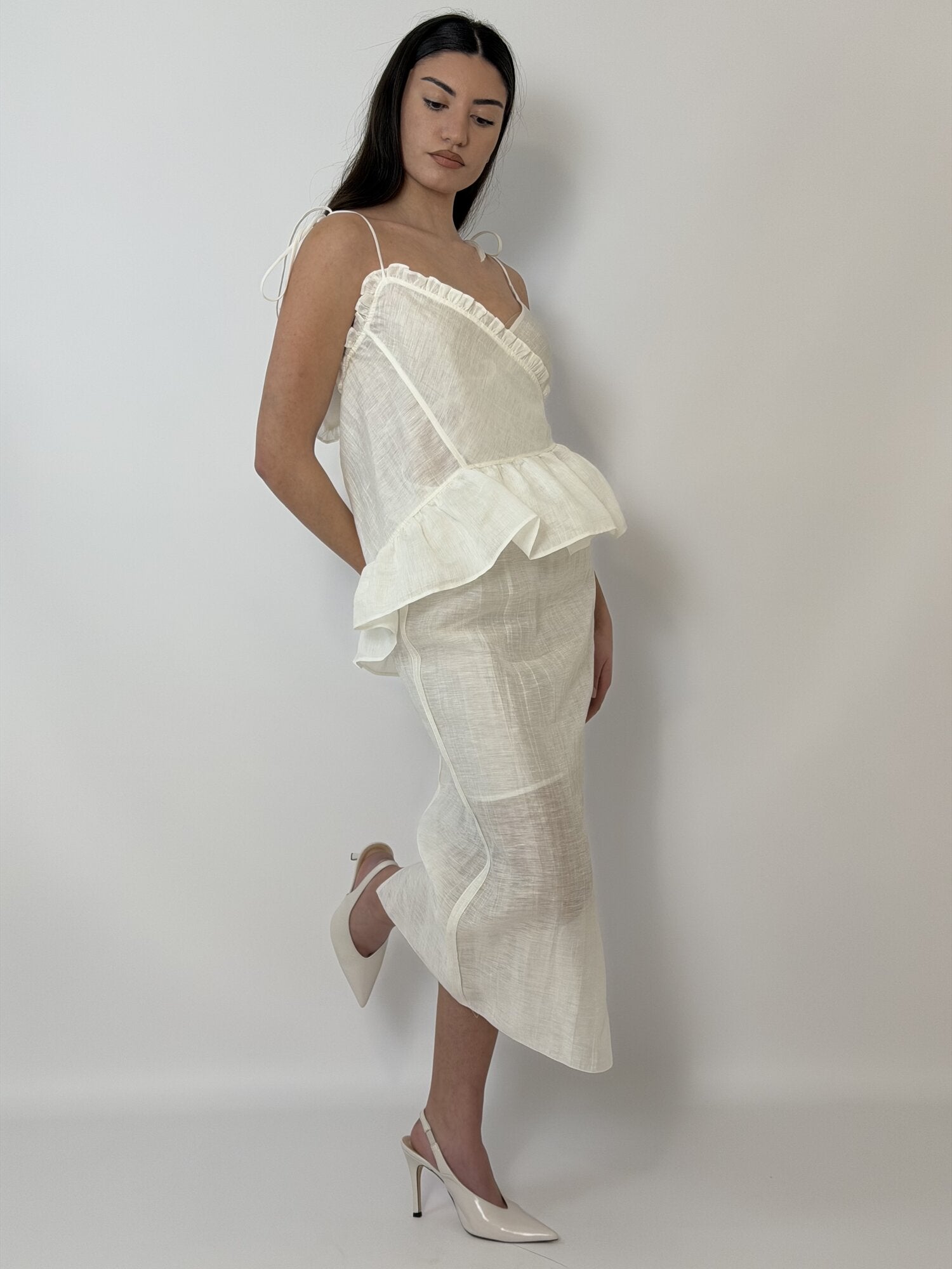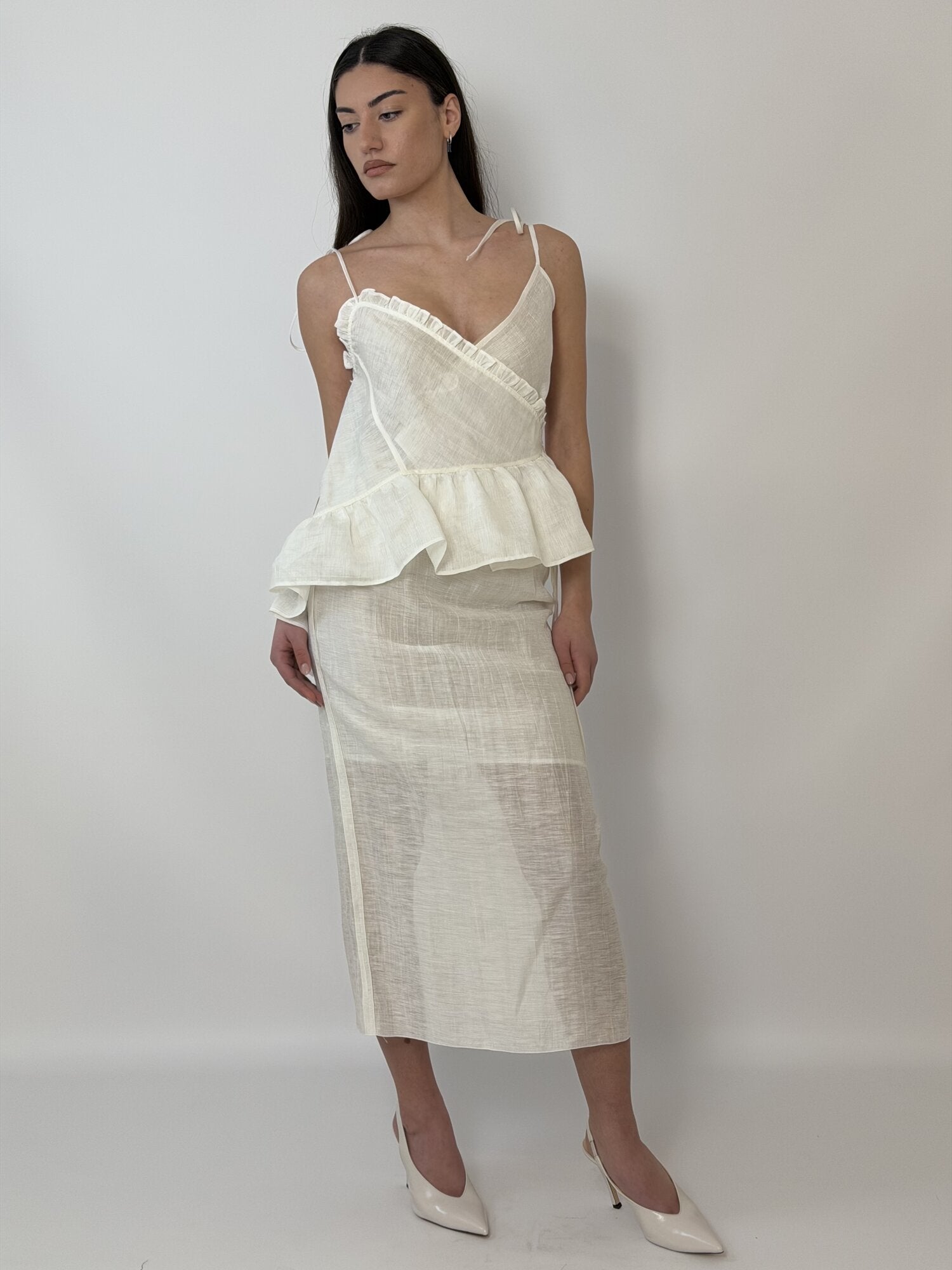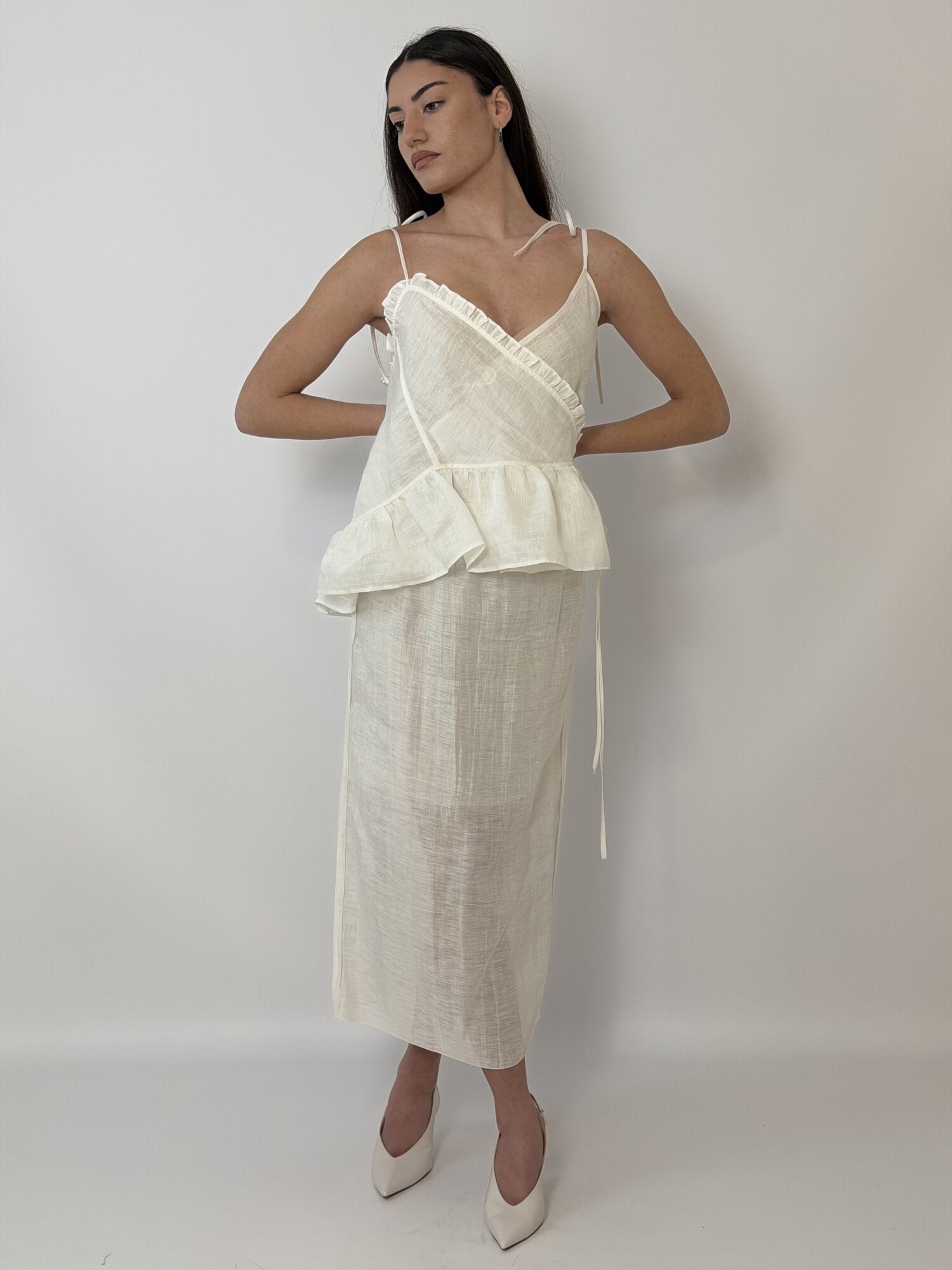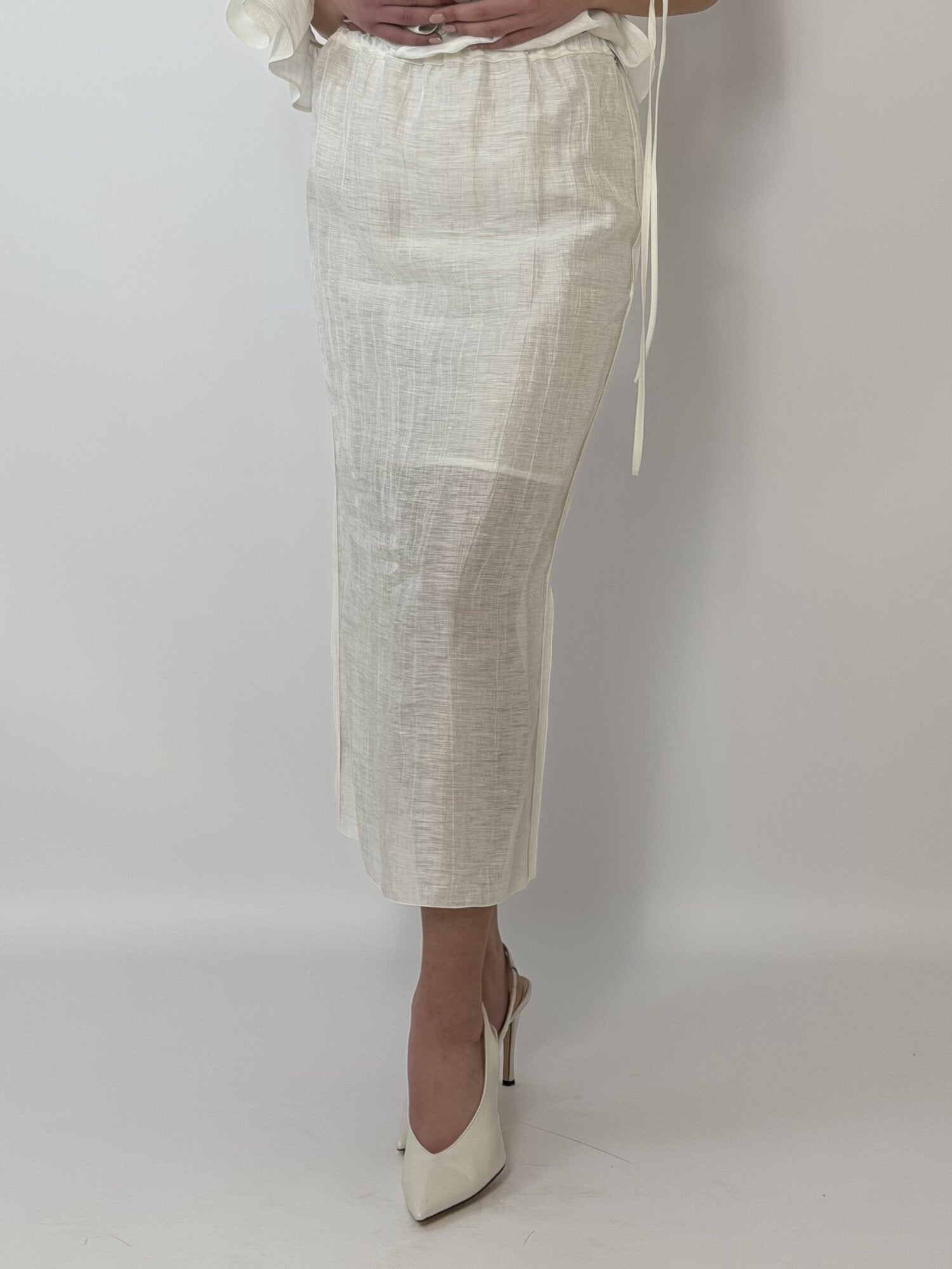 Gonna Midi Elastico Panna di MeimeiJ. Gonna midi dal design essenziale e raffinato, caratterizzata da una linea dritta che scivola armoniosamente lungo la silhouette. Il tessuto leggero e materico dona un effetto naturale e sofisticato, perfetto per look estivi eleganti e contemporanei.