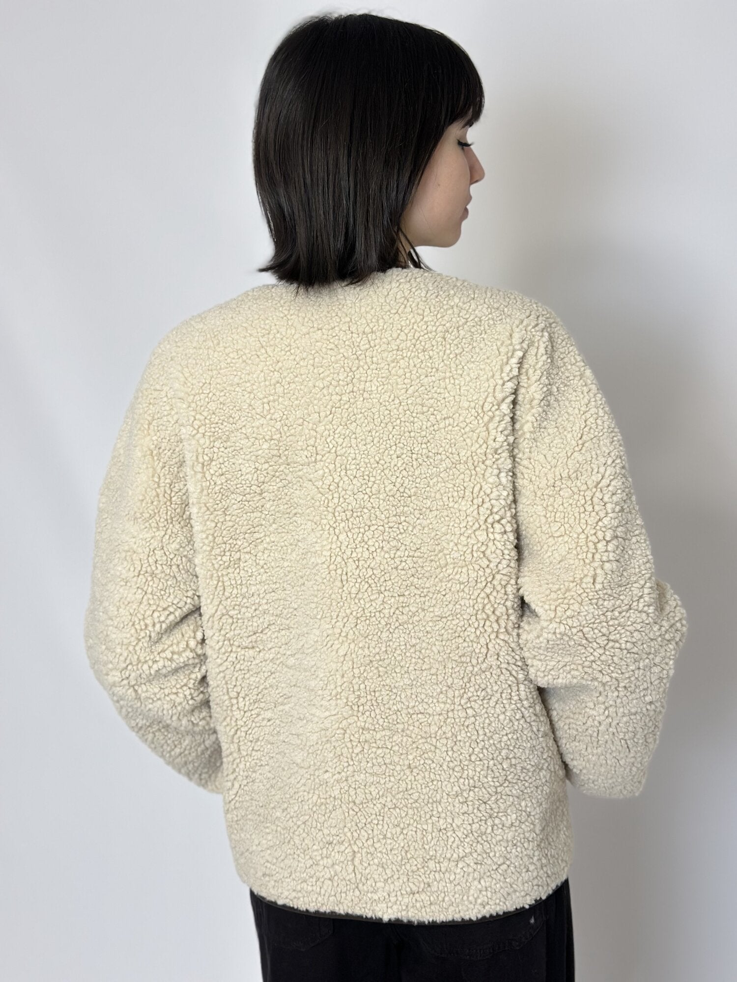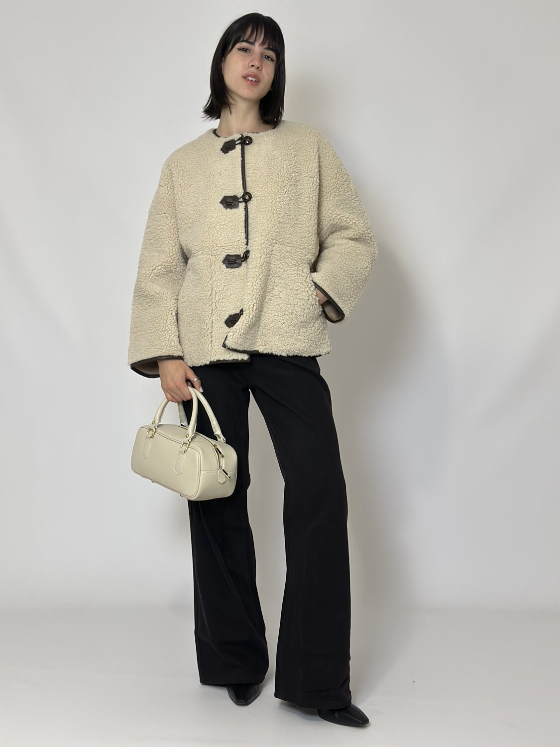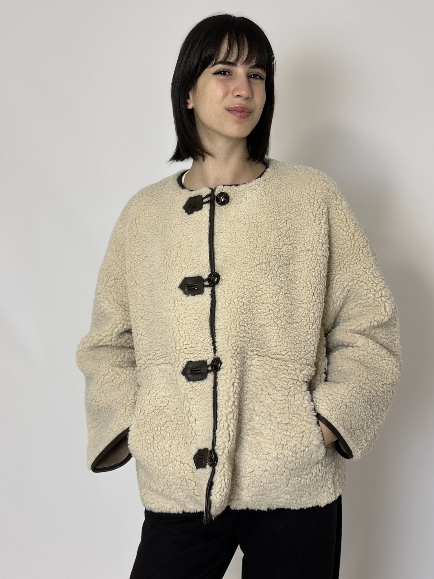 Ecomontone Simon beige di Grace & Mila. Cappotto in finto shearling. Stile cappotto teddy. Vestibilità oversize. Maniche lunghe. Scollo rotondo. Apertura frontale con chiusure con fibbie a contrasto e bottoni intrecciati. Tasche frontali. Dettaglio di profili a contrasto sul davanti, sul colletto, sulle tasche e sul fondo delle maniche. Disponibile nel colore beige.
