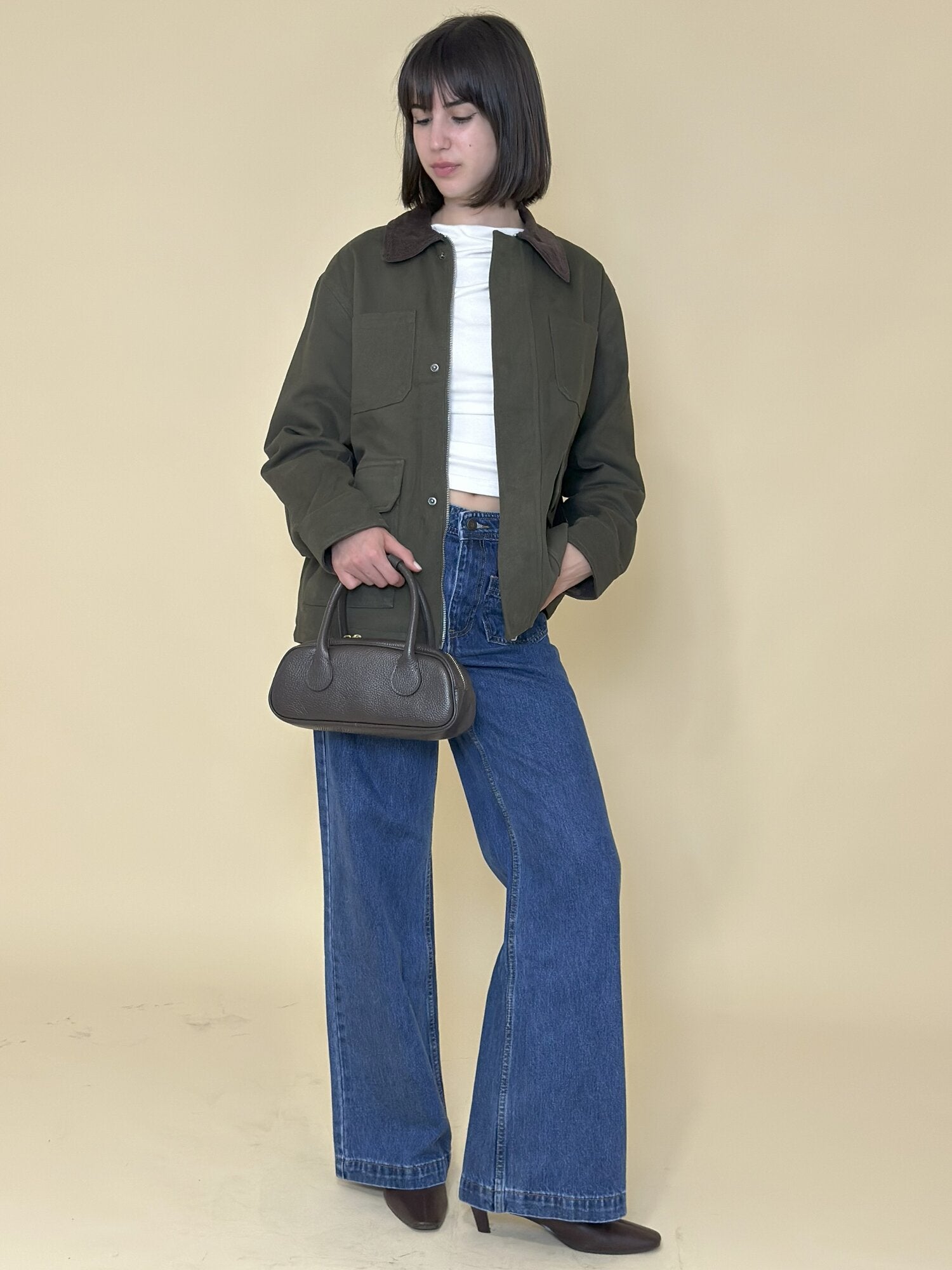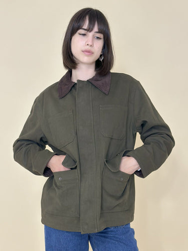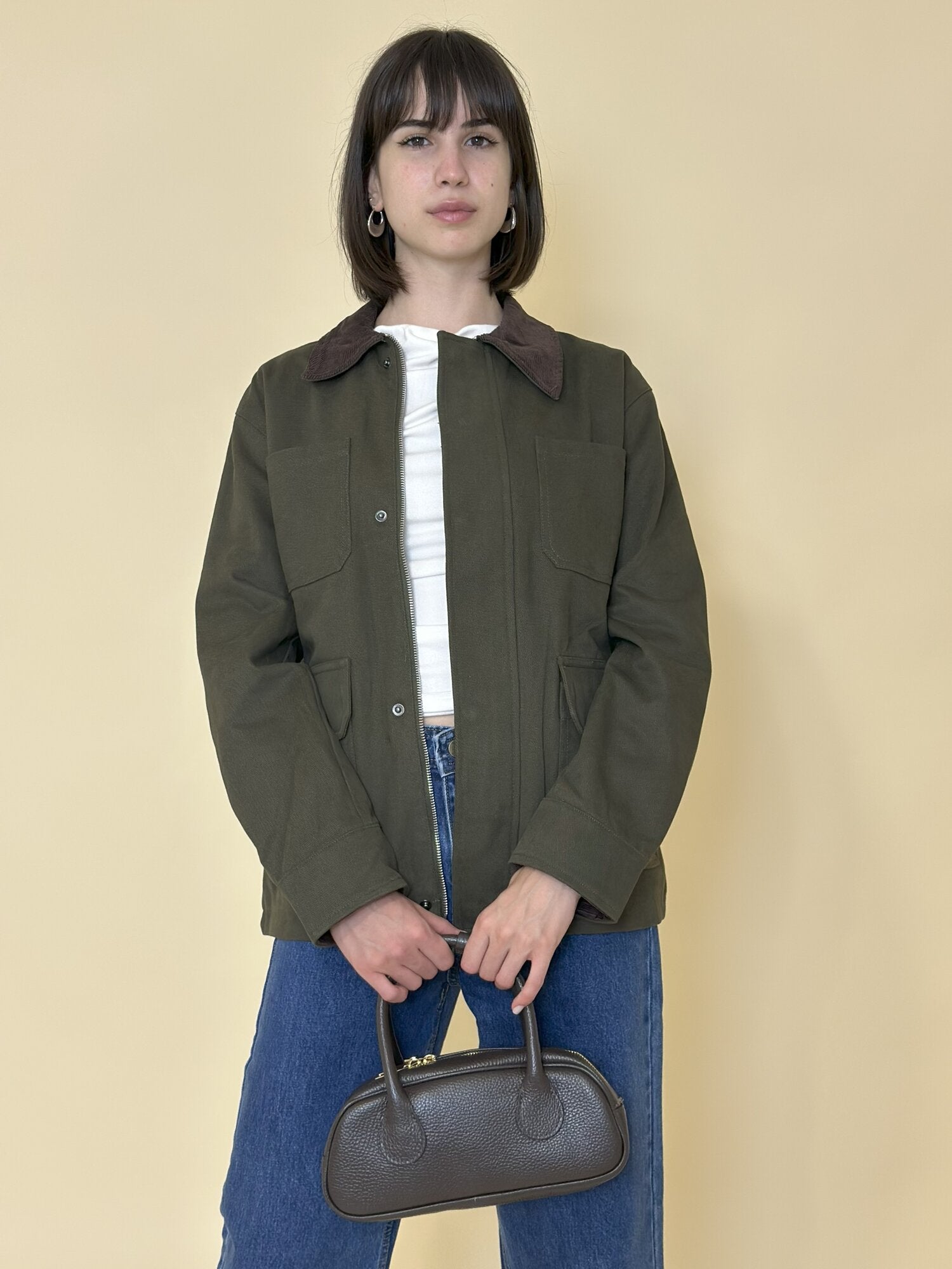 Giaccone Tasconi Soraya Verde Militare di Grace & Mila. Giacca dalla vestibilità over con maniche lunghe e polsini abbottonati. Colletto classico a camicia a contrasto in velluto a coste. Chiusura con cerniera frontale nascosta. Quattro tasche applicate sul davanti. Foderato con morbida imbottitura. Disponibile in verde militare.