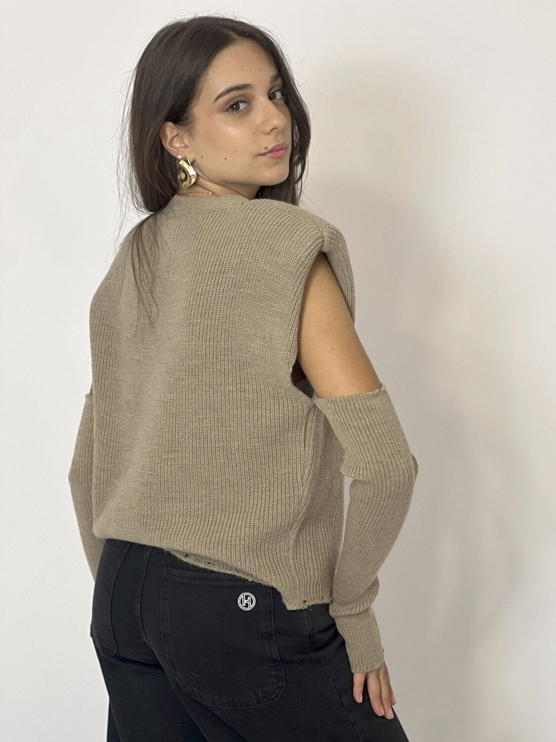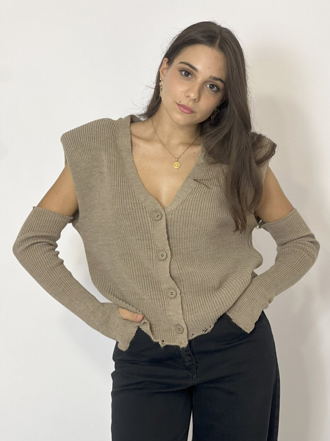 Gilet Manicotti Beige di Haveone. Gilet in maglia a costine con spalline imbottite e chiusura monopetto con bottoni. Scollo a V. Fondo effetto distressed. Manicotti a costine da indossare a guanto. Taglia unica. Disponibile in panna e beige.
