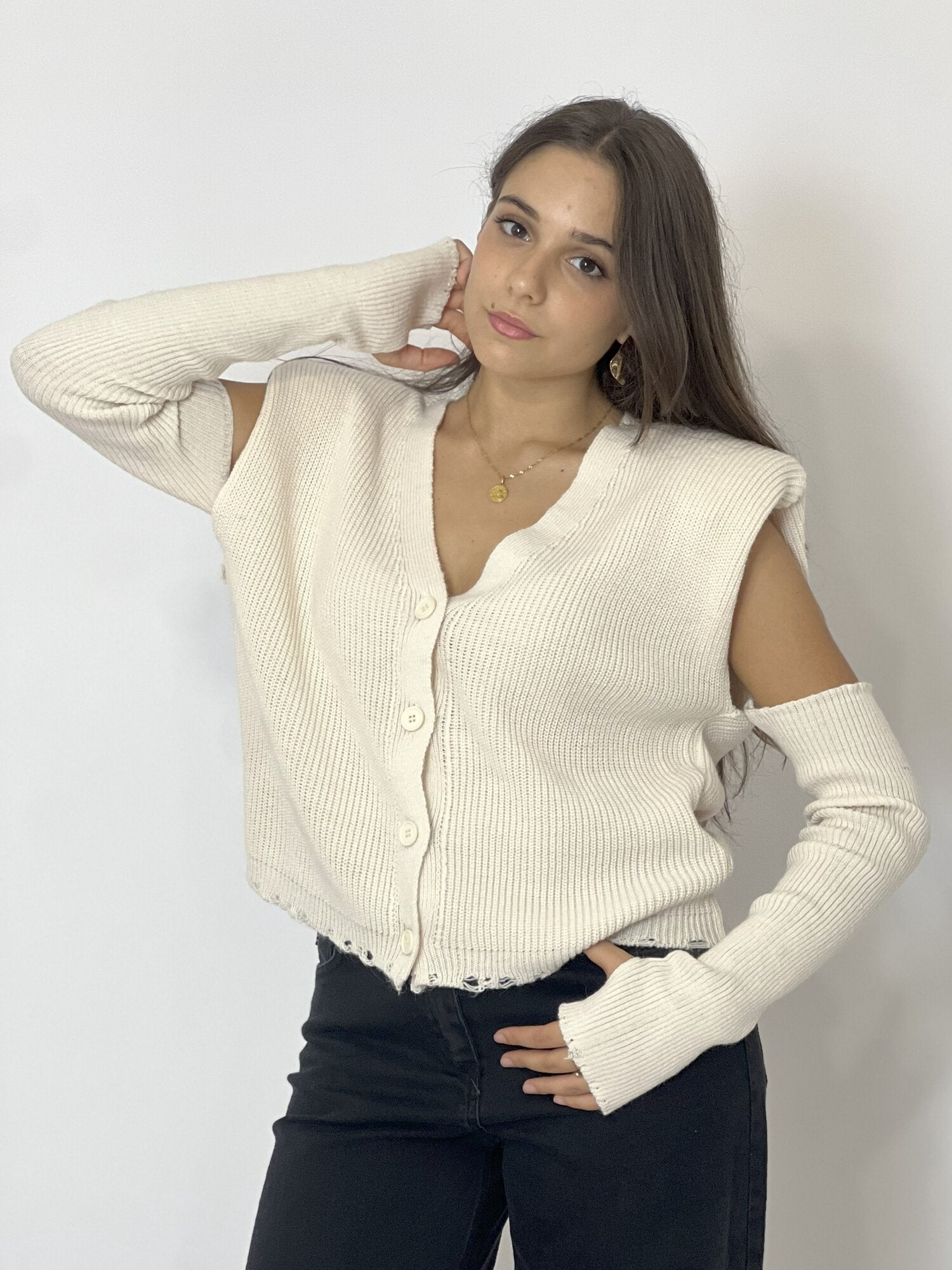 Gilet Manicotti Panna di Haveone. Gilet in maglia a costine con spalline imbottite e chiusura monopetto con bottoni. Scollo a V. Fondo effetto distressed. Manicotti a costine da indossare a guanto. Taglia unica. Disponibile in panna e beige.