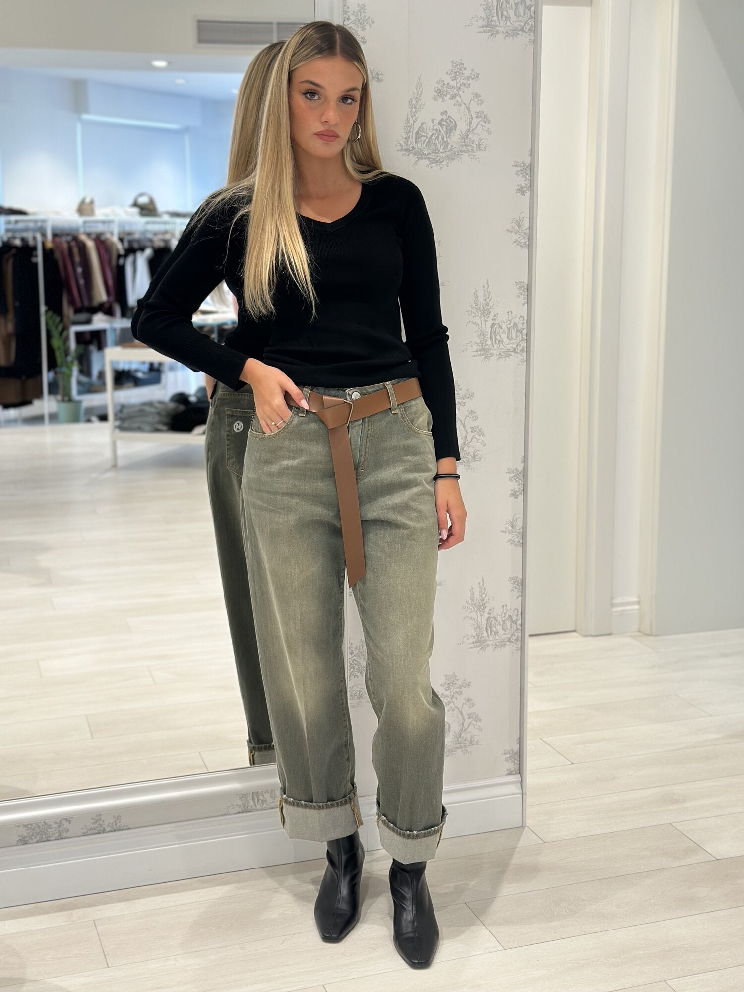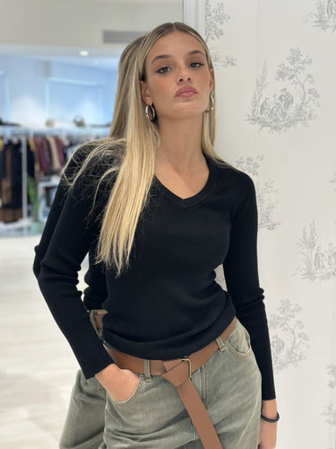 Maglia con scollo a V nera di Haveone. Maglia con scollo a V profondo e maniche lunghe. Vestibilità aderente. Tessuto a costine morbido ed elasticizzato. Disponibile nel colore panna e nero.