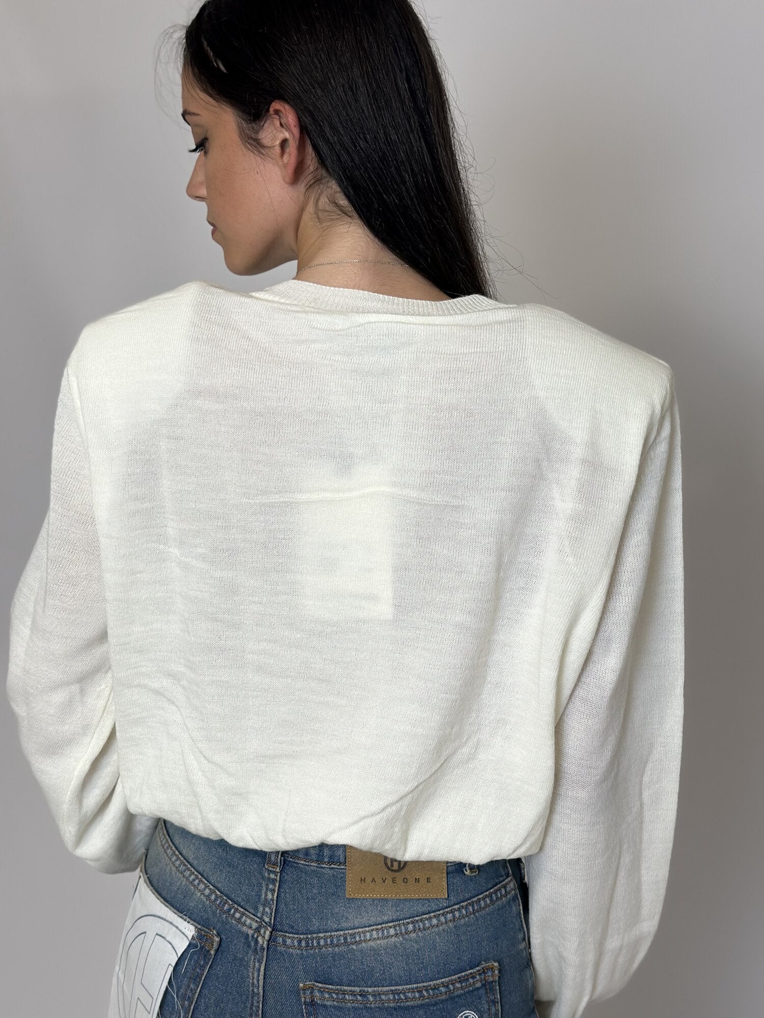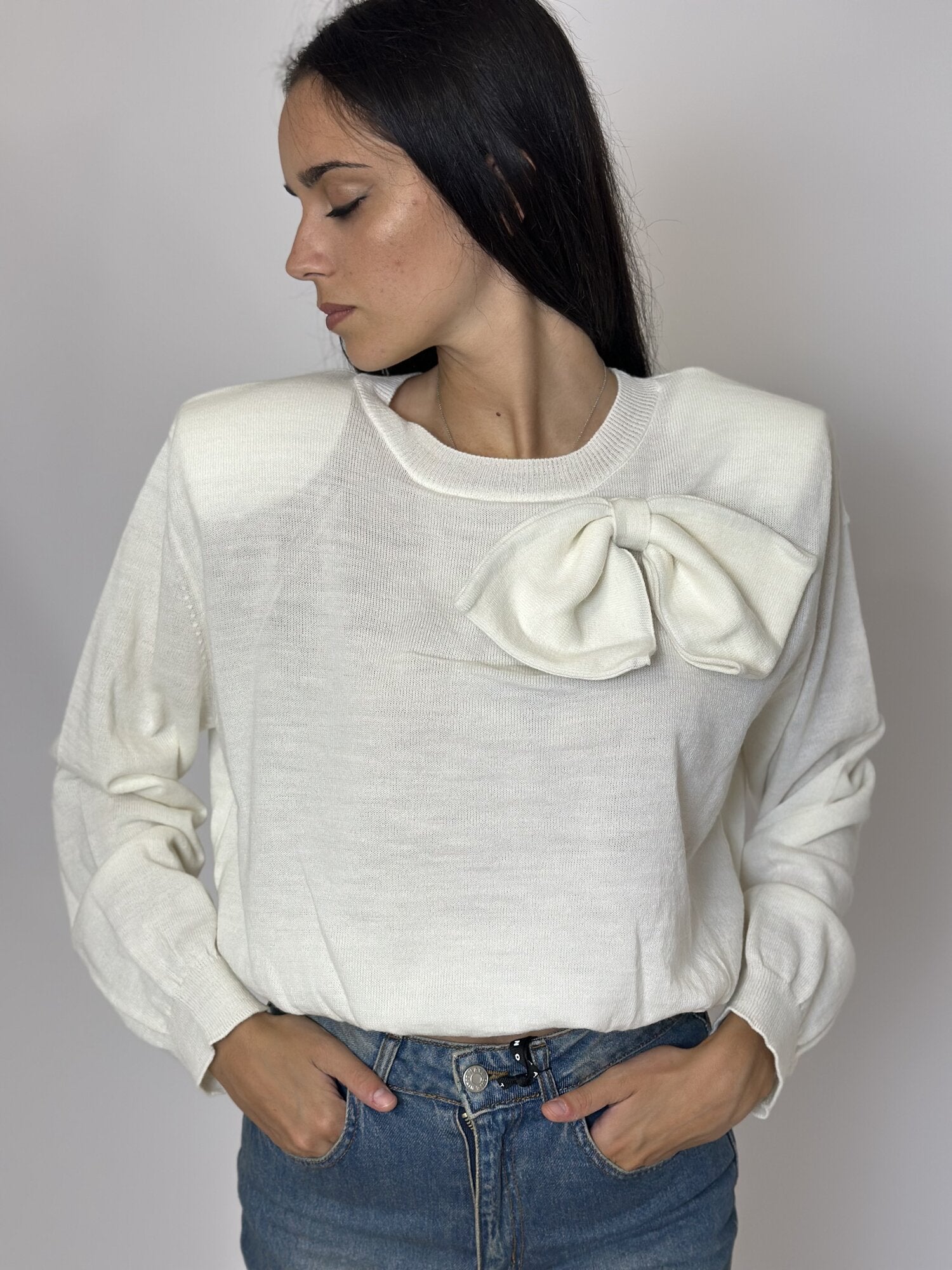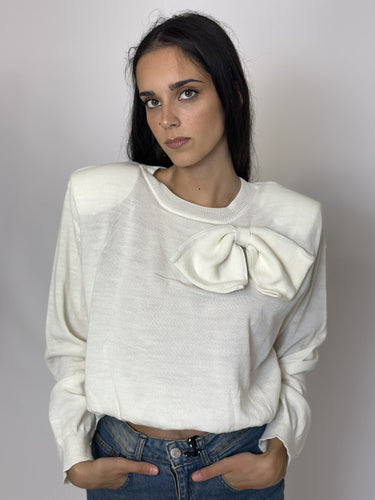 Maglia Palloncino Fiocco Panna di Haveone. Maglia a scatolina con elastico sul fondo, scollo girocollo e fiocco applicato sullo scollo in tessuto coordinato. Manica lunga. Taglia unica. Disponibile in bordeaux, panna e moro.