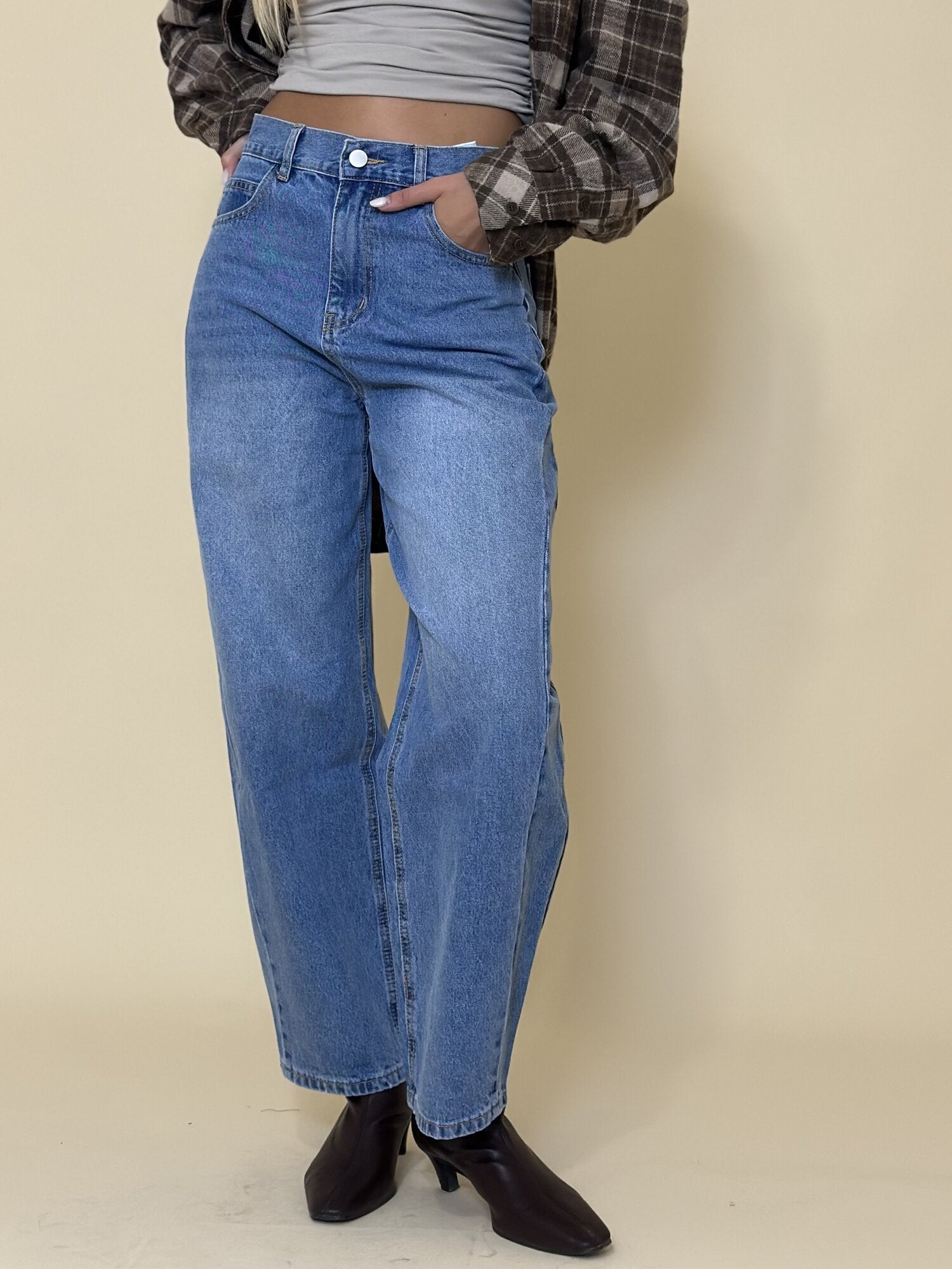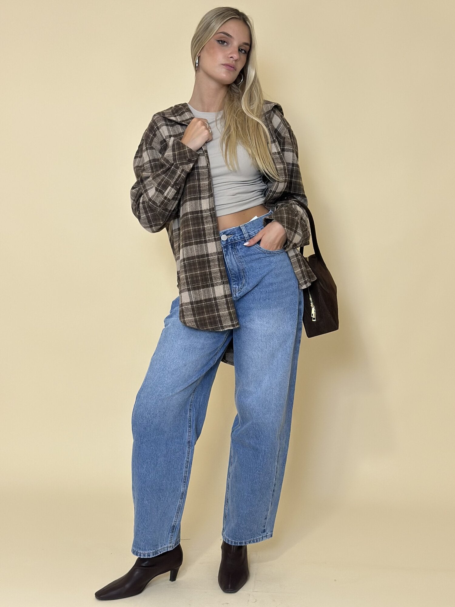 Jeans barrel Blu Denim di Eleh. Jeans a vita alta modello barrel leg 5 tasche. Passanti per cintura in vita e chiusura con bottoni. Disponibile in blu denim.